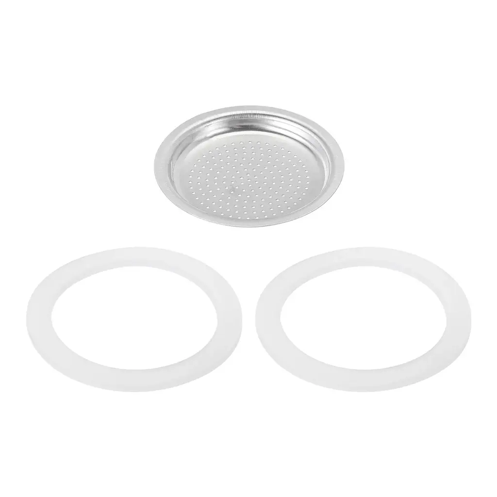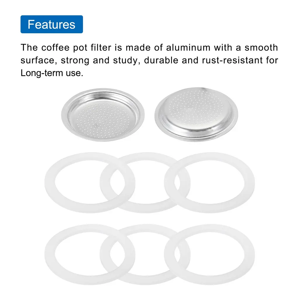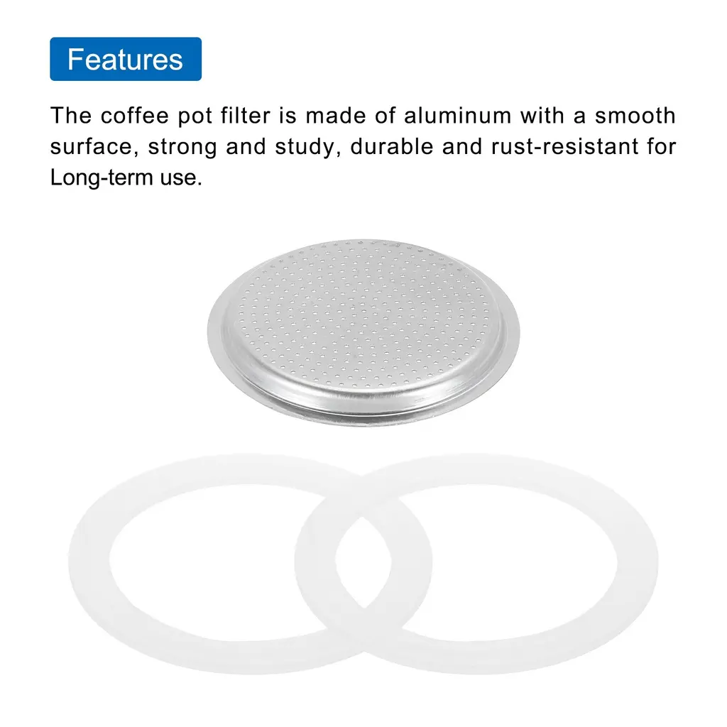 What is this?The espresso maker replacement filter is a critical accessory for the aluminum coffee pot, after a long time of daily use, the coffee pot old filter is important to replace a new one to extend the useful life of the potWhat will I get?The mocha pot filters,size: 50x41x5mm/1.97x1.61x0.2 inch(OD*ID*H);Type: Fit for 2-Cup use mocha coffee pot, Material:Aluminium;Color: Silver,Package Content(3PCS):1 × Aluminium Filter,2 x Seal Gaskets,Are there any advantages of the product?The coffee pot filter is made of aluminum with a smooth surface, strong and study, durable and rust-resistant for Long-term use.How to use it?Replace the old filter of your coffee machine with the filter you receive, easy to install and remove.What should I notice? Notes:The product is manual measurement, there is a little error, please refer to the actual product.