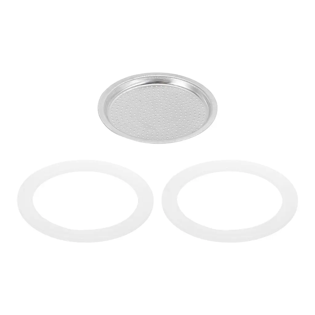 What is this?The espresso maker replacement filter is a critical accessory for the aluminum coffee pot, after a long time of daily use, the coffee pot old filter is important to replace a new one to extend the useful life of the potWhat will I get?The mocha pot filters,size: 56x49x4mm/2.2x1.93x0.16 inch(OD*ID*H);Type: Fit for 3-Cup use mocha coffee pot, Material:Aluminium;Color: Silver,Package Content(3PCS):1 × Aluminium Filter,2 x Seal Gaskets,Are there any advantages of the product?The coffee pot filter is made of aluminum with a smooth surface, strong and study, durable and rust-resistant for Long-term use.How to use it?Replace the old filter of your coffee machine with the filter you receive, easy to install and remove.What should I notice? Notes:The product is manual measurement, there is a little error, please refer to the actual product.