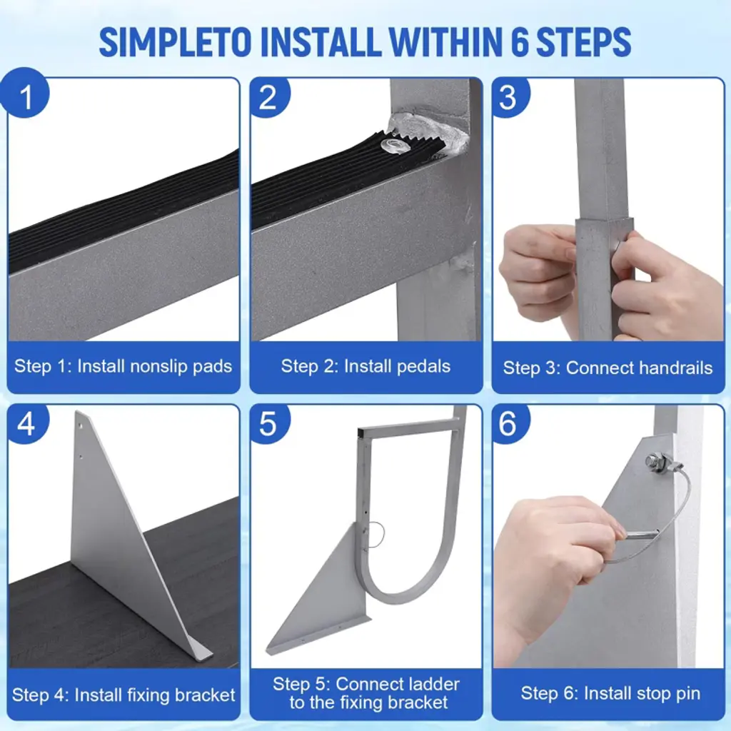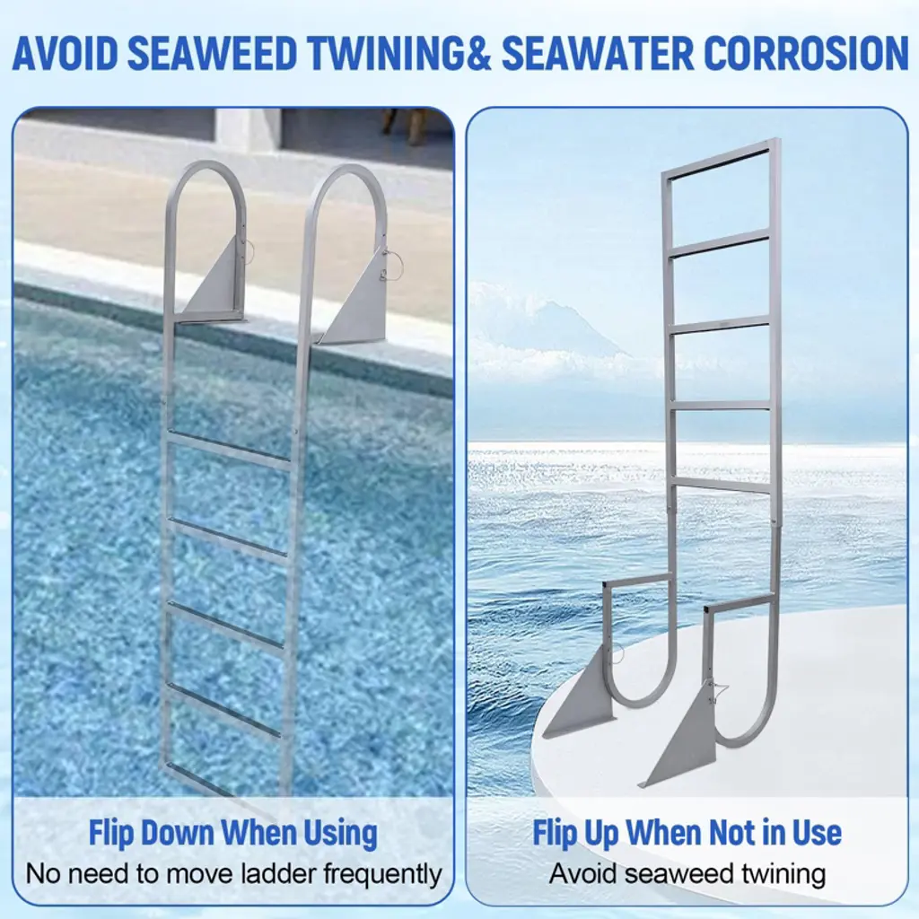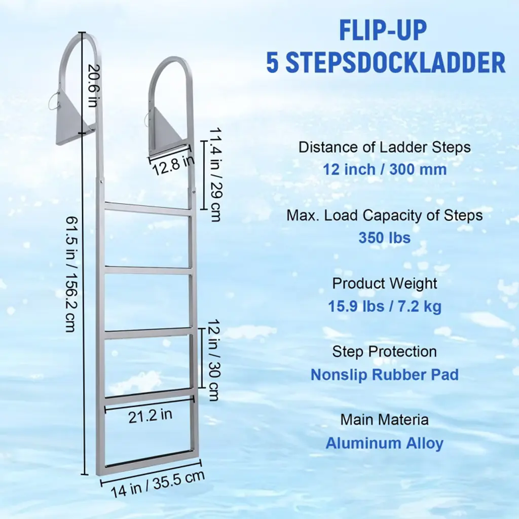 Aluminum Marine Dock Ladder with Flip-Up Design - Portable Boat LadderProduct Description:1. Heavy-Duty Marine-Grade ConstructionCrafted from premium thickened aluminum alloy, this marine dock ladder features exceptional corrosion and rust resistance for saltwater and freshwater environments. With a impressive 350-pound weight capacity and reinforced structural integrity, it ensures reliable long-term performance in demanding marine conditions.2. Convenient Flip-Up Design with Stainless Steel HardwareEquipped with premium stainless steel fittings and hinges that allow manual folding of the ladder when not in use. This innovative flip-up design keeps the ladder clear of water, preventing sludge accumulation, reducing marine growth, and minimizing corrosion for extended durability.3. Advanced Anti-Slip Safety StepsEach step features a specialized non-slip surface pattern that provides secure footing even when wet. The anti-slip design ensures safe and comfortable boarding from water to dock, preventing accidents and enhancing user confidence during both entry and exit from the water.4. Versatile Marine ApplicationsDesigned for multiple aquatic environments including marinas, boat docks, swimming platforms, and pool areas. The versatile construction makes it ideal for various water activities including swimming, boarding from tenders, and water sports access, providing reliable performance across different marine settings.5. Ergonomic User-Friendly DesignFeatures optimized 12-inch step spacing for comfortable climbing and reduced effort during water entry and exit. The thicker rounded handrails provide a secure two-handed grip, while the thoughtful design ensures smooth and effortless movement between water and dock level.?Specifications:? Material: Marine-Grade Aluminum Alloy? Color: White? Dimensions: 14"W x 61.5"H? Step Spacing: 12 inches? Weight Capacity: 350 lbs? Special Feature: Portable Flip-Up Design? Hardware: Stainless Steel Fittings? Applications: Marinas, docks, swimming pools, marine boarding? Safety Features: Anti-slip steps, rounded handrails? Environment: Saltwater and freshwater resistant