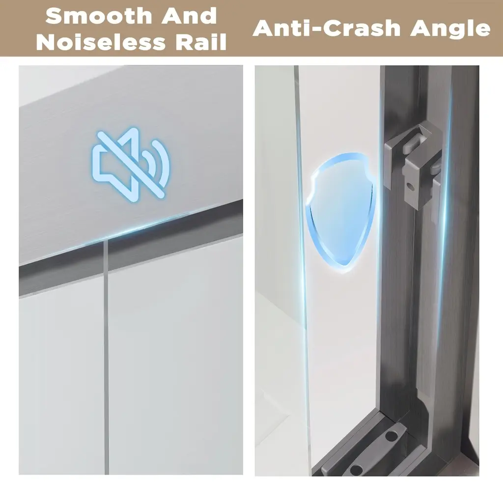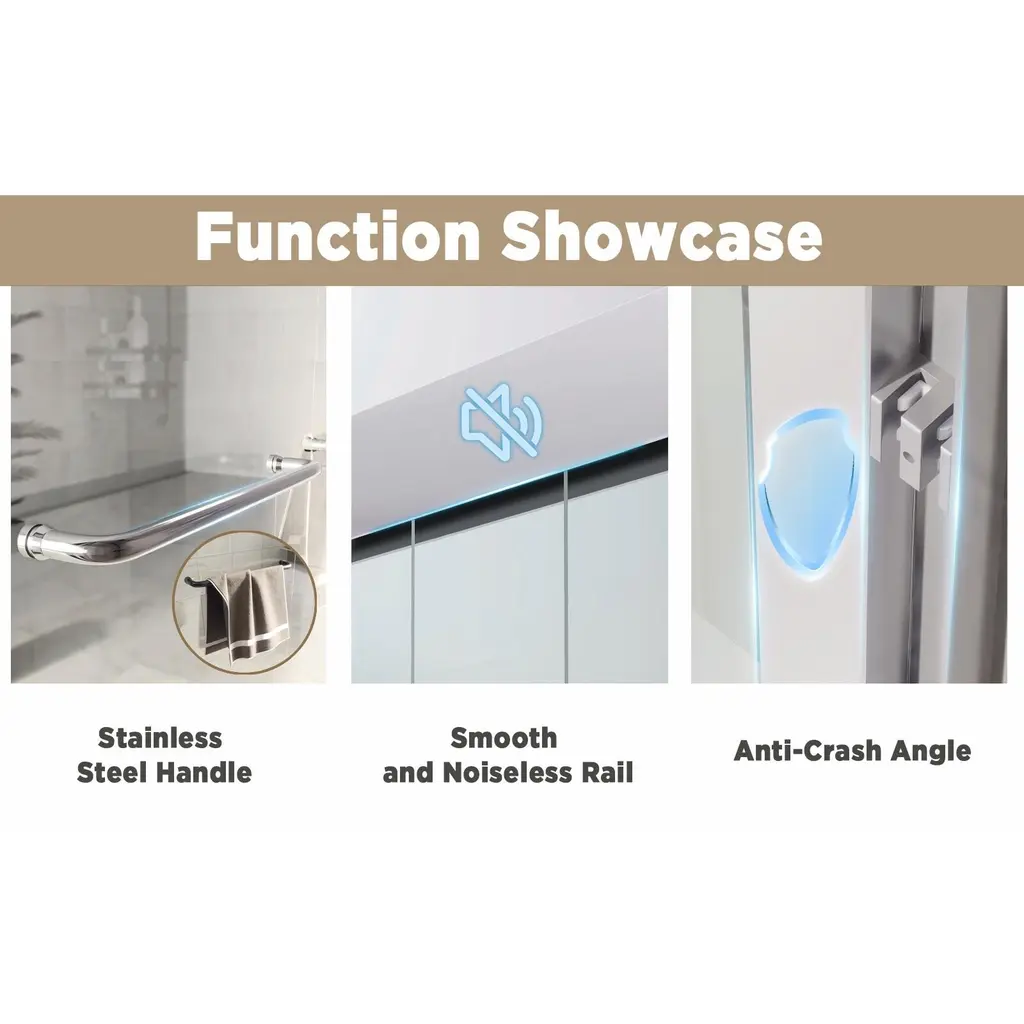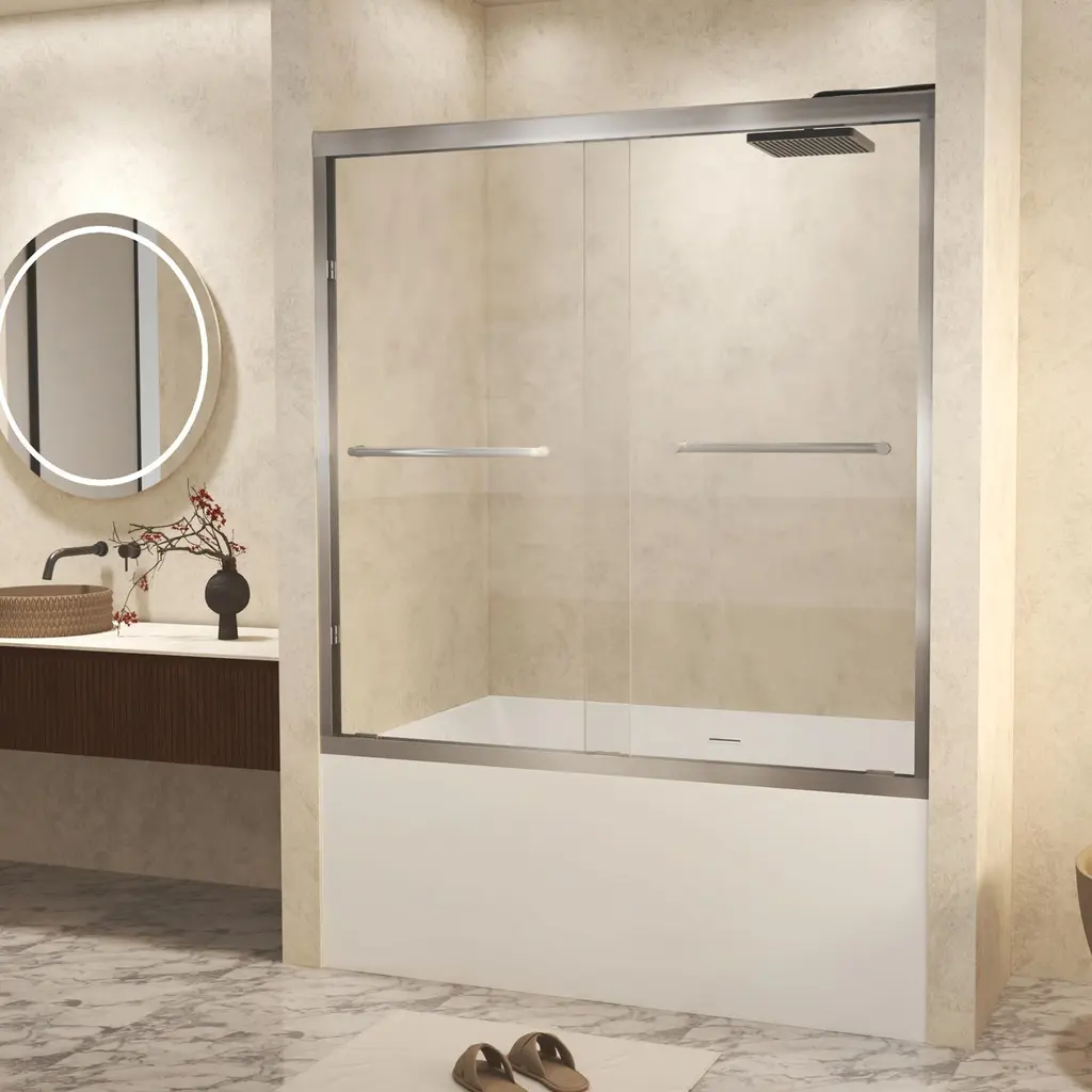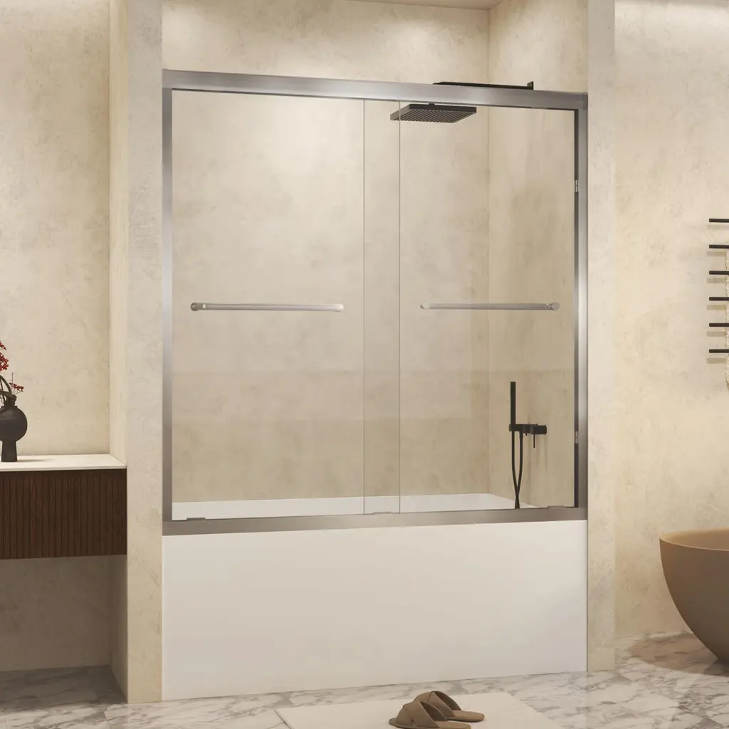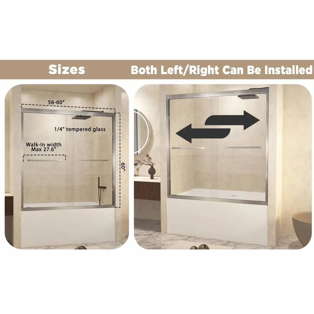 Aluminum Frame Double Sliding Shower Door, 56-60" X 60", Explosion-Proof Tempered Glass 1/4" & Stainless Steel Handle - Brushed Nickel