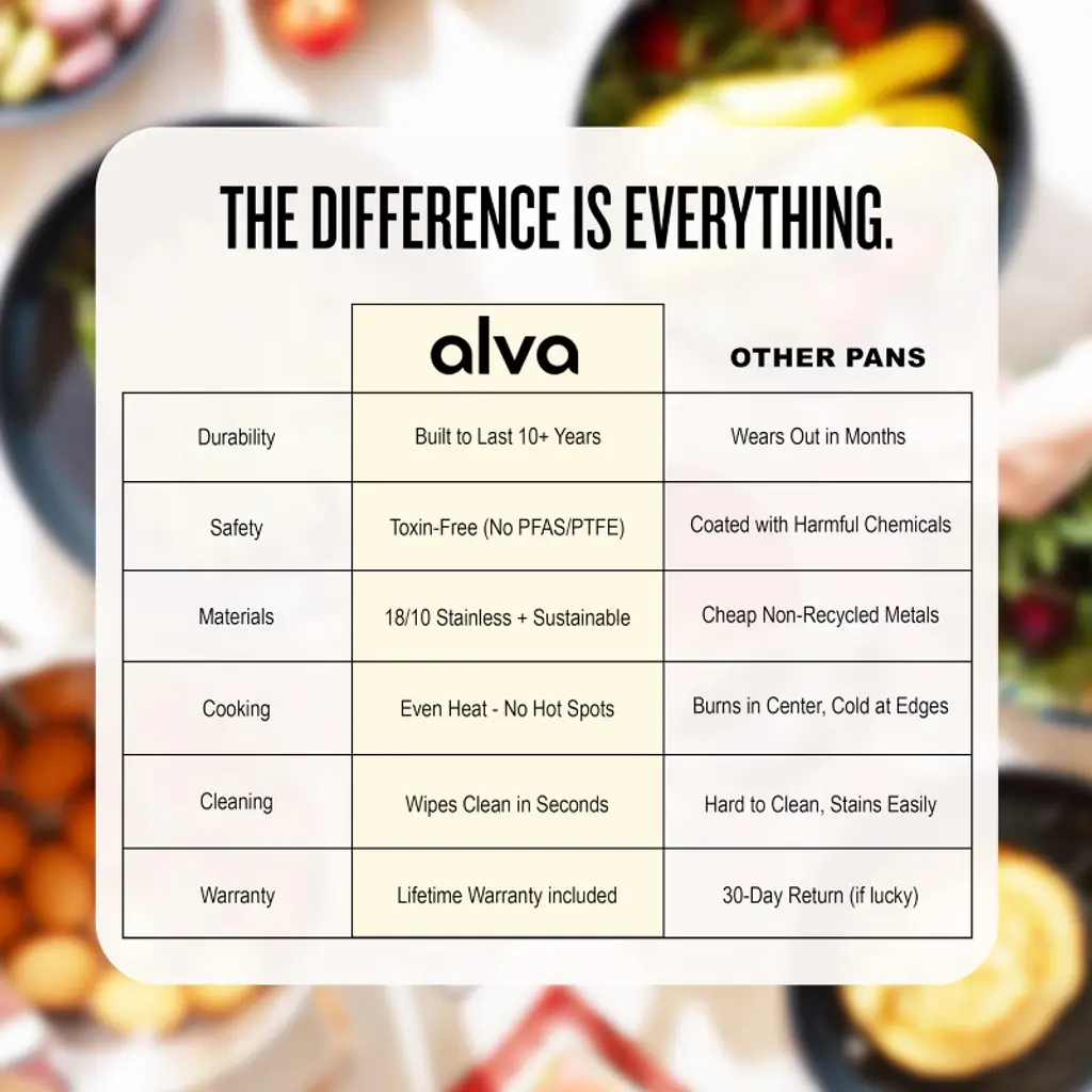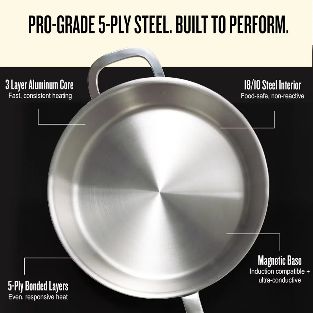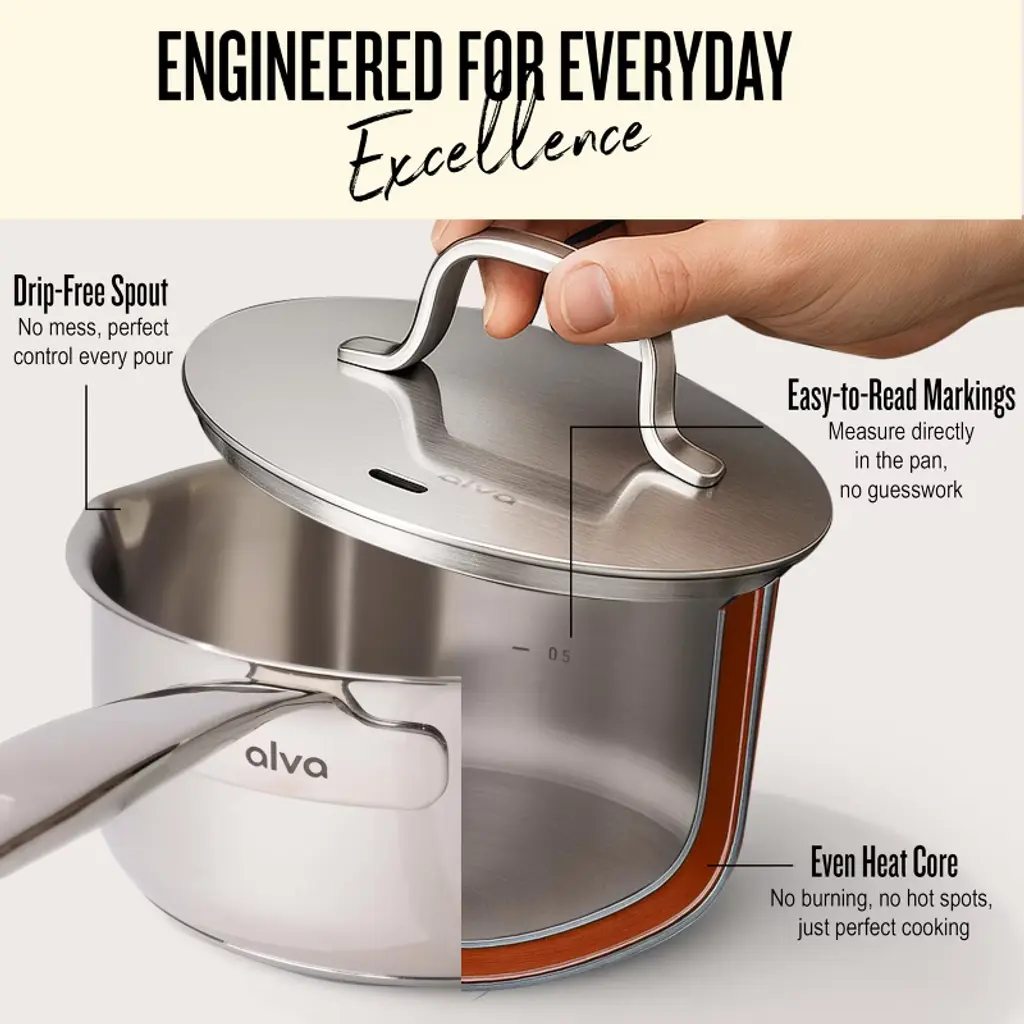 The Alva Maestro 9 Piece Stainless Steel Cookware Set is designed for serious home chefs, featuring non-toxic, oven-safe, and induction-compatible pots and pans. Its 5-ply construction ensures even heat distribution, eliminating hot spots for perfect cooking. This versatile set includes various sizes for frying, sautéing, and boiling. Durable materials withstand daily use without warping, while the non-reactive stainless steel interior makes cleaning quick and easy, delivering professional-grade performance.