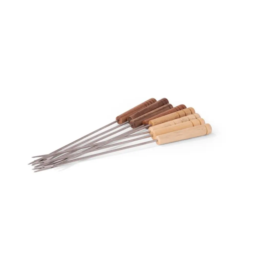Black cast iron sculpts a timeless fondue set designed to last. Finished with a double layer of scratch-resistant enamel, the double-handled pot is elevated over a mirror-finished chrome burner to evenly melt chocolate and cheese or heat oil. The vented burner adjusts airflow to control temperature, and a splash guard prevents splattering when cooking vegetables, fish or meat in oil. Eight stainless steel forks fitted with acacia wood handles make this charming set perfect for parties.