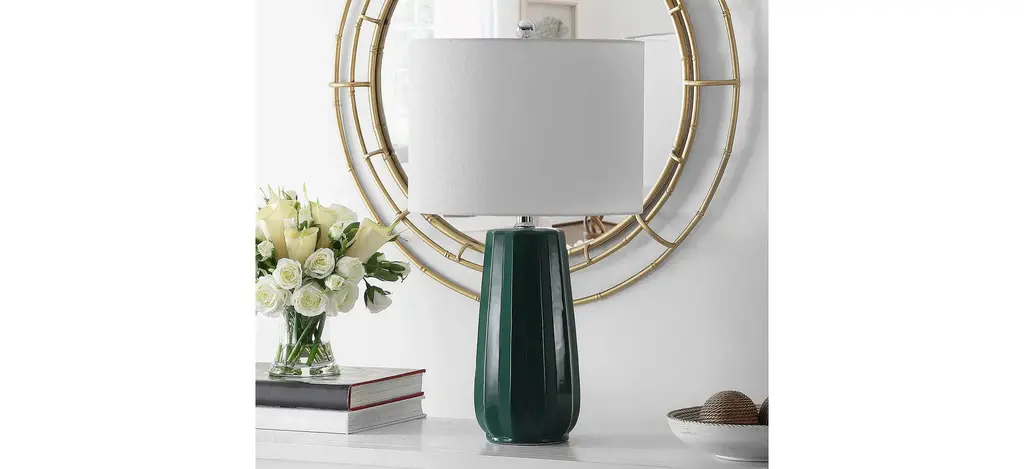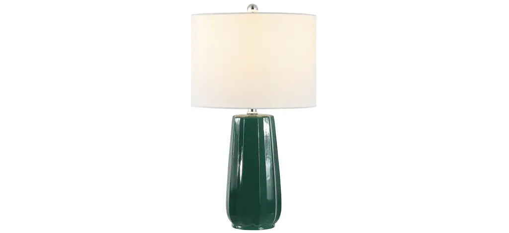 Bring modern chic to your d_cor with this striking Alva Table Lamp. Alva's glossy dark green ceramic flaunts subtly defined panels that emanate a rich sense of movement, and a classic white drum shade completes the look.