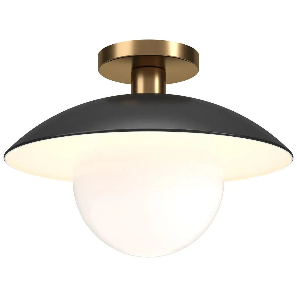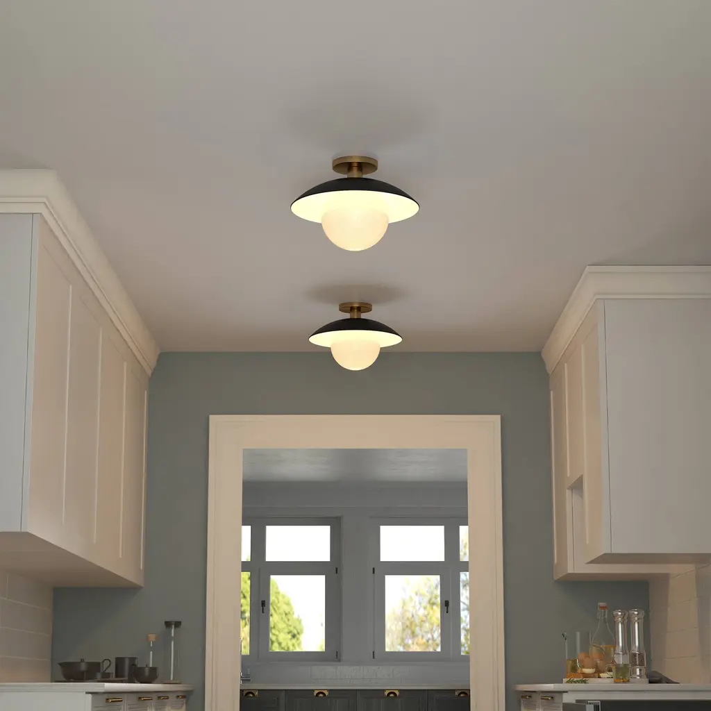 Timeless and elegant, this semi flush mount ceiling light creates a classic look in your entranceway, hallway, or dining room. Styled with a hint of a retro inspiration, this fixture remains thoroughly modern with on-trend finishes. The enclosed white milk glass shade diffuses light against the inner white finish of the metal overhang, creating ample yet gentle light throughout your space without a glare.