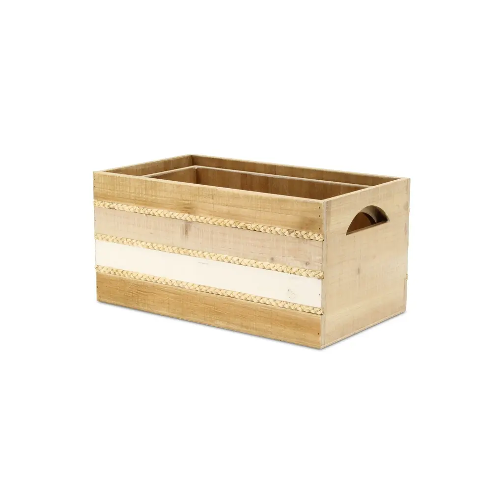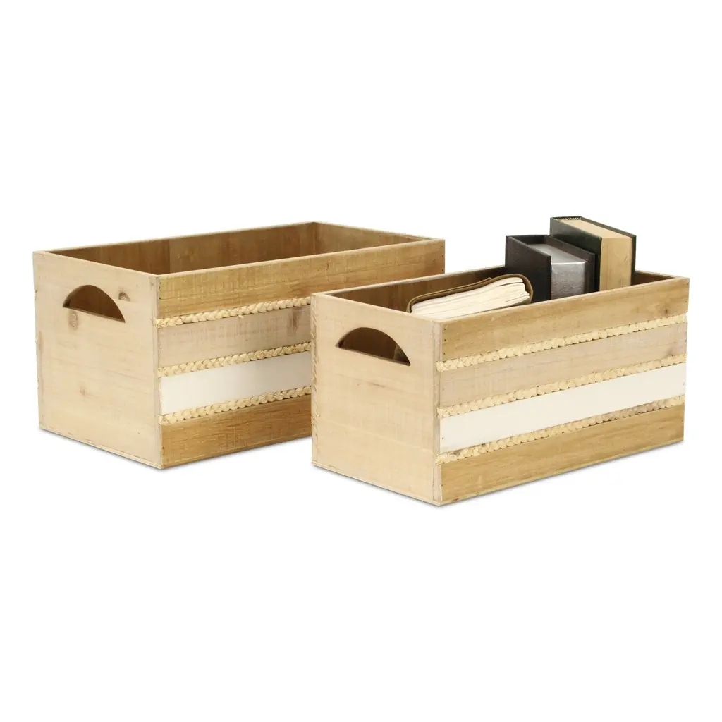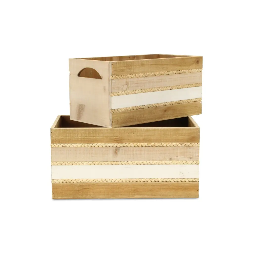Details: Iconic, natural and homey, crates have eased their way into farmhouse, cottage and natural themed living spaces. This crate piece features a wood panel design with woven accents, all in a multi-color natural appearance. Accent your living space with a piece that is both functional and decorative. Features: - An entirely handmade and hand crafted design- Fully assembled and ready for use, simply unbox and enjoy! - This piece features a stylish and functional blend of wood and rope materials - Arrives as a nested set of 2 sizes, large and small - Made with a multicolor finish and accented rope bands - Lg: L: 16.5"" x W: 9.5"" x H: 8"" - Sm: L: 14.75"" x W: 7.75"" x H: 7.25"" - Lg Interior: L: 15.5"" x W: 8.5"" x H: 7.75"" - Sm Interior: L: 14"" x W: 7"" x H: 7"" - Wood Thickness: 0.25"" - Rope thickness: 0.25"" - Weight: 7 lbs - SKU: 5881-2