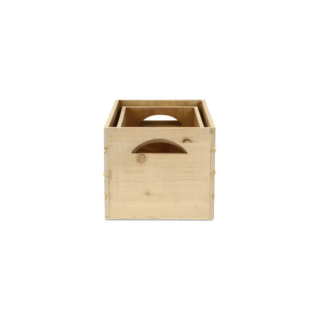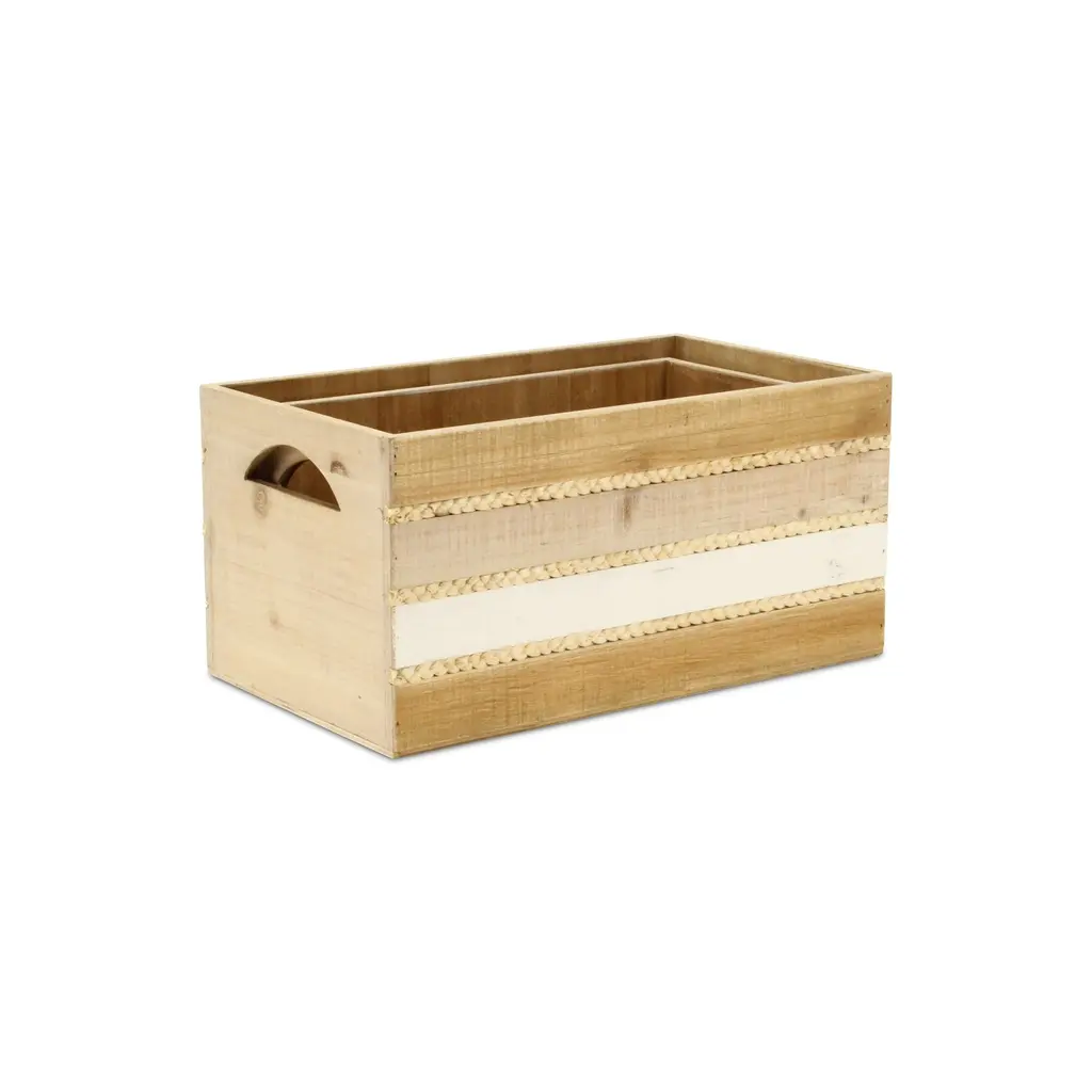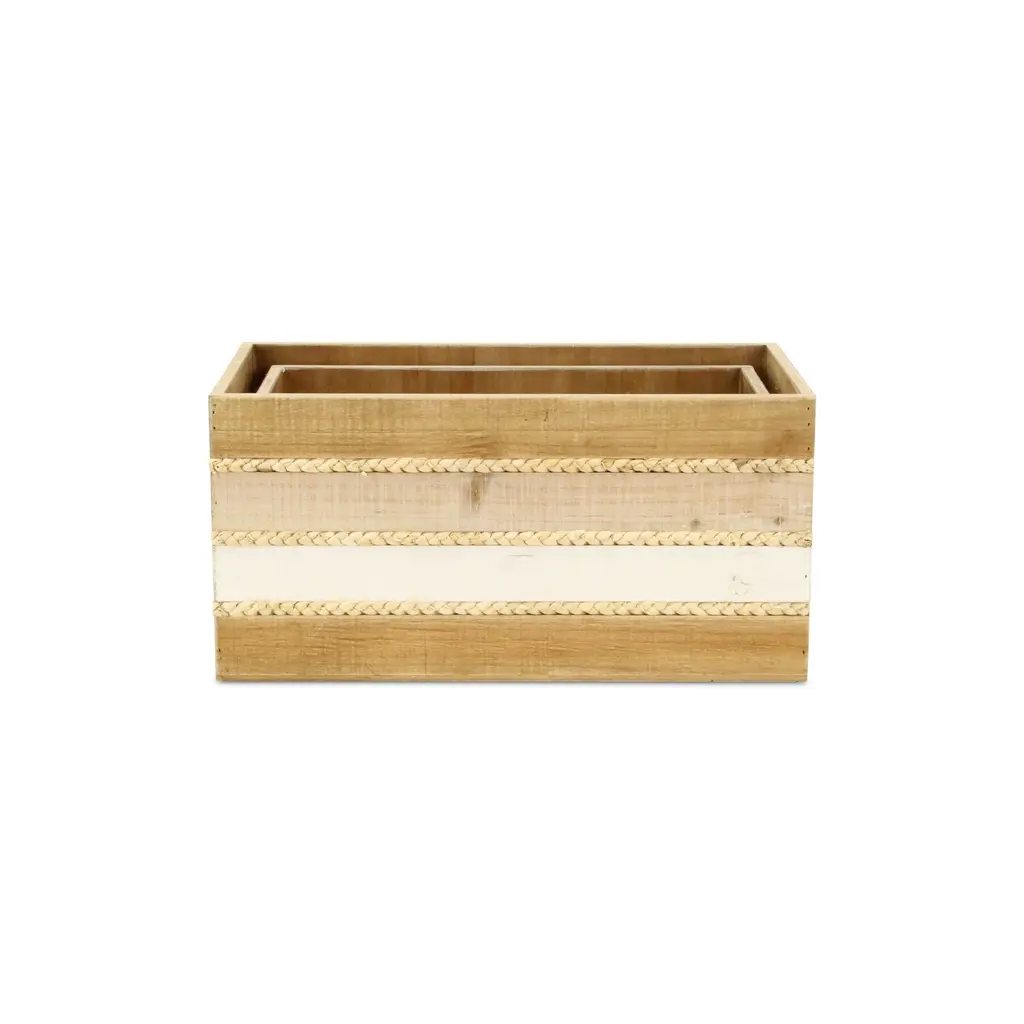 Details: Iconic, natural and homey, crates have eased their way into farmhouse, cottage and natural themed living spaces. This crate piece features a wood panel design with woven accents, all in a multi-color natural appearance. Accent your living space with a piece that is both functional and decorative. Features: - An entirely handmade and hand crafted design- Fully assembled and ready for use, simply unbox and enjoy! - This piece features a stylish and functional blend of wood and rope materials - Arrives as a nested set of 2 sizes, large and small - Made with a multicolor finish and accented rope bands - Lg: L: 16.5"" x W: 9.5"" x H: 8"" - Sm: L: 14.75"" x W: 7.75"" x H: 7.25"" - Lg Interior: L: 15.5"" x W: 8.5"" x H: 7.75"" - Sm Interior: L: 14"" x W: 7"" x H: 7"" - Wood Thickness: 0.25"" - Rope thickness: 0.25"" - Weight: 7 lbs - SKU: 5881-2