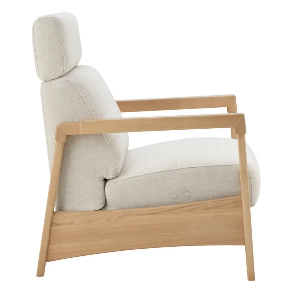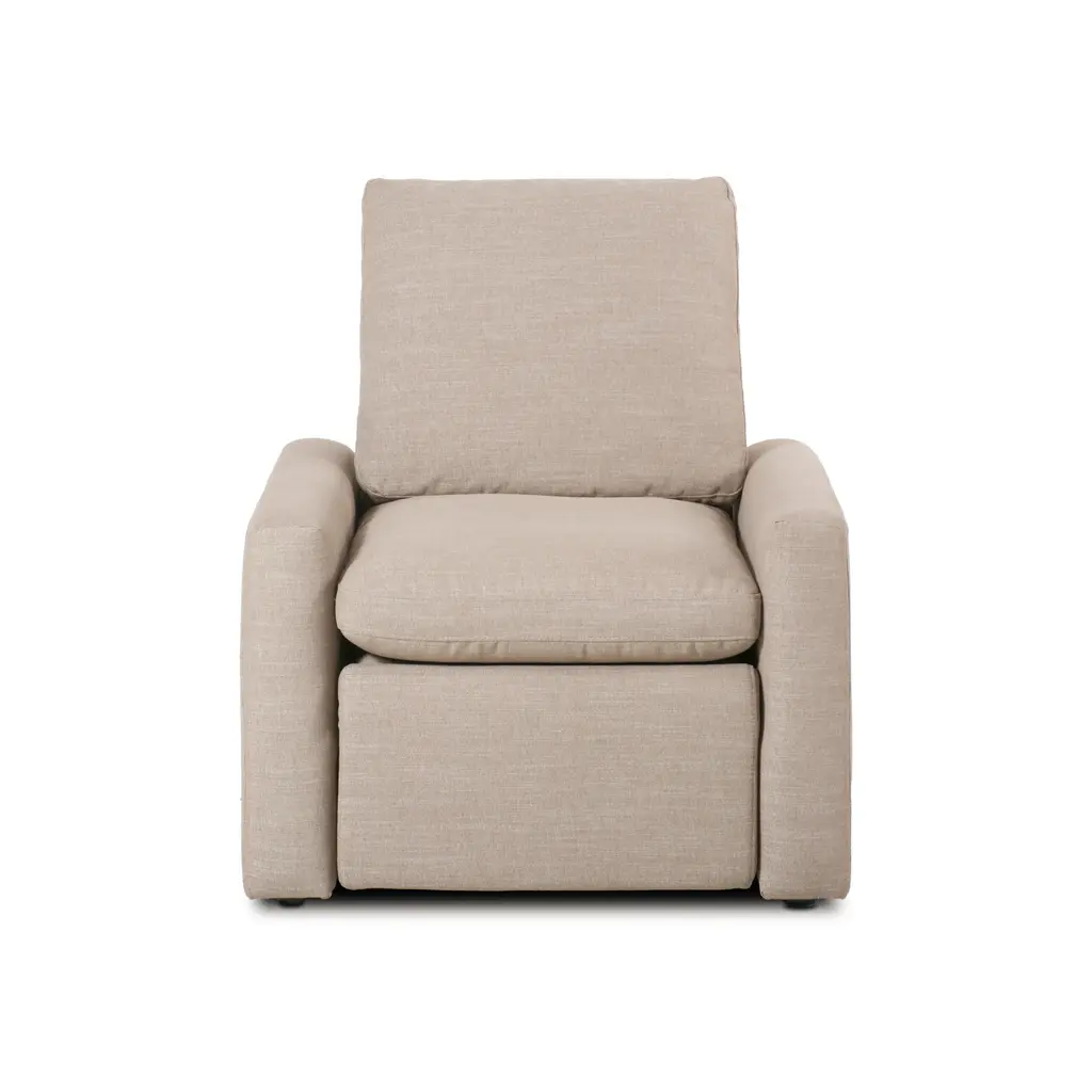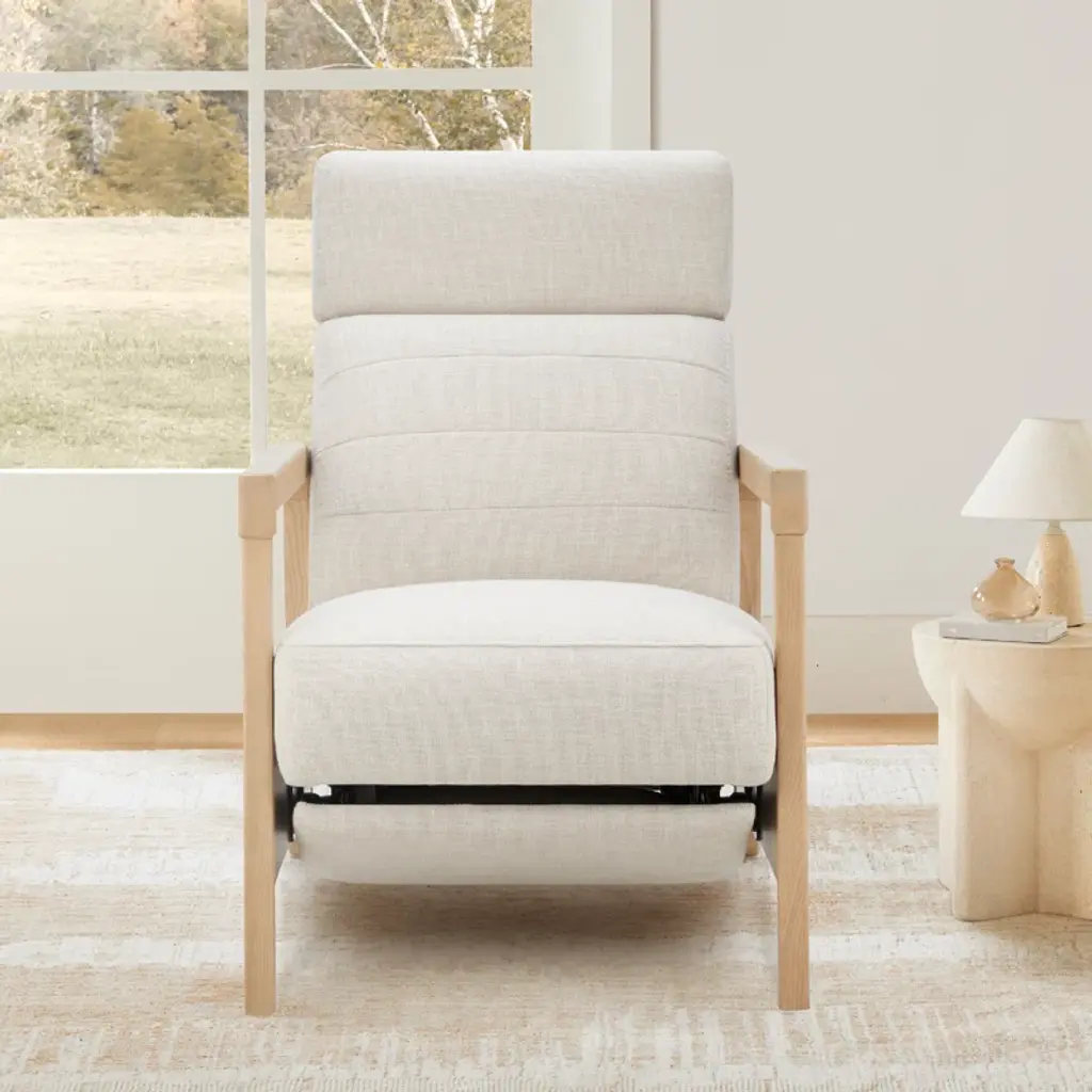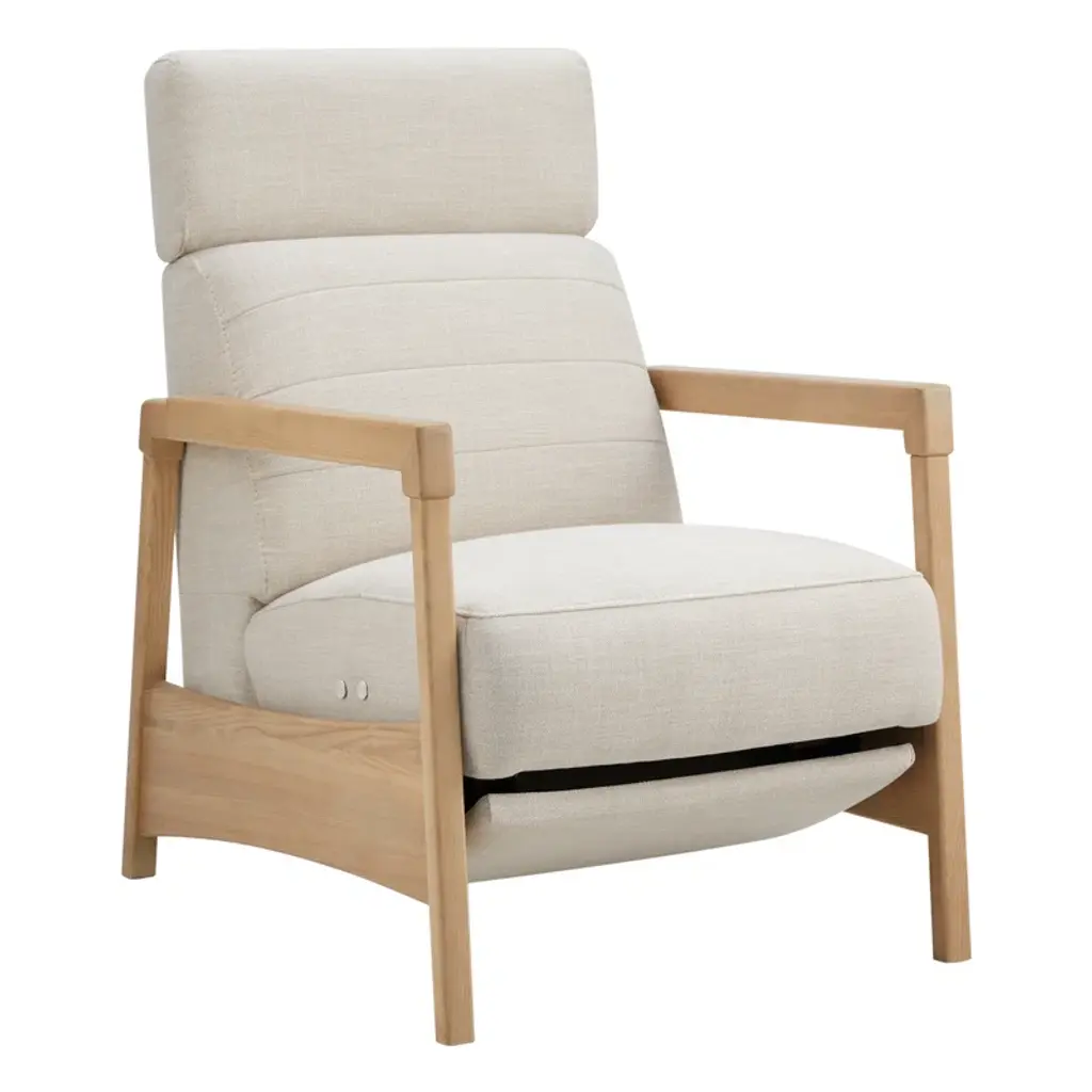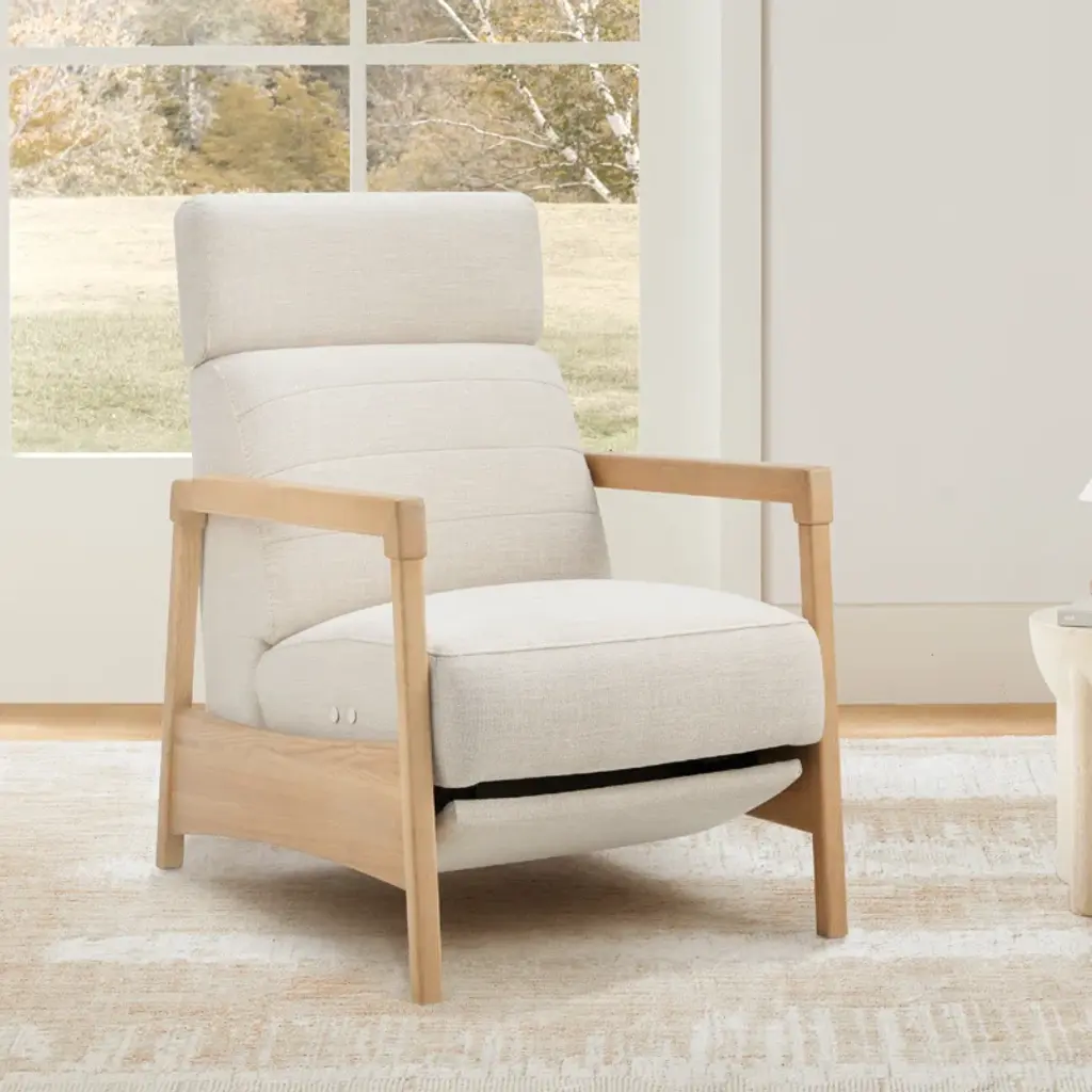 "Lean back in luxury!" This power recliner is built with kiln-dried wood and utilizes mortise and tenon joinery for maximum durability. Showcasing a sleek silhouette with its exposed wood frame and upholstered fabric, it's a perfect blend of modern charm and comfort. A push of a button lets you kick up your feet and recline, while the ratcheted headrest adjusts to your needs. Plus, its foam-filled cushions provide just the right balance of softness and support. Here's to your next cozy night in!