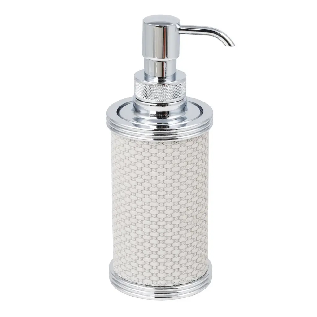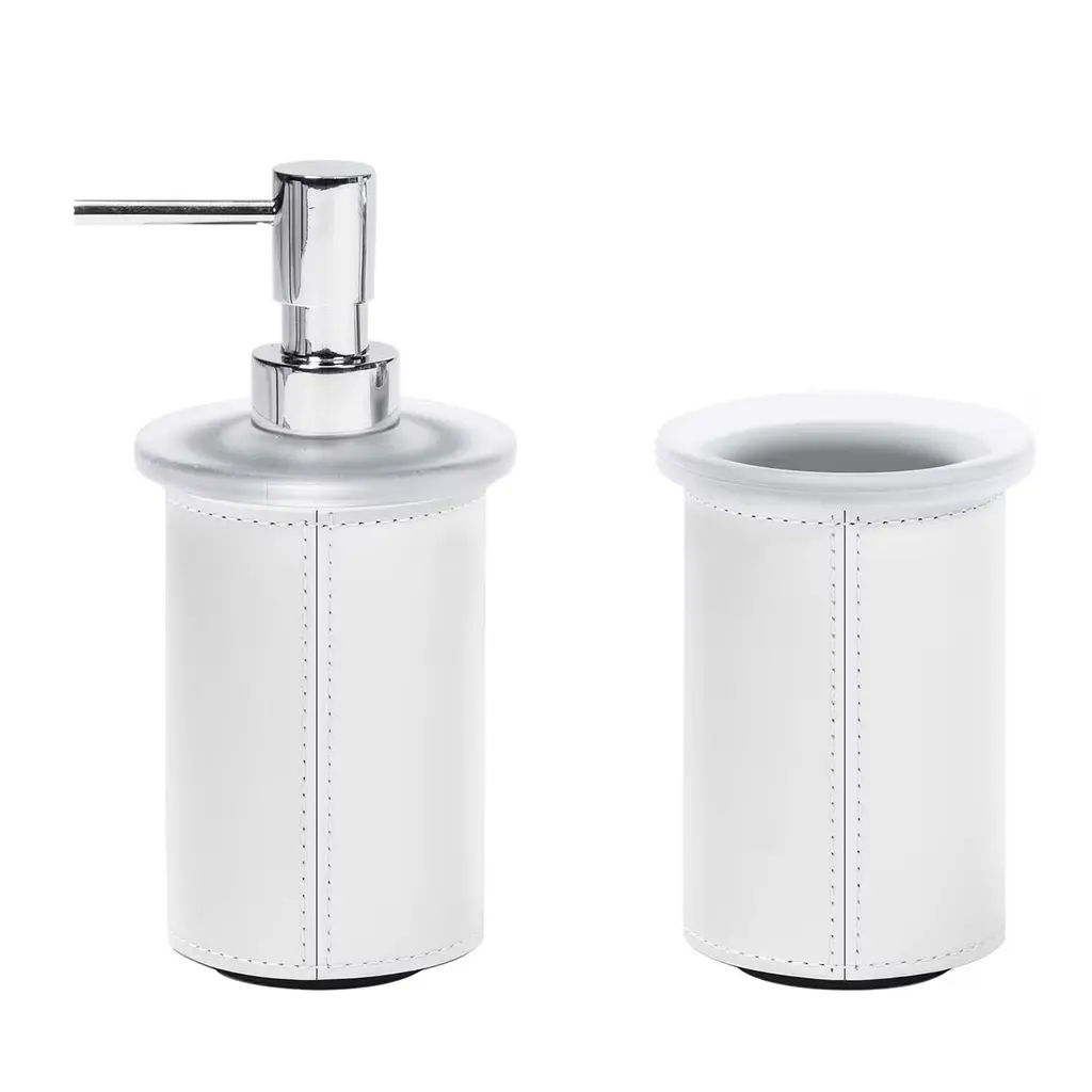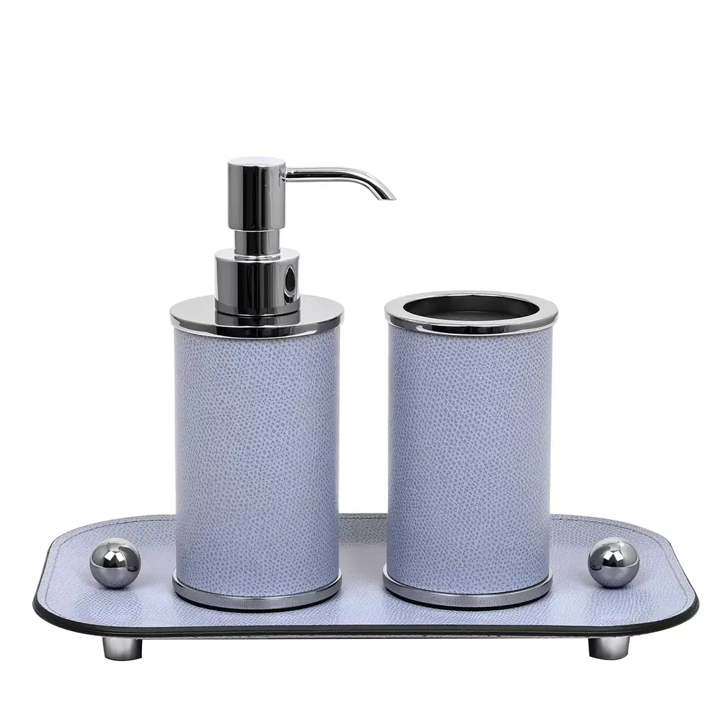 This luxurious bathroom set is made up of a soap dispenser and a toothbrush holder and two boxes, in two different sizes. All objects, are made in solid brass with a non-slip and waterproof rubber base. Each item is lined outside with leather that can be customized in color and texture. An elegant addition to a Classic bathroom, this set will instantly enrich the room with its sophisticated charm and exquisite craftsmanship.