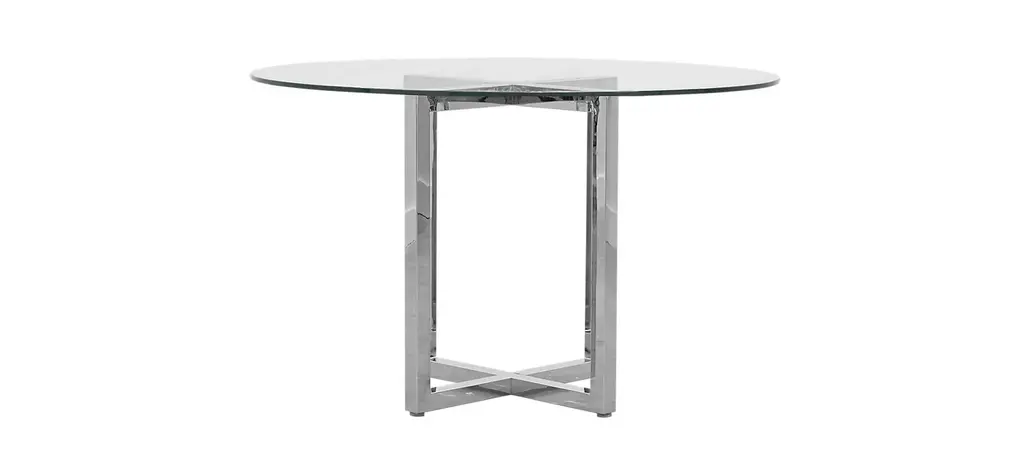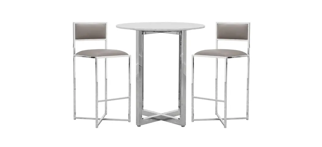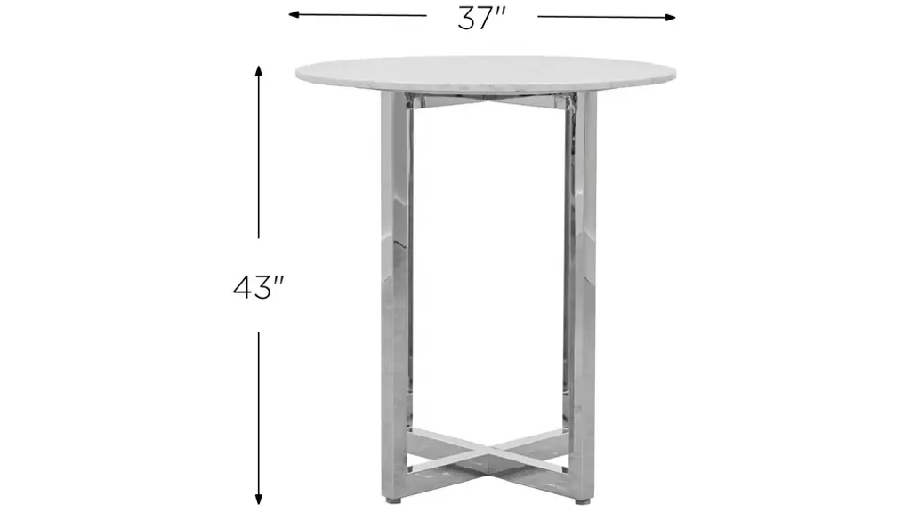 Exceptional from top to bottom, the Amalfi Marble Bar Height Dining Table features traces of natural veining, ensuring each piece is unique. One-piece metal base is hand-cut and welded from tubular stainless steel for durability and chrome-plated for a mirror finish. Legs are fitted with non-marking nylon glides.