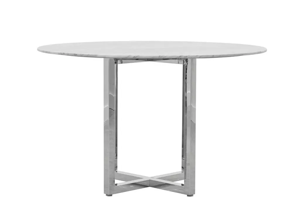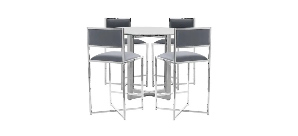 Exceptional from top to bottom, the Amalfi Marble Pub Table features traces of natural veining, ensuring each piece is unique. One-piece metal base is hand-cut and welded from tubular stainless steel for durability and chrome-plated for a mirror finish. Legs are fitted with non-marking nylon glides.
