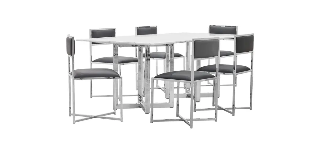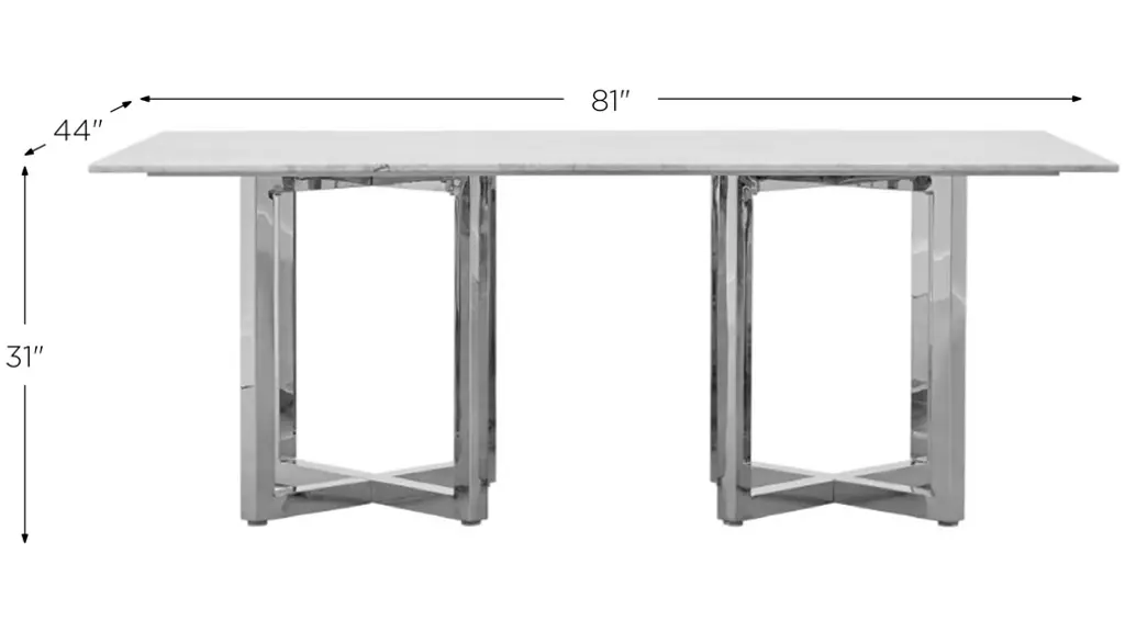 Exceptional from top to bottom, the Amalfi Marble Double Pedestal Dining Table features traces of natural veining, ensuring each piece is unique. One-piece metal base is hand-cut and welded from tubular stainless steel for durability and chrome-plated for a mirror finish. Legs are fitted with non-marking nylon glides.