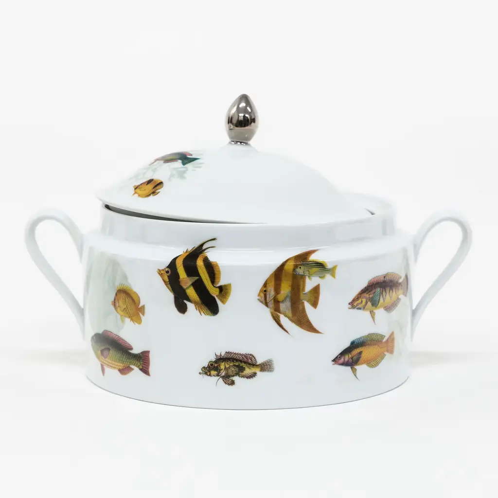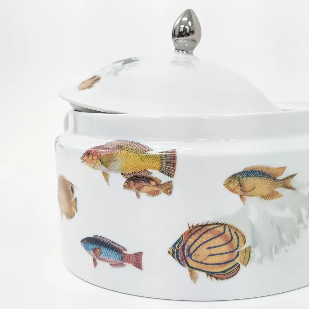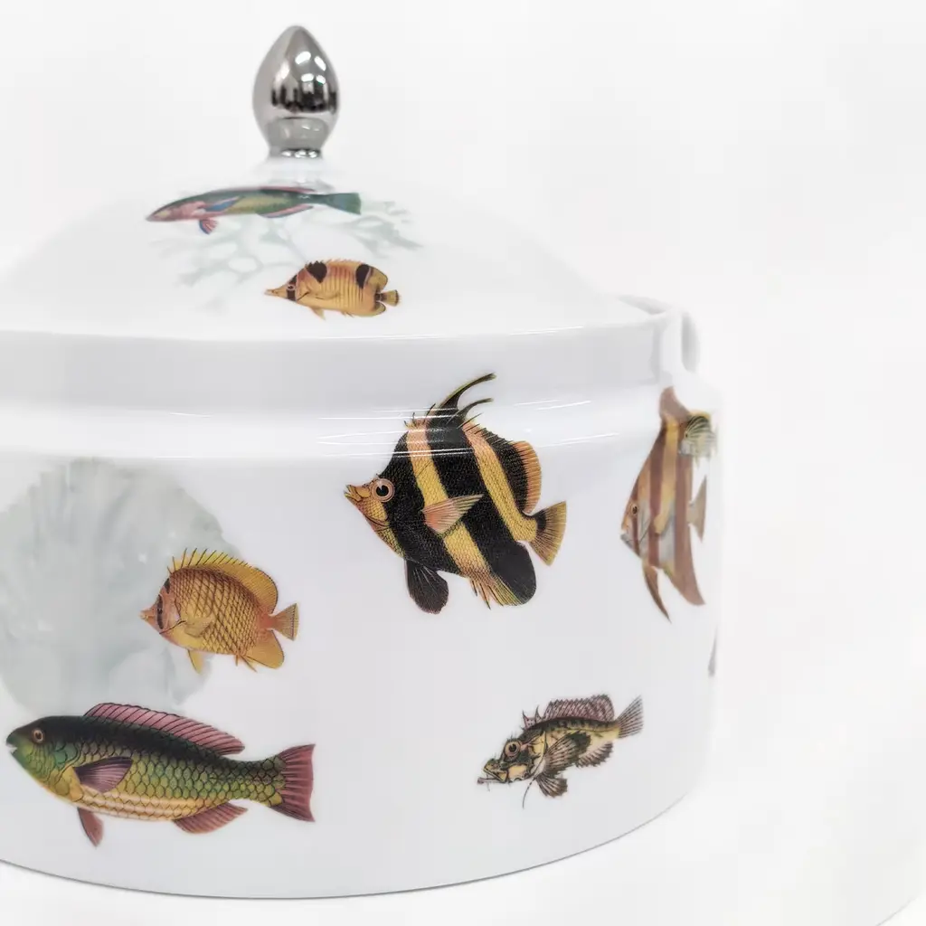 A lively and charming addition to a modern and sophisticated table, this soup bowl is part of the Amami Islands series dedicated to the Japanese archipelago. Enriched with a colorful decoration of red and blue tropical fish painted by hand, it is exquisitely handcrafted of fine porcelain.