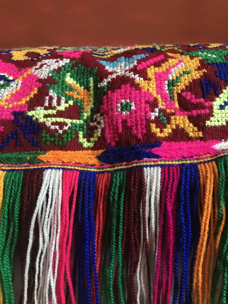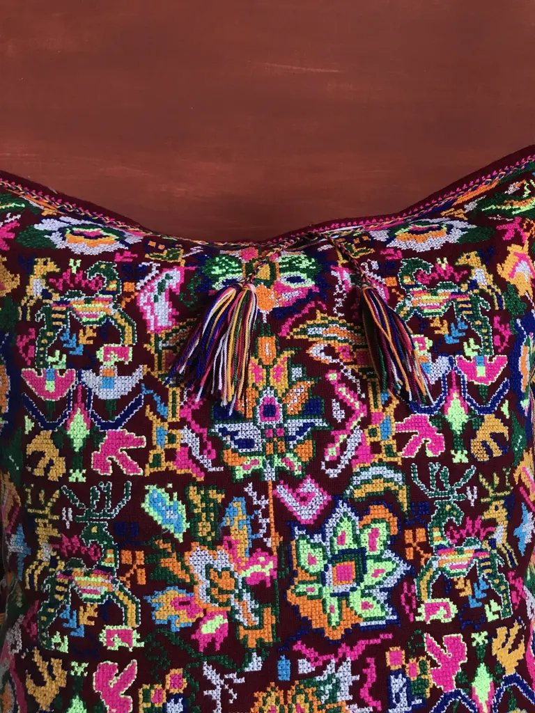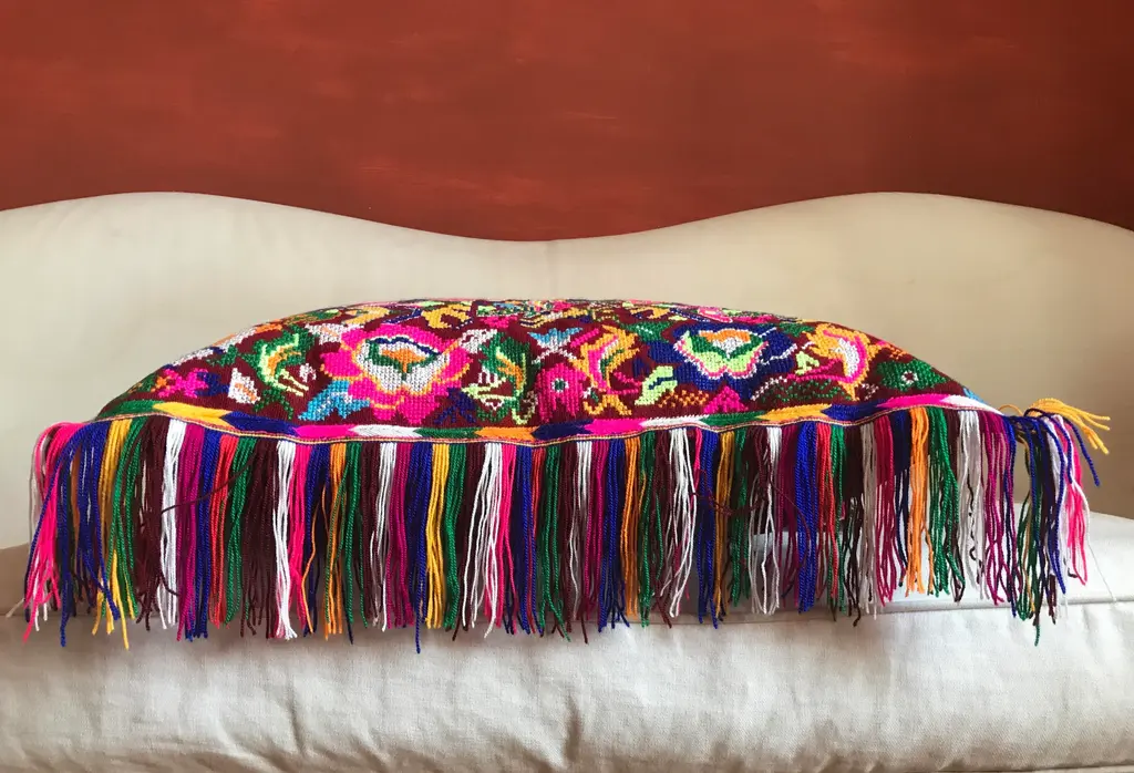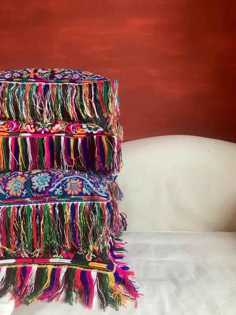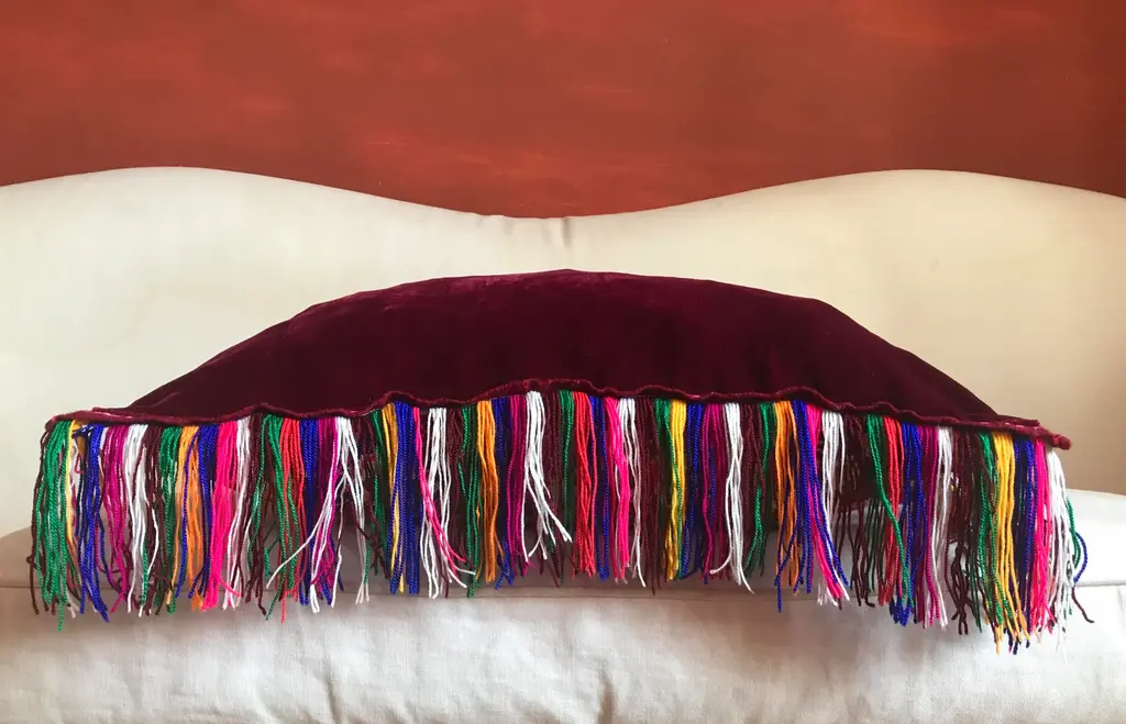 This is a unique and authentic piece inspired by the poetry and dance of colours, textures and materials from the Macedonian folklore. It features original handcrafted textile made between the 18th and 19th century by Macedonian women as pieces of clothes worn on ceremonies, weddings and all celebrations. The front of every piece is individually handwoven, richly hand-dyed using all natural pigments, and hand knotted with multicolored embroidery whereas some panels are joined together and embroidered with a rustic stitch. On the back side you'll meet the finest elegance of Italian fabrics like velvet, wool, cotton. This piece is an amalgam of ingredients from customs and countries with a strong influence of cross-cultural design, where 'East meets West'. Labeled by Maker,Labeled by Maker