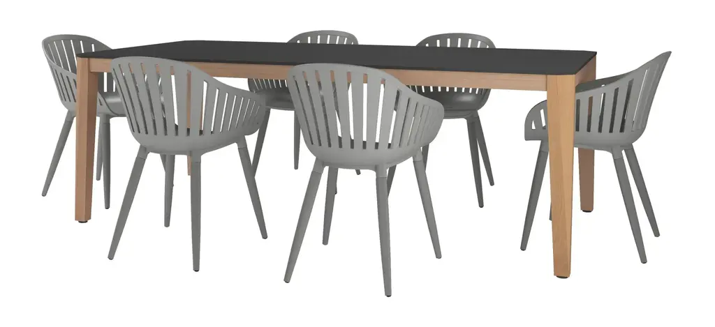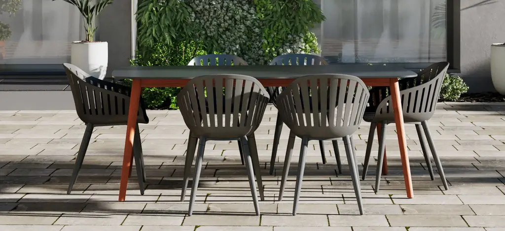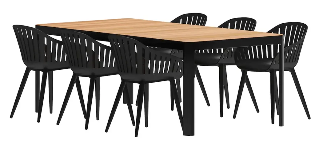 Amazonia outdoor 7-pc. rectangular patio dining table set focuses on contemporary and modern design, comfort, and maintaining the durability of each piece. This patio set is crafted to enhance your outdoor areas with modern lines and colors. Wood materials are made of 100% FSC certified eucalyptus with premium finishes and certified high-quality teak wood. Also includes materials that are perfect for outdoors because of their durability and weather resistance. Immerse yourself in the Amazonia patio set.