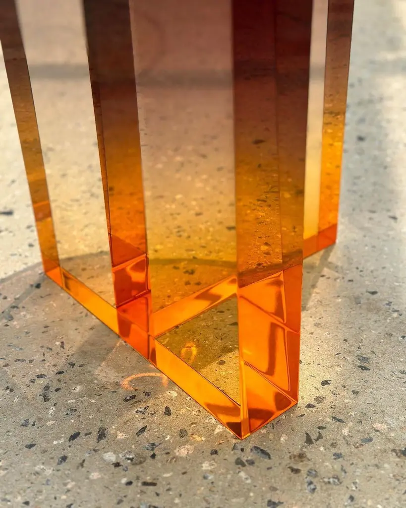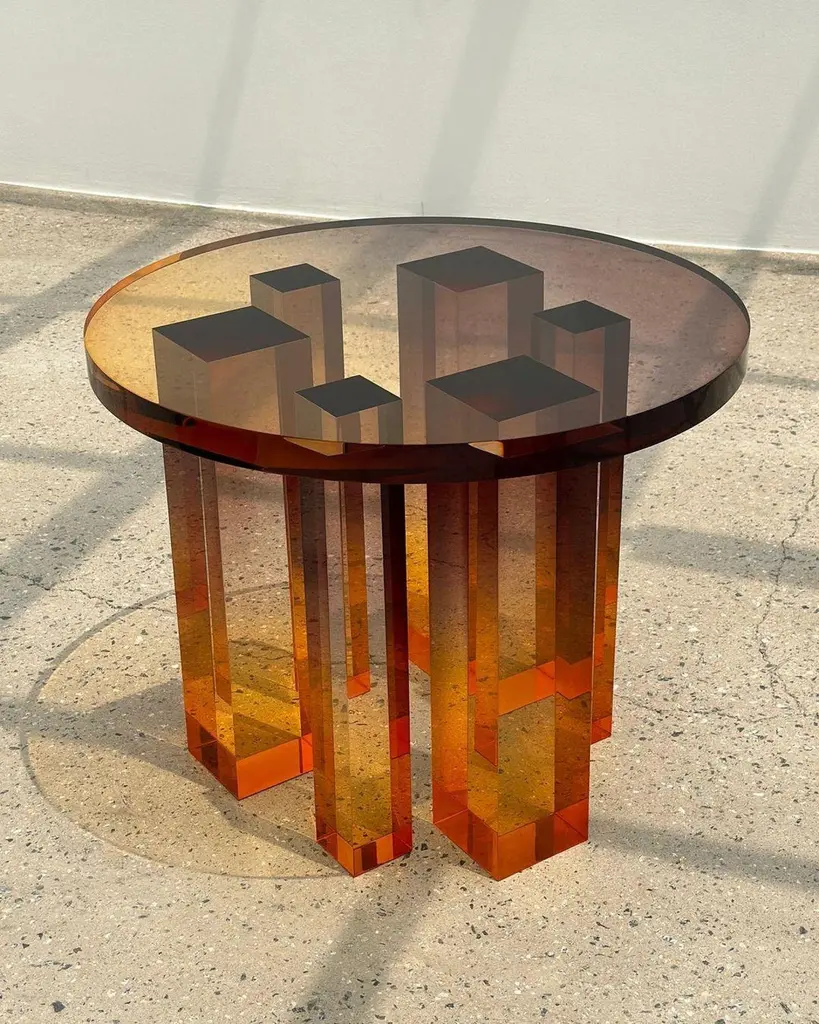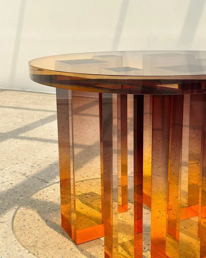 Table 11 by Saerom YoonDimensions: Ø 90 x H 70 cm.Materials: Acrylic.My oldest childhood memories go back to the time I spent in the Philippines with my parents. The green mountains, the emerald green ocean, and every scene of me playing on this small and beautiful island still reside in me. Among them, my favorite was the beach at sunset. The memory of sitting on the beach with my family while feeling the cool breeze as the hot midday sun sets is my most precious memory.This series [ A Piece of One Day ] and [ Crystal Series ] present the fragments of my memories, the emotions of looking at the afterglow on an exceptionally stunning day, and the moments of looking up at the sunlight and the leaves sparkling under the shade of hot summer sun. By sharing this series, I wish to show the perspective of seeing nature as the space and time surrounding us along with my own experiences.I intend to give the audience a strong visual impulse to share these experiences. With these extraordinary visual catalysts, I hope to share my memories with the audience, and the experience imprints in their hearts as a piece of one day.