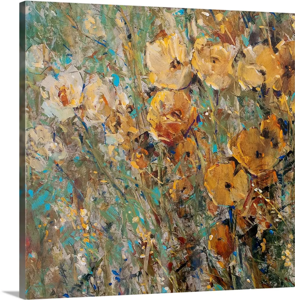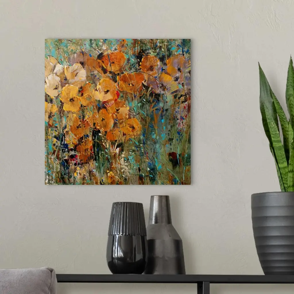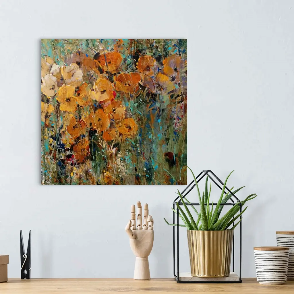 Large floral art focuses on an arrangement of flowers sitting in the wild. Artist uses a wide spectrum or colors to create a busy effect for this piece.