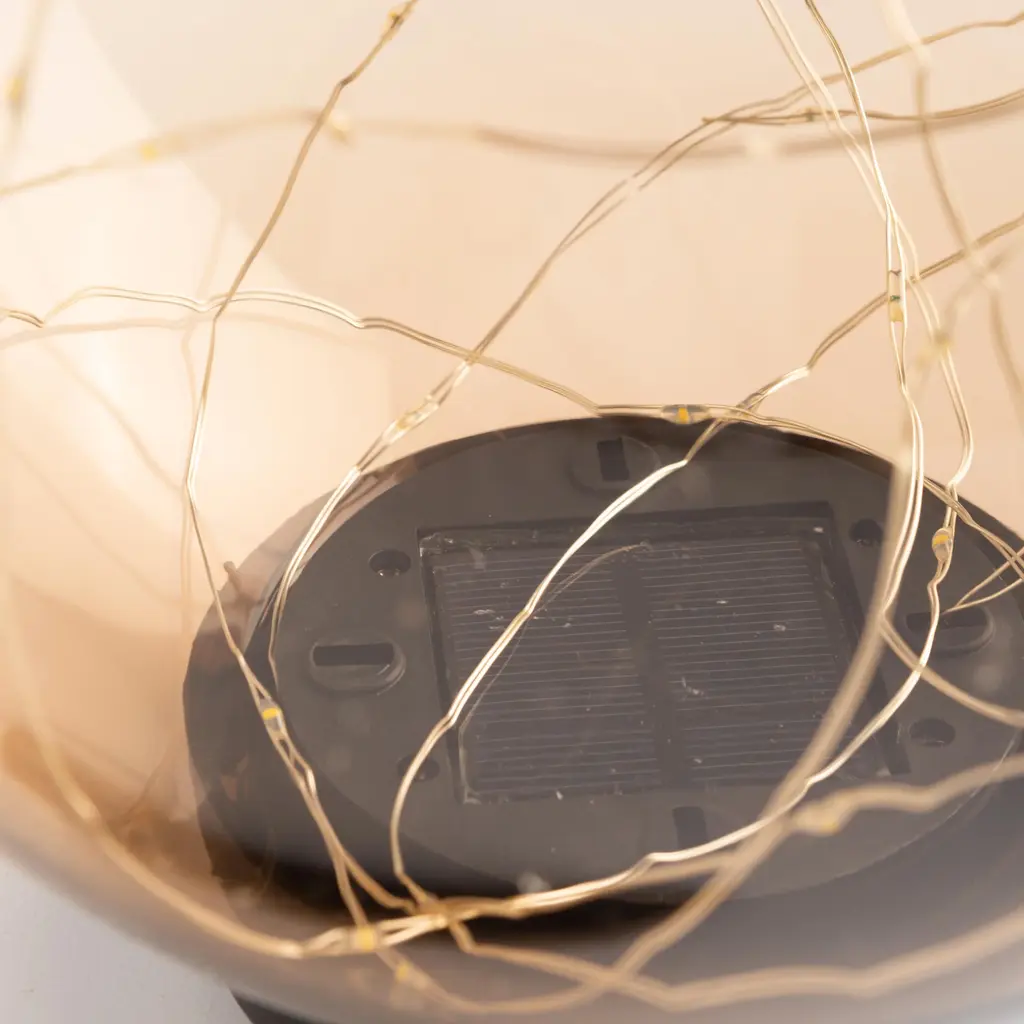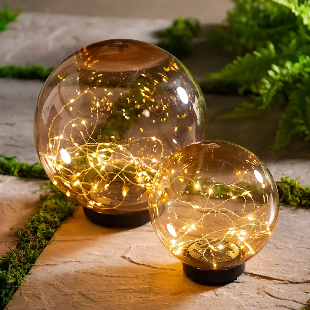 Accent any garden with this elegant solar globe that is filled with a magical string of firefly LED lights! These beautifully designed acrylic orbs will illuminate automatically at dusk adding a charming accent light to your garden or home. Each one comes with a ground stake to secure the globe in a garden or along a path. Alternatively, the stake can be removed and the globe can be used as a tabletop accent. 20 warm white LED lights, 6-hour timer.