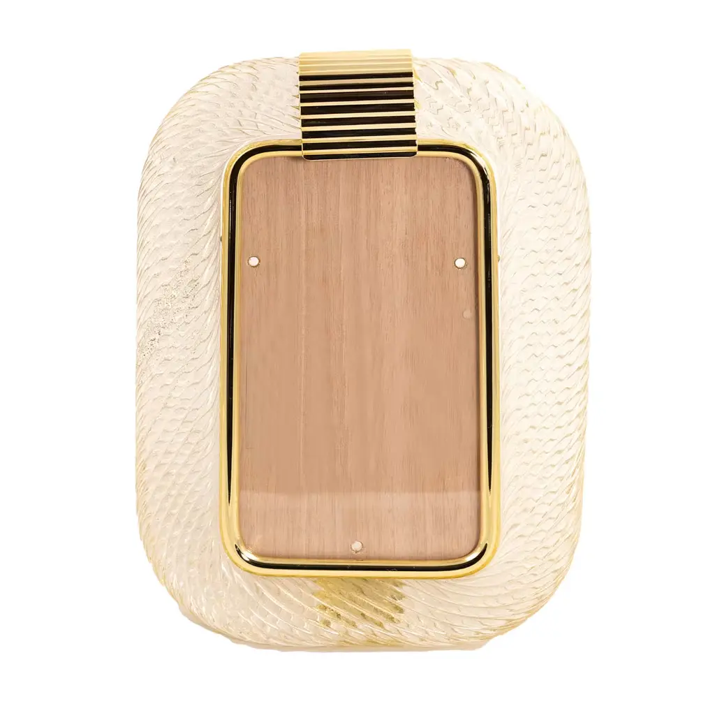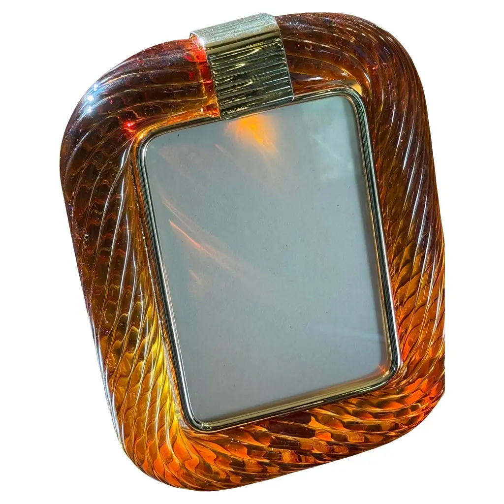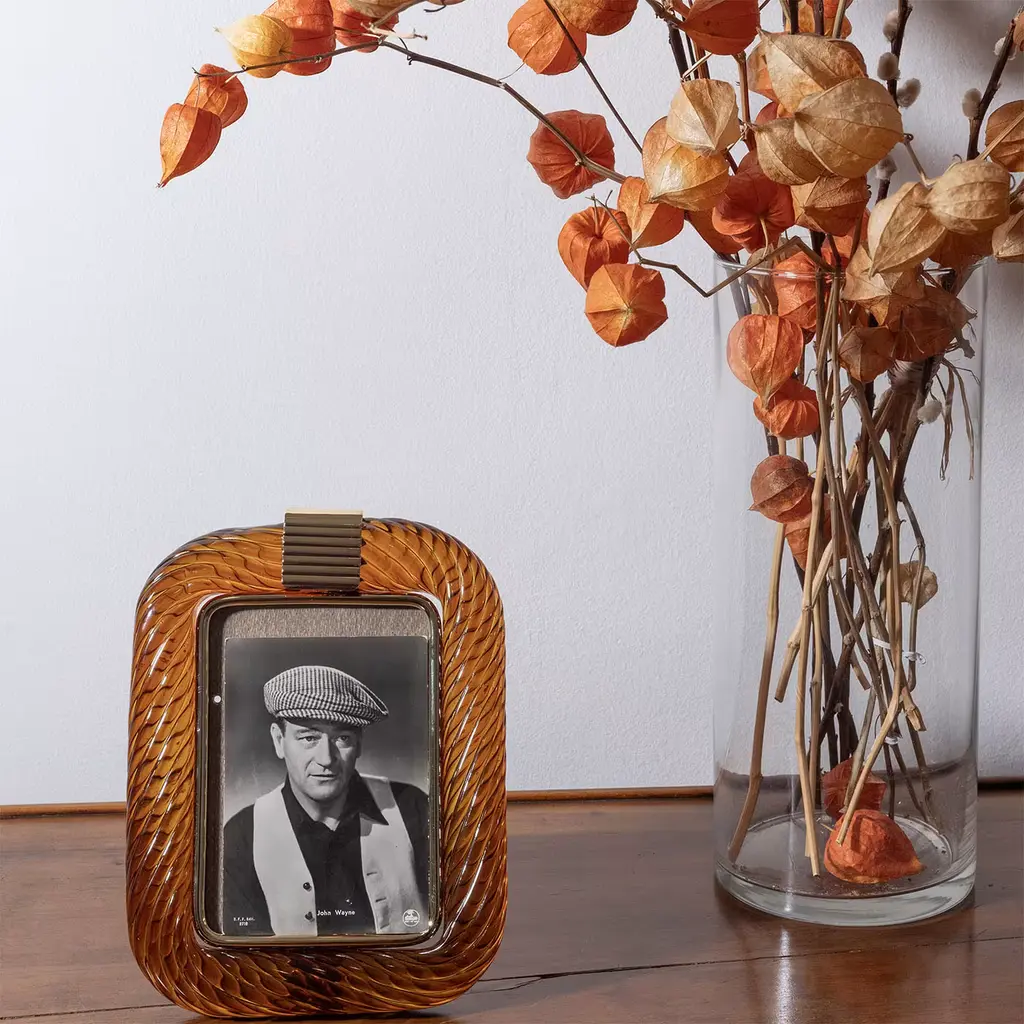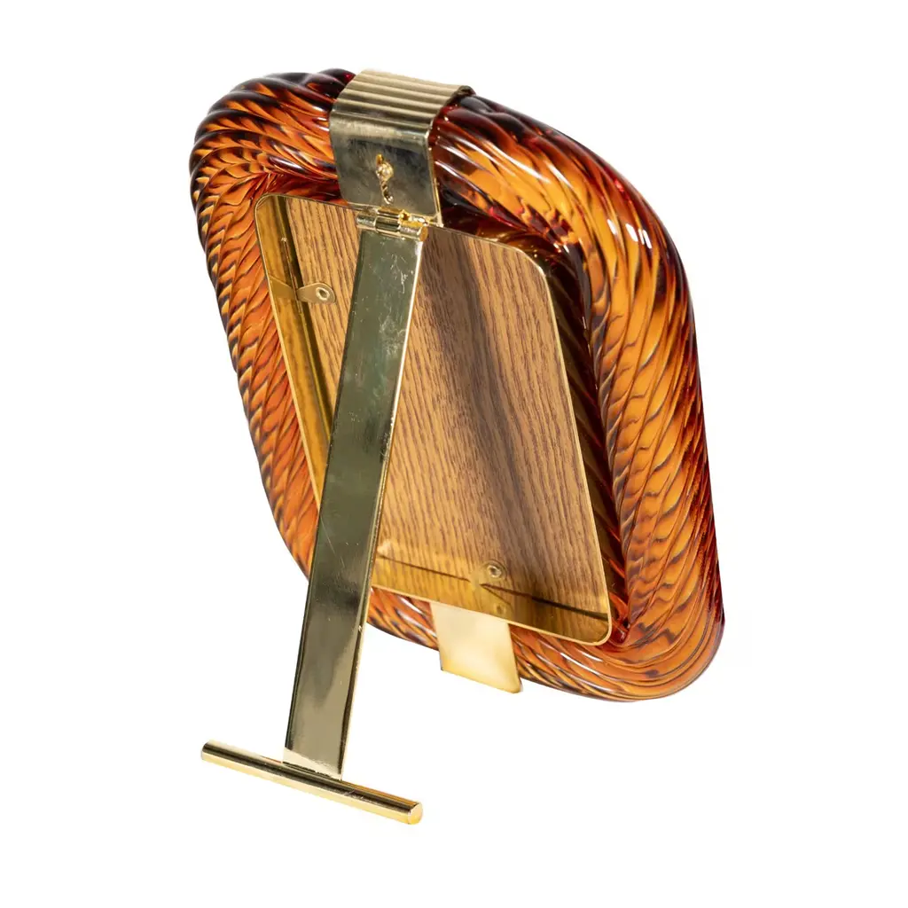 This frame is handcrafted in a historic Venetian glassworks using the traditional blown-glass twisting technique, resulting in a fluid, three-dimensional texture. Its warm amber hue captures and reflects light, accentuating artisanal detail. The hand-shaped brass structure is offered in a matte finish, with glossy brass available upon request. Additional color variations are offered in the Artemest catalog. A smaller size is available upon request; please contact the Concierge for more information.