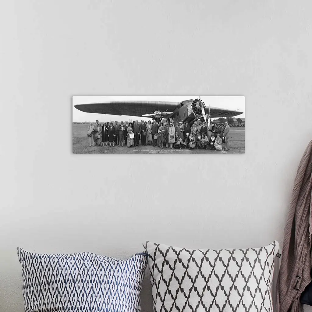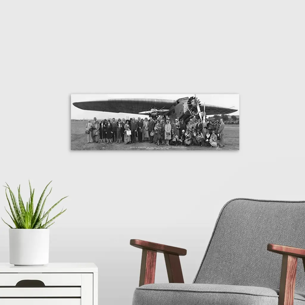 Vintage panoramic image of Amelia Earhart and plane gathered with supporters in Philadelphia.