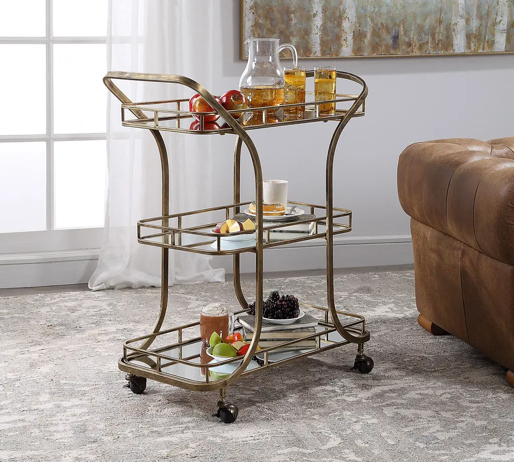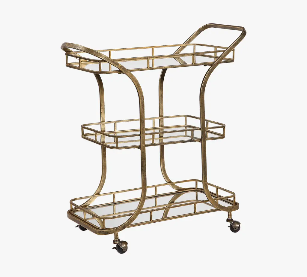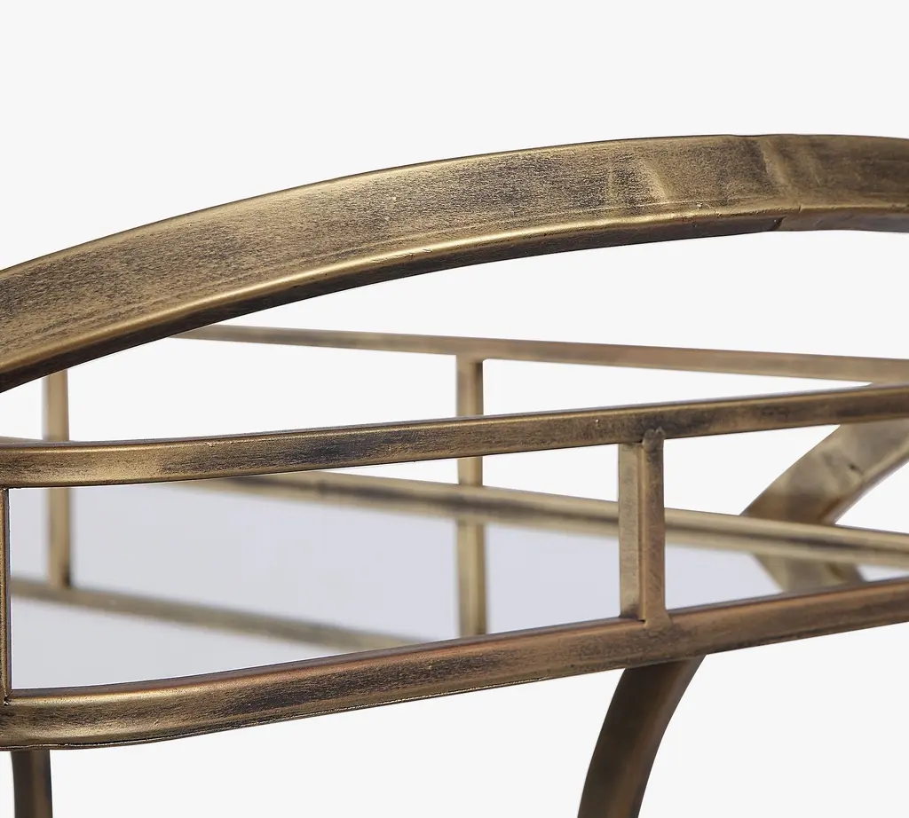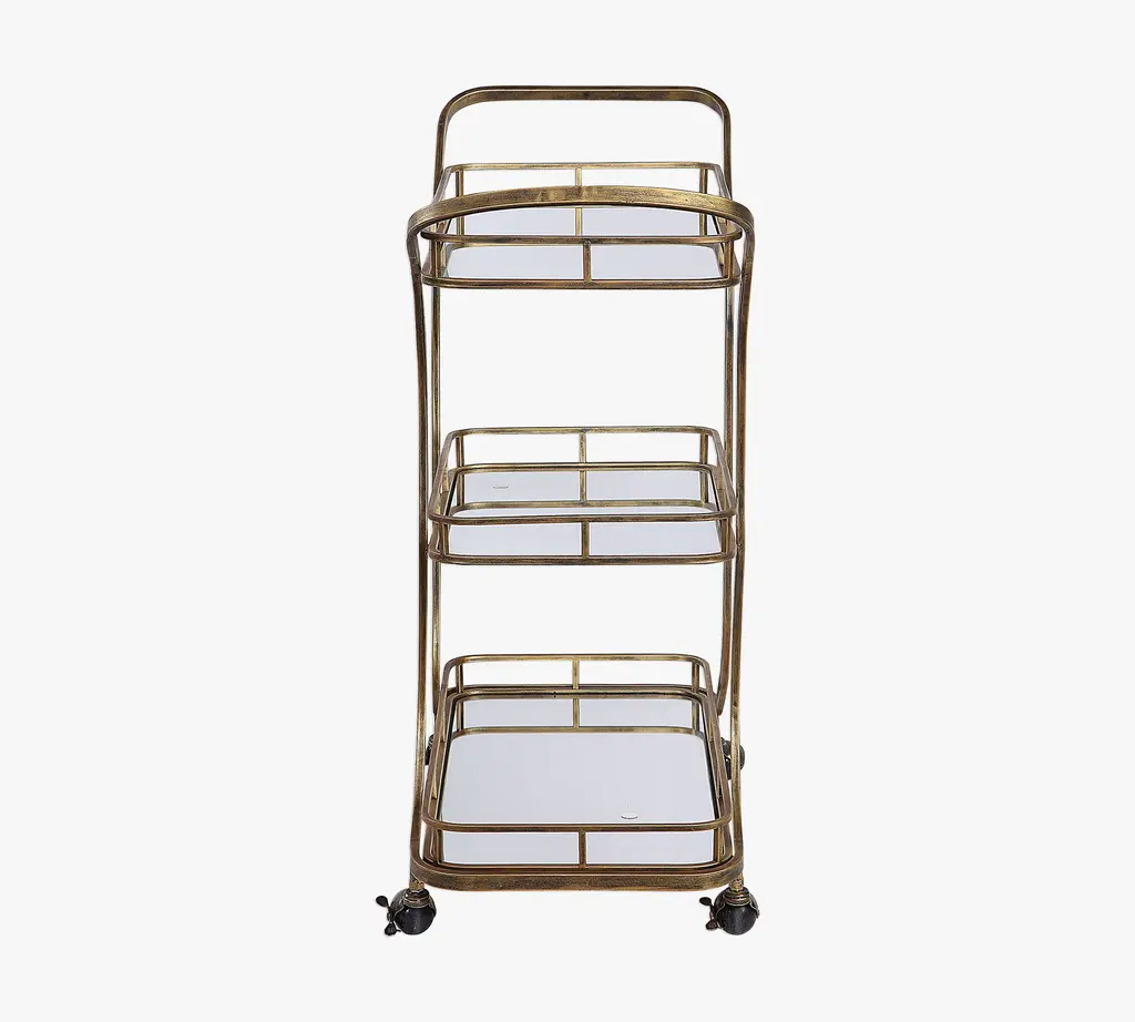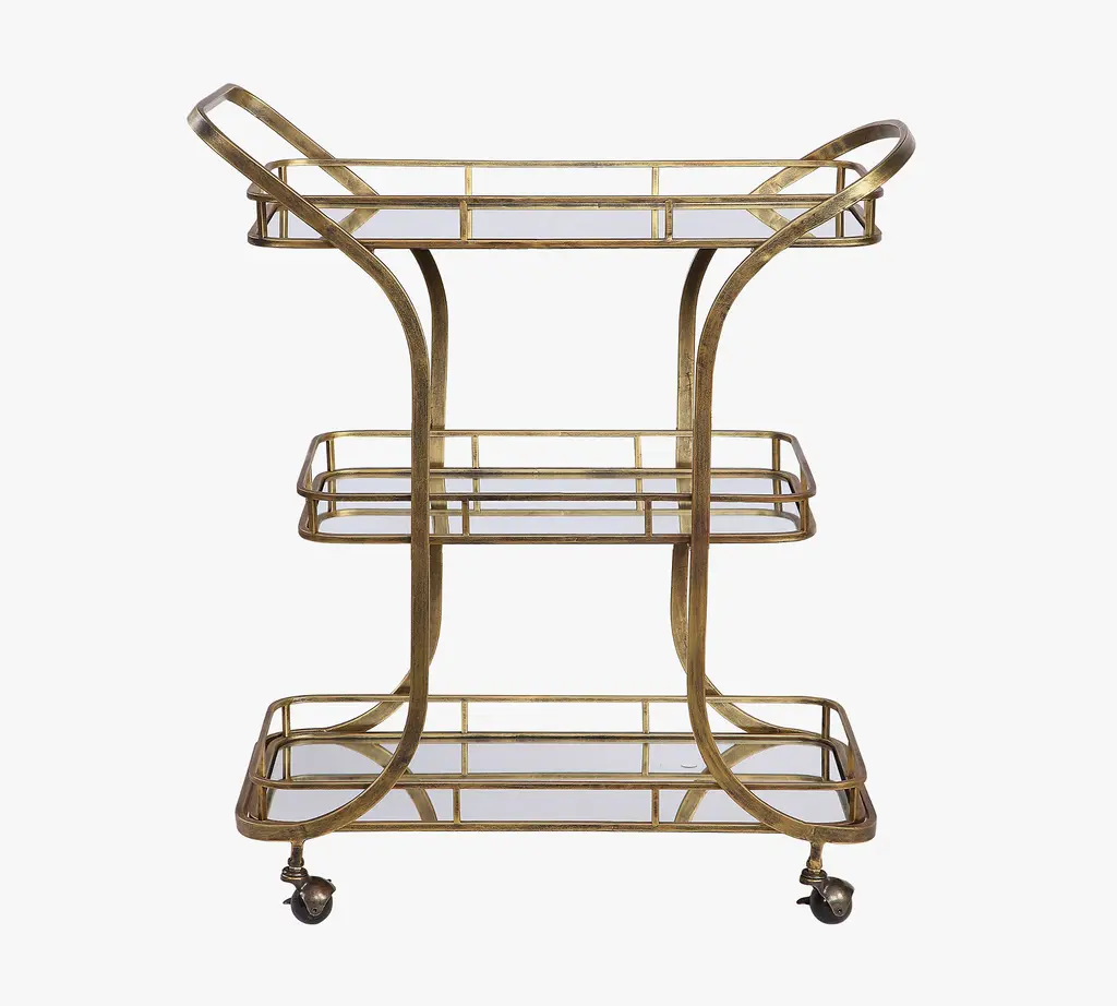 With its sweeping curves, this cocktail-ready cart is full of glamour. Hand-forged in solid iron with an antiqued finish, it has three mirrored glass, tray-style shelves. Bar cart, coffee station, tea trolley: Use it as storage and display or to bring drinks where they’re needed and then anchor it in place by locking the wheels.