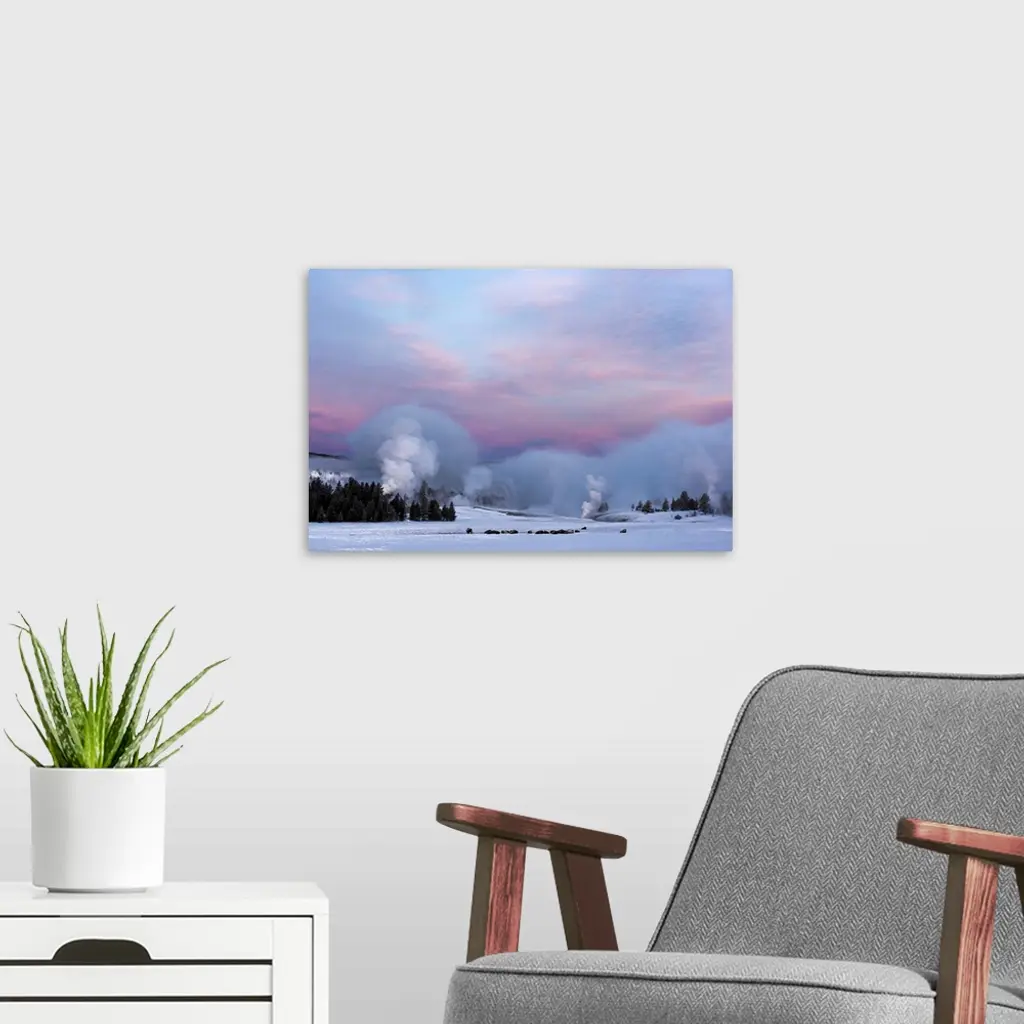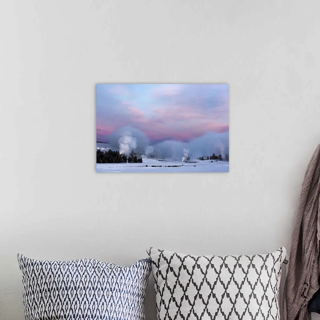 American Bison Next To Castle Geyser Erupting At Sunrise, Yellowstone National Park, Wyoming