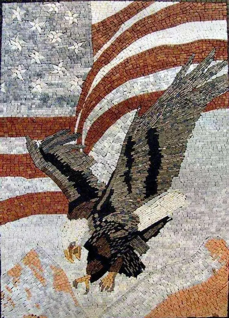 Introducing the American Eagle Mosaic, a stunning work of art that captures the essence of patriotism and the majestic beauty of the American flag. This exquisite hand-made mosaic features a powerful depiction of the eagle, a symbol of grace and strength, soaring across a vibrant backdrop of the flag. Each piece of this captivating mosaic is meticulously crafted from 100% natural stones and hand-cut tiles, ensuring that every detail is brilliantly highlighted.The American Eagle Mosaic is not just a decoration; it's a celebration of American ideals and heritage. The combination of rich colors and intricate patterns creates a visual masterpiece that commands attention and admiration, making it a perfect addition to any home or office space. Whether displayed in your living room, hallway, or entryway, this mosaic serves as a conversation starter and a testament to national pride.Artisans have poured their skill and passion into this creation, ensuring that it stands out for its quality and craftsmanship. Each tile is carefully placed to form a cohesive image that resonates deeply with anyone who values the symbolism of the eagle and the flag. The durability of the materials used guarantees that this piece will remain a cherished part of your decor for years to come.Elevate your interior design with the American Eagle Mosaic. It’s more than just art; it's a representation of freedom, courage, and resilience. Bring the spirit of America into your home and let the majesty of the eagle inspire you every day. Don’t miss the chance to own this beautiful piece that embodies the strength and beauty of our nation. Embrace the greatness of the American flag with the American Eagle Mosaic – a true masterpiece that celebrates the very best of America.