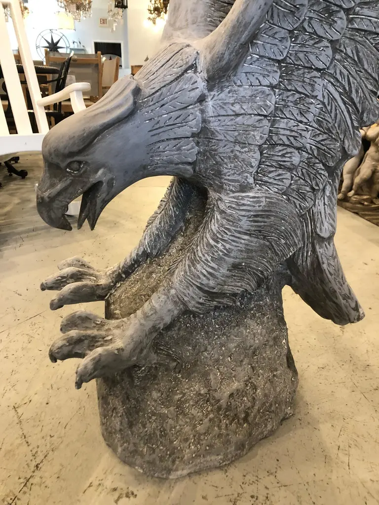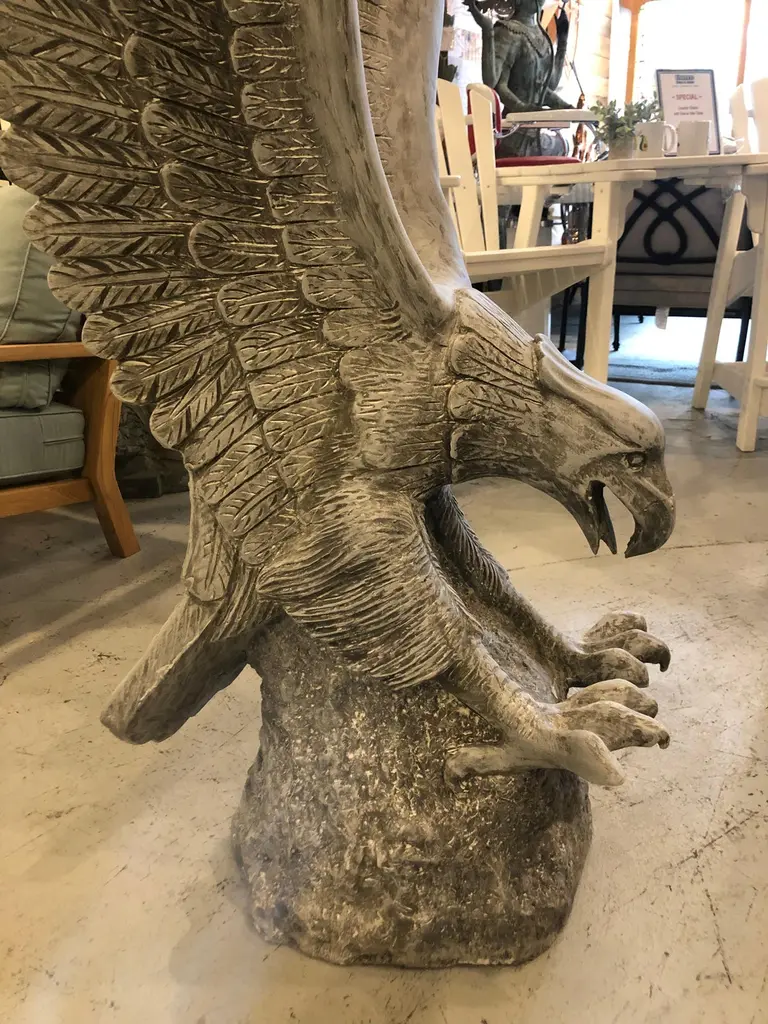 Large Fiberglass American Eagle with Open Talons ready to ponce on its prey. Nothing shows more strength than an American Eagle with its talons open. A pair of eagles would look amazing at the end of a driveway entrance standing alone or on pillars Made from a very durable fiberglass which will withstand the elements. The base is also weighted with sand which keeps it standing tall.