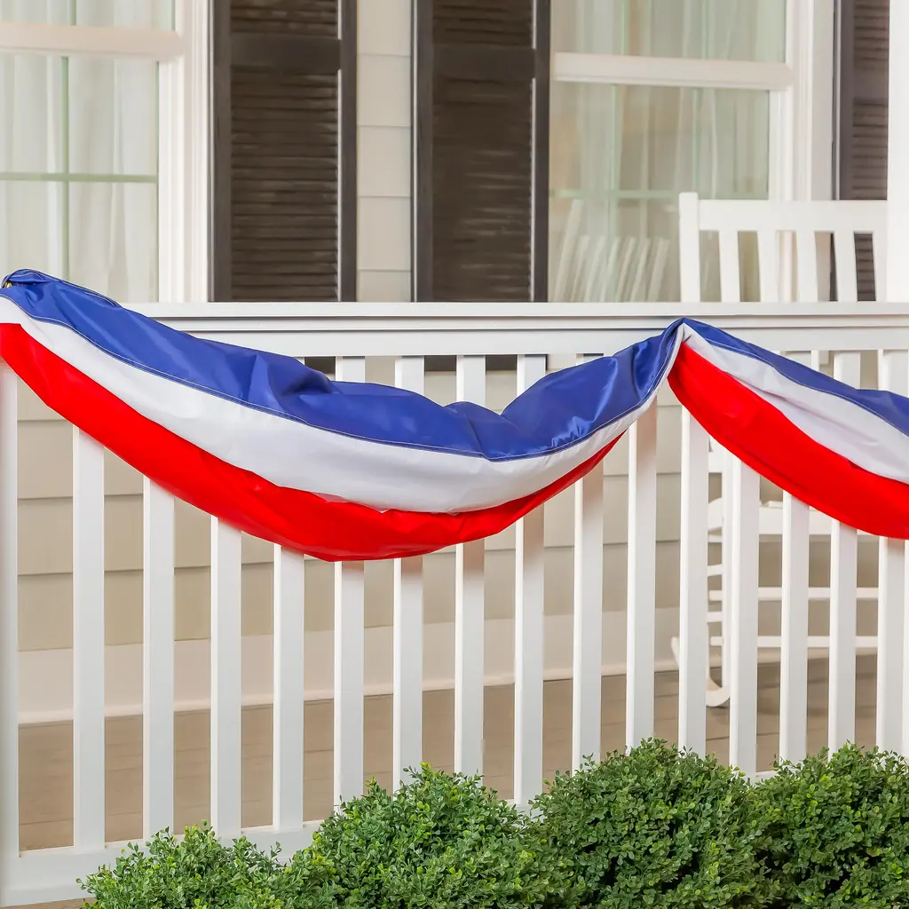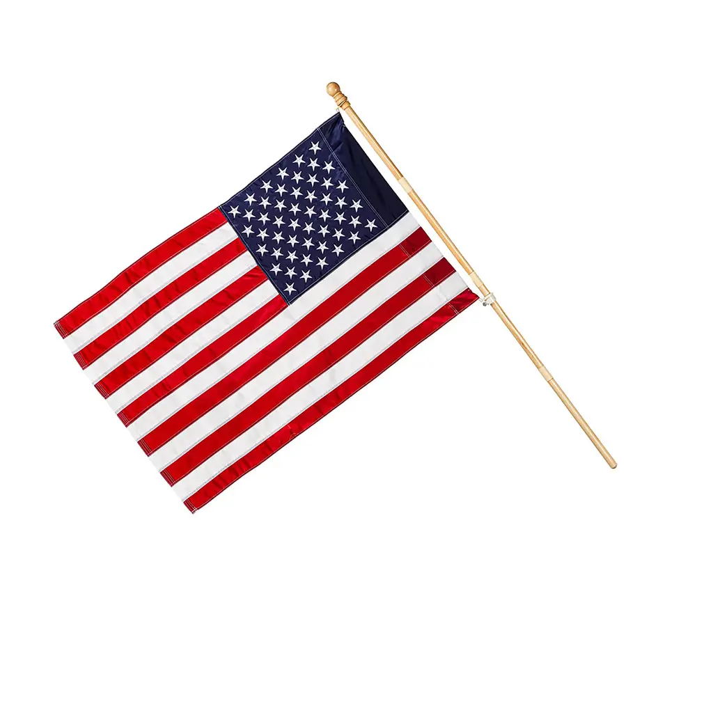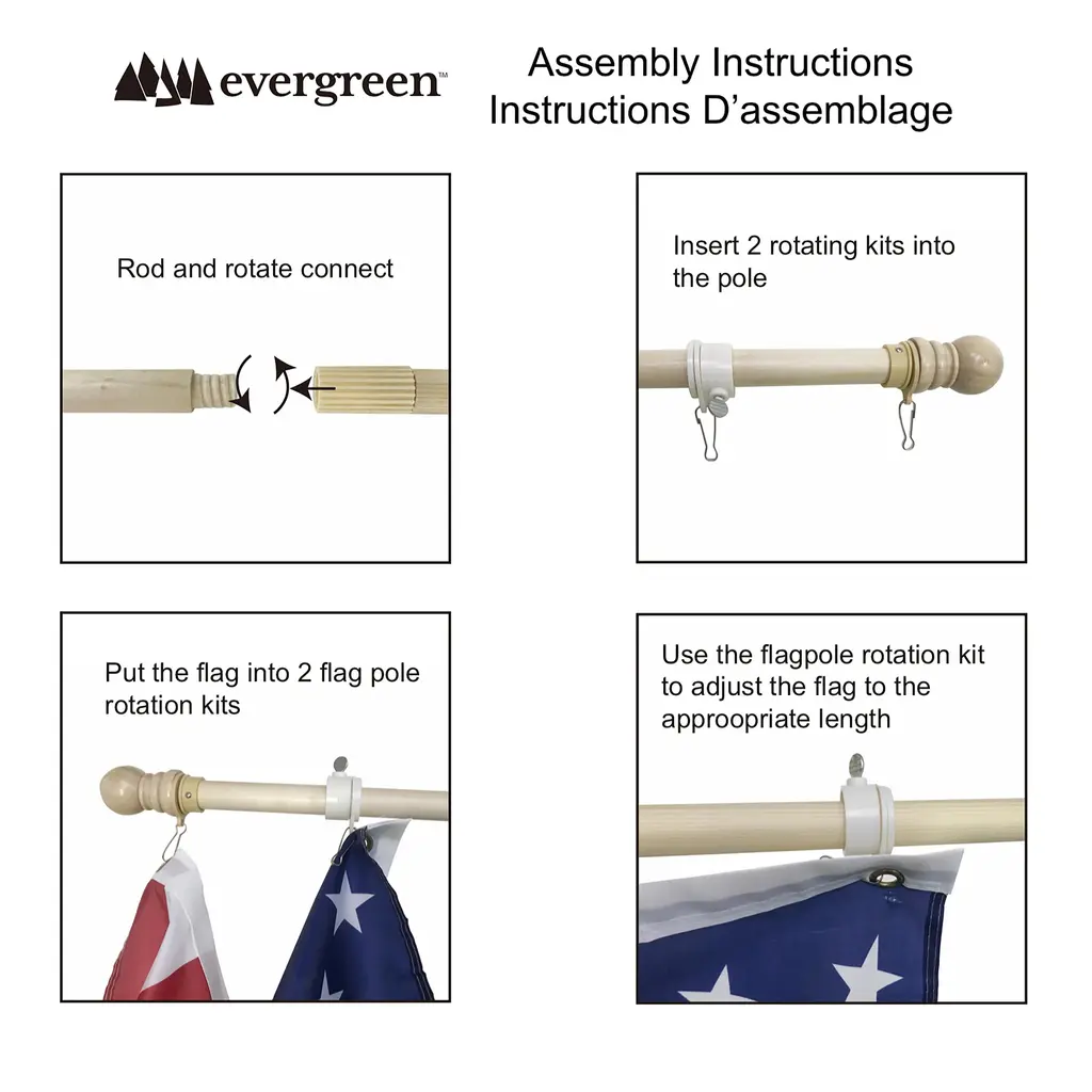 Show your patriotic pride with this American house flag and wooden flag pole that allows you to fly Old Glory in sophisticated style. The flag is made of premium grade 310 denier nylon, making it safe for outdoor display on Independence Day and beyond. Durable and made of wood, the extendable pole is compatible with all house and estate-size flags and includes an anti-slip clip to keep any flag in place. Unscrew the finial to easily slide a flag onto the pole. The set also comes with the necessary hardware, including a two-position bracket kit crafted from cast iron with a stylish white look. Choose between two different positions: 45-degree angle or 90-degree angle to showcase your flag. Attach the bracket to your desired surface using the supplied screws or your own screws. Slide the end of the pole into the bracket.
