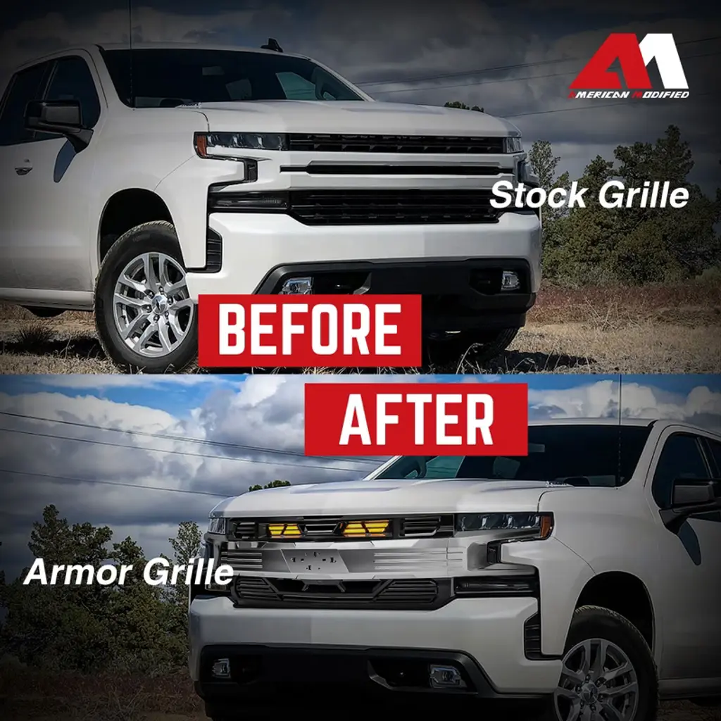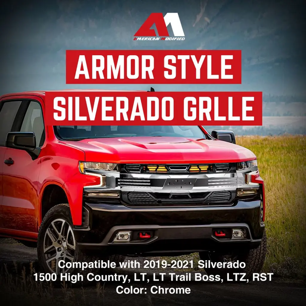 Upgrade your 2019, 2020, or 2021 Chevy Silverado 1500 with the AMERICAN MODIFIED LED Armor Grille, designed to give your truck a bold, aggressive appearance while enhancing functionality. This high-quality front grille is made from durable ABS plastic with a sleek chrome glossy black finish, ensuring it stands up to tough road conditions while adding a striking look to your vehicle. Equipped with 2 amber lights, this vehicle grille not only improves nighttime visibility but also makes off-road adventures safer and more enjoyable. The mesh design allows for optimal airflow, helping to keep your engine cool during tough driving conditions, while also providing protection from debris and other potential hazards. Installation is quick and straightforward, with all necessary wiring, brackets, and hardware included in the package. No modifications are required, making this automotive accessory an easy upgrade for anyone looking to enhance their truck’s performance and style. Whether you're looking to improve visibility on the trail or give your Chevy Silverado a more distinctive look on the road, the American Modified LED Armor Grille is the perfect choice. Experience the perfect combination of style, functionality, and durability with this grille, designed specifically to fit 2019, 2020, and 2021 Chevy Silverado 1500 High Country, LT, LT Trail Boss, LTZ, and RST models. Step up your truck's game and hit the road or trail with confidence.