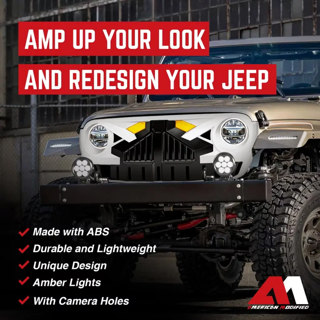 American Modified Empire Grille Compatible W/ Jeep 2018+ Wrangler Jl & 2020+ Gladiator Jt W/ Camera, White/black