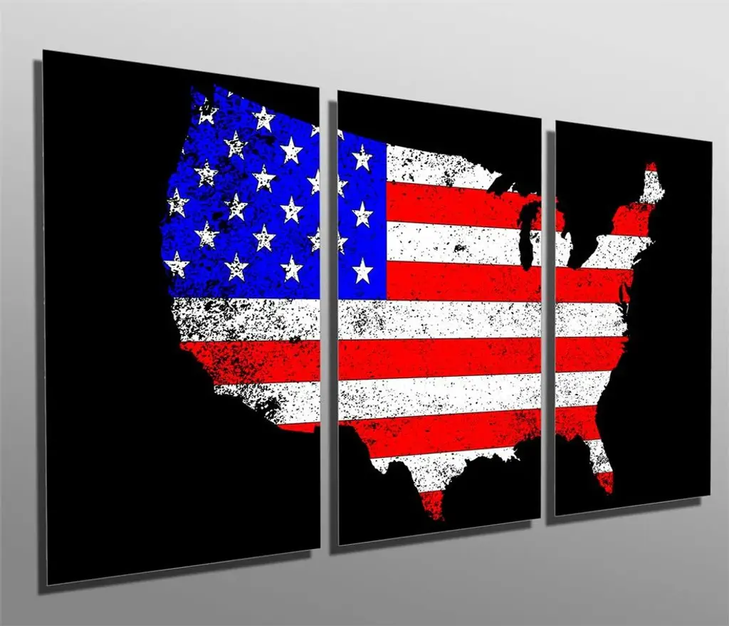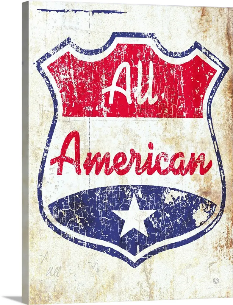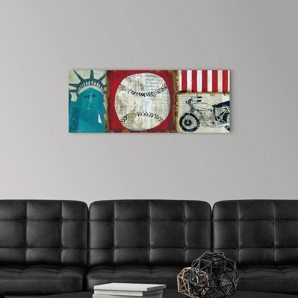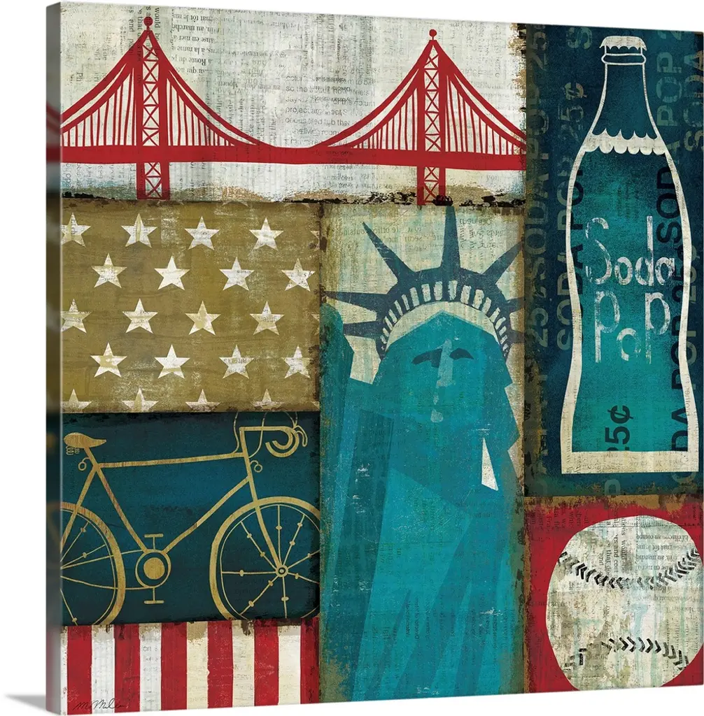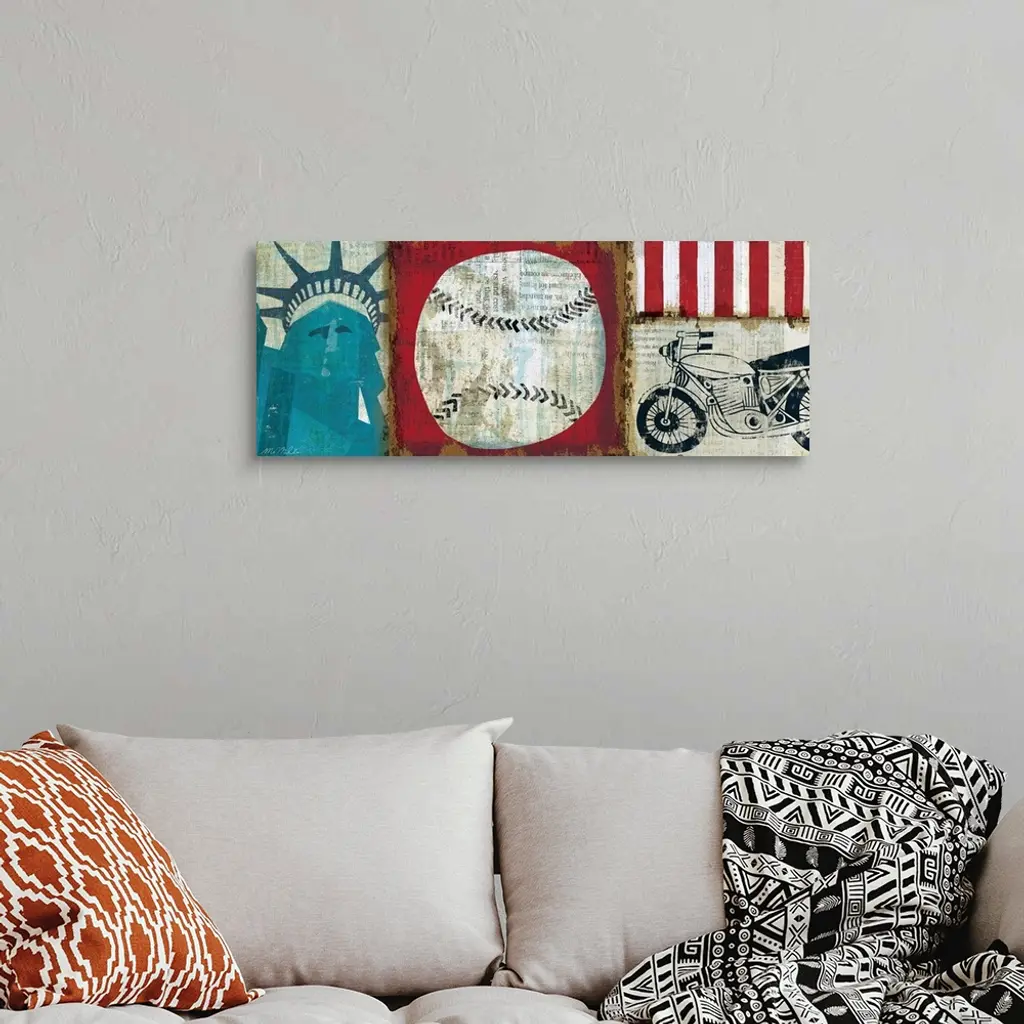 Mixed media design featuring classic American symbols, including the Statue of Liberty, a baseball, and a motorcycle.