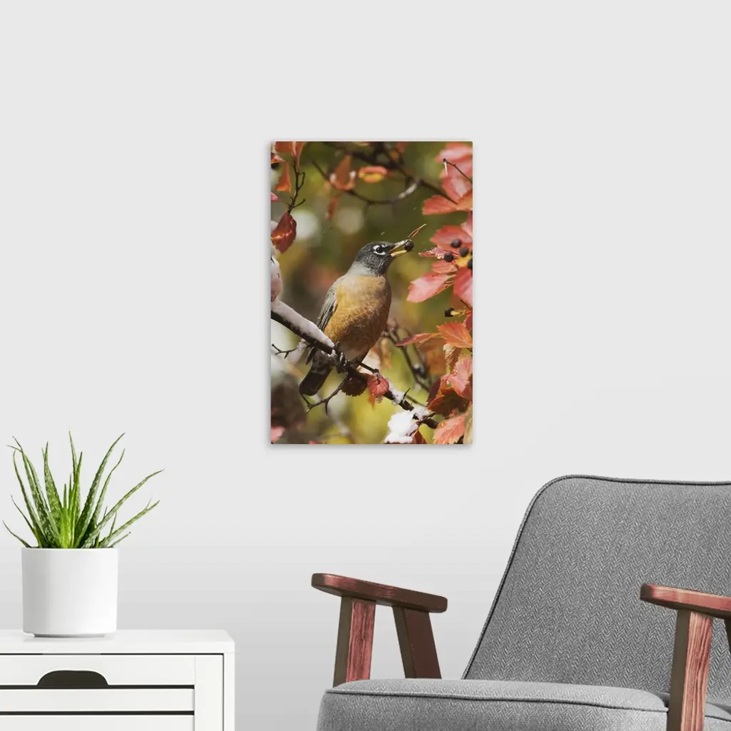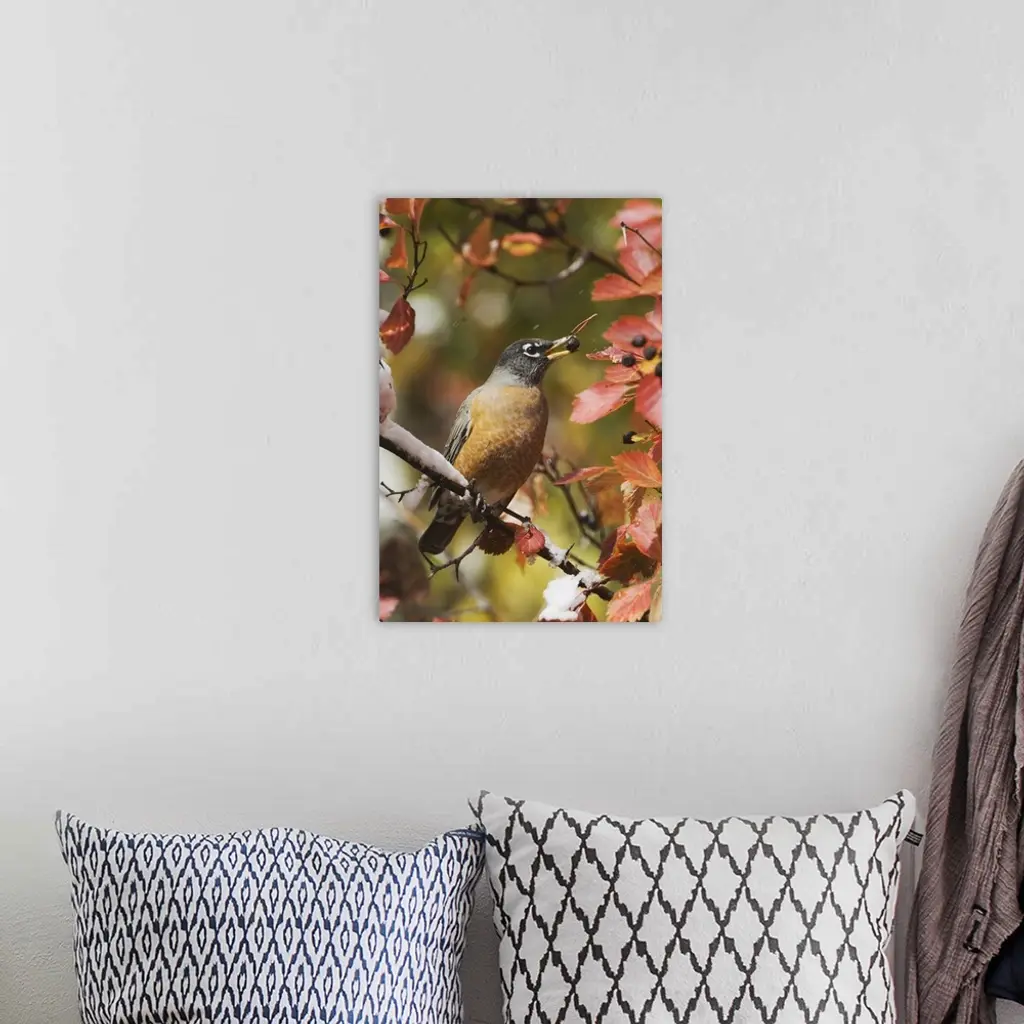 American Robin, Turdus migratorius, male eating berries of Black Hawthorn (Crataegus douglasii) fallcolors snow, Grand Teton NP,Wyoming, September 2005