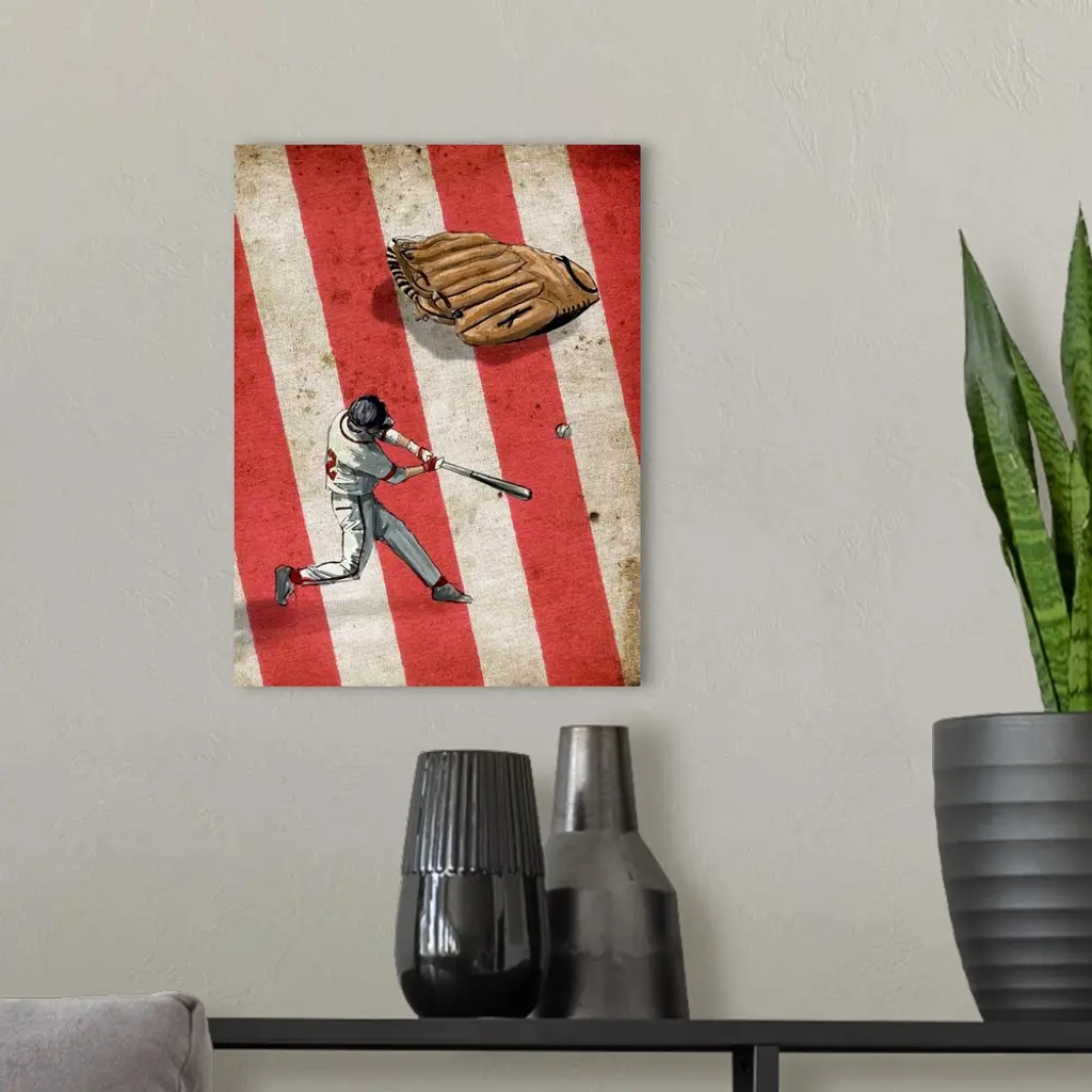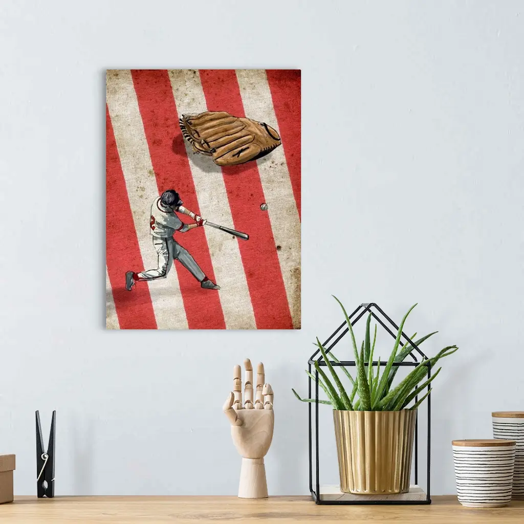 A digital illustration of a baseball player swinging a bat at a ball with the american flag in the background.