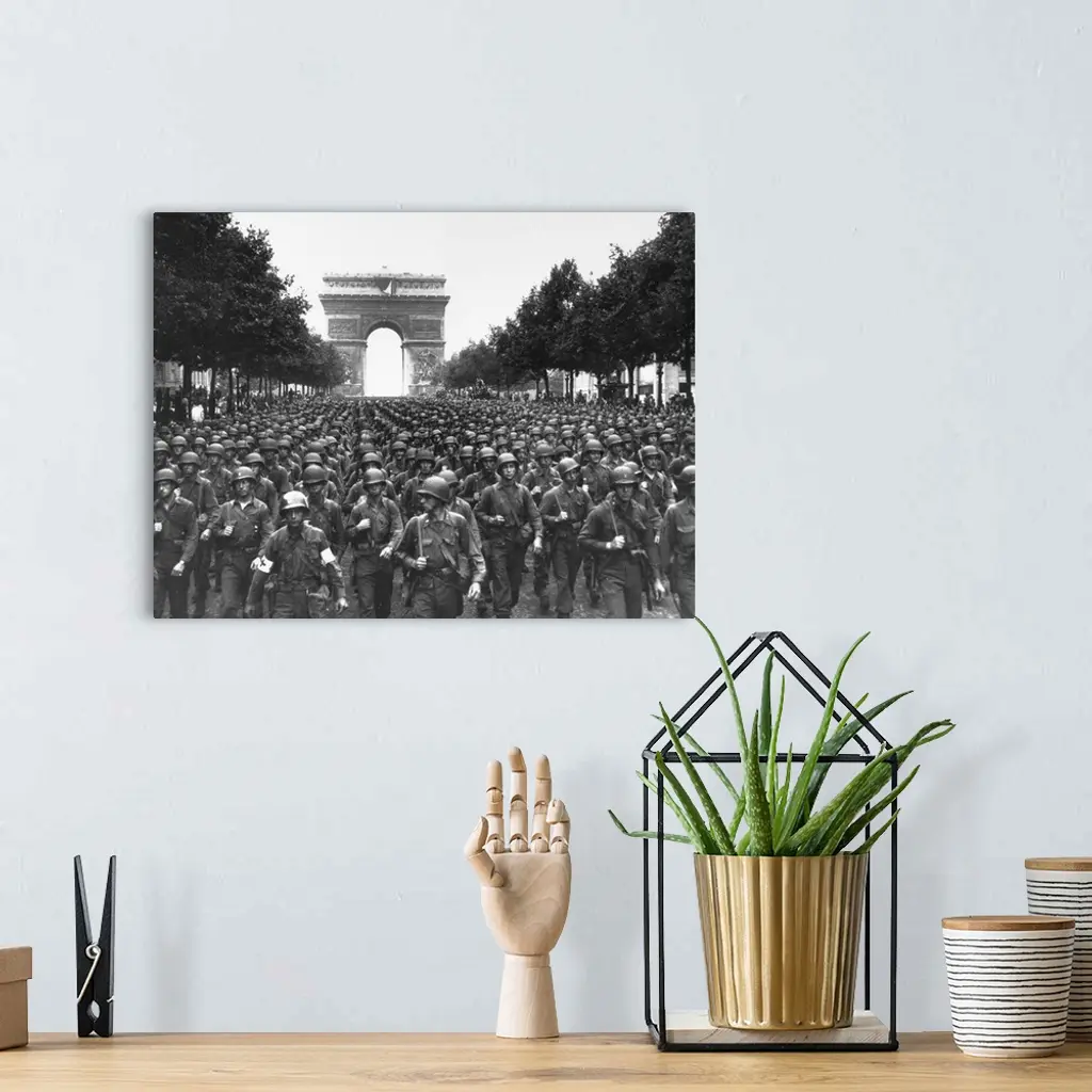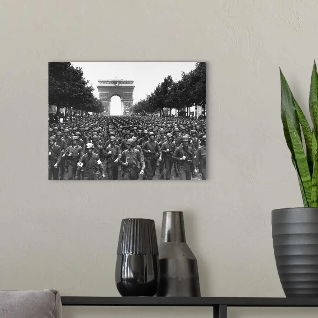 American troops marching on the Avenue des Champs-?lys?es in Paris, France, with the Arc de Triomphe in the background. Photograph,1944