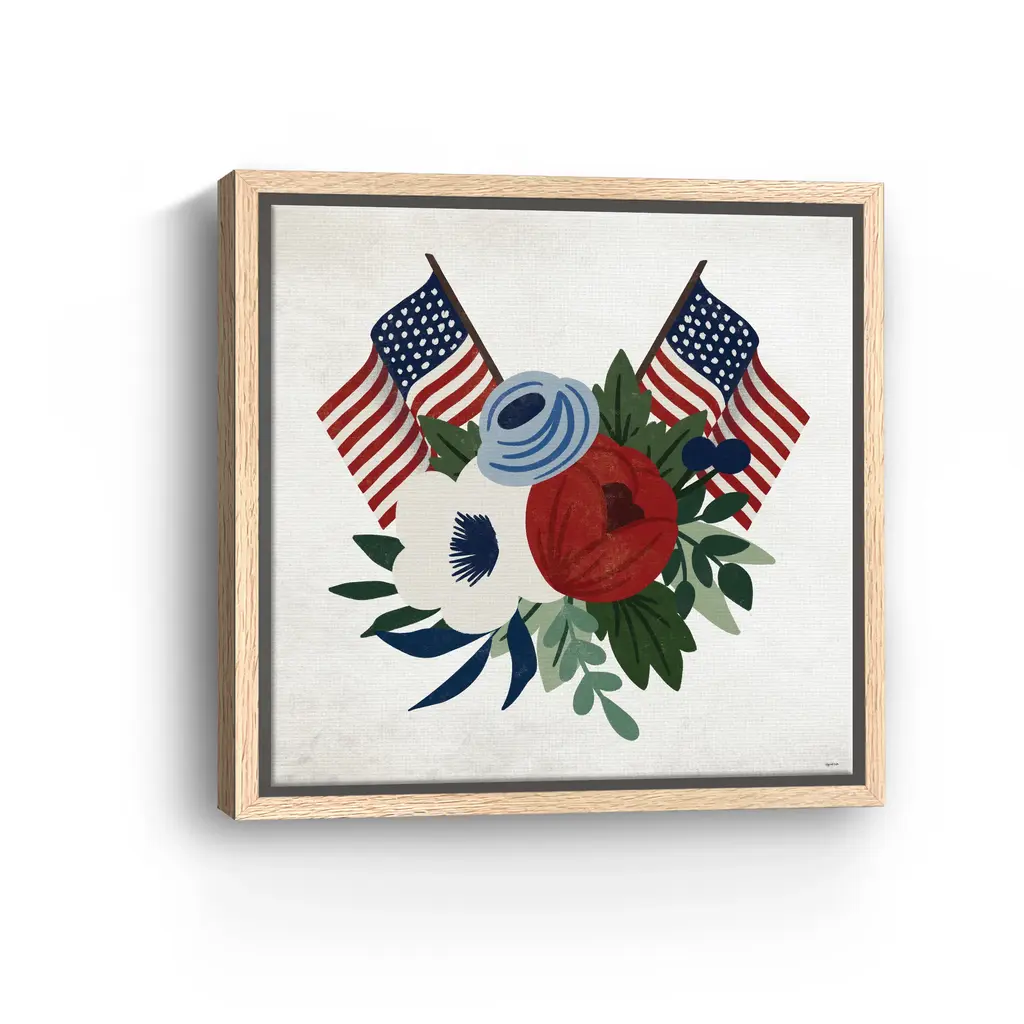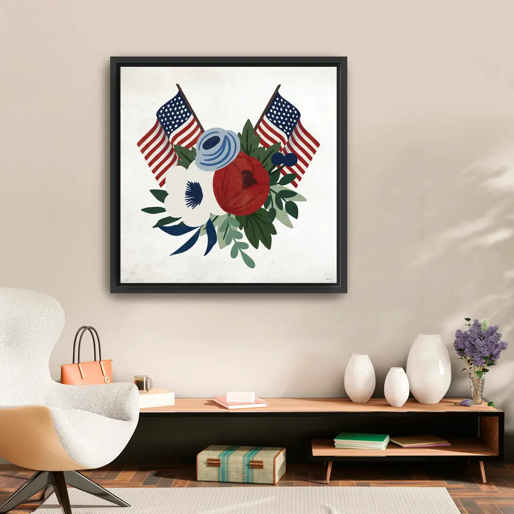 A soft tribute to independence, this floral design blends subtle patriotic hues with the elegance of nature. A quiet nod to the enduring spirit of a nation in bloom. Our Gallery Wrap Canvas Prints are proudly assembled with high quality materials in California, USA. Each piece is printed on a thick, archival grade canvas using Giclee technology. It is then hand-stretched by our experienced artisans over solid wood bars, which will not warp over time. The final product is a piece personally crafted for you to confidently display on your wall. Care and Assembly: Ensure that the location of your piece has little to no exposure to heat, sunlight, and moisture. Wipe clean, only if needed. Each piece includes a sawtooth hanger to hang on your wall vertically.