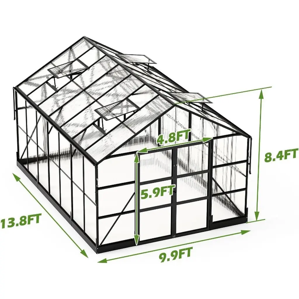 Amerlife 10x14x8.4 Ft Polycarbonate Greenhouse With 4 Vents, Rain Gutter, Heavy Duty Aluminum Frame