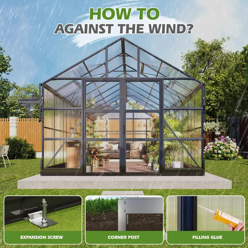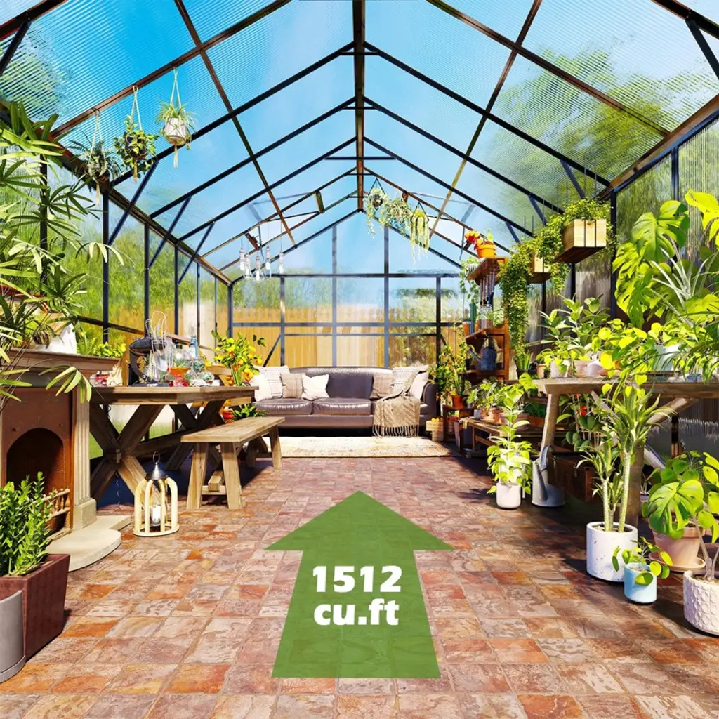 Hulky Patio Greenhouse: 10x18x8.4 ft polycarbonate greenhouse features unbreakable UV-protected panels, a heavy-duty aluminum frame, and secure anchoring for stability. With 1108 cu. ft. of versatile space, it’s perfect for plants, gatherings, or storage. Four roof vents ensure excellent ventilation, while rain gutters efficiently drain water. Easy to assemble in about 10 hours, it’s ideal for outdoor gardens or backyards.