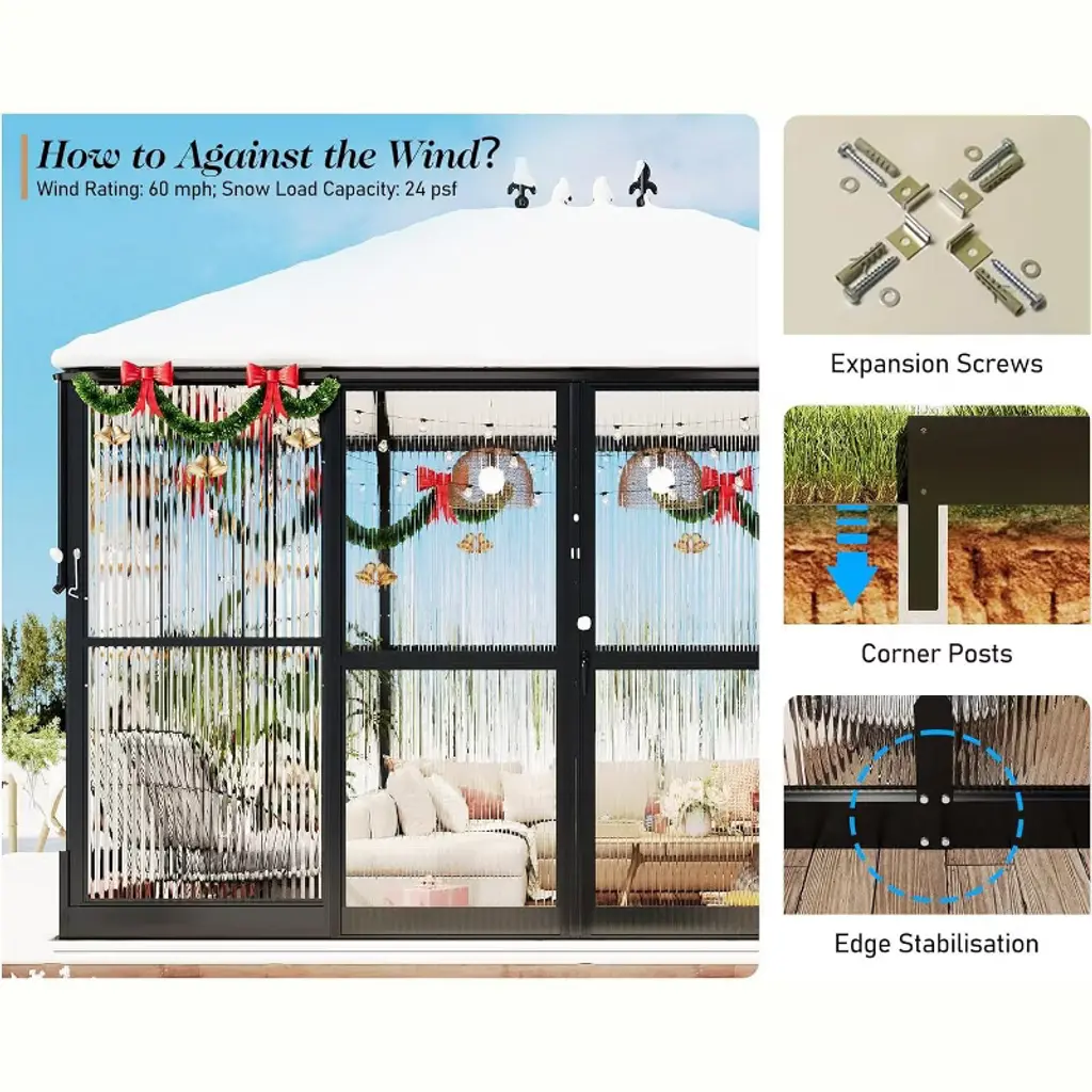 Spacious & Stylish Greenhouse for All-Season Gardening – This extra-large walk-in greenhouse offers abundant room for growing vegetables, flowers, and herbs, while also serving as a multifunctional outdoor space for storage or relaxation. Its elegant pavilion-style design adds a sophisticated touch to any garden, blending aesthetics with practicality. Featuring a raised door and low threshold, it ensures easy entry for both people and gardening tools, making your daily planting and maintenance more convenient. Built with reinforced screws and sturdy ground stakes, this greenhouse provides excellent stability and weather resistance, protecting your plants year-round. Two built-in windows promote natural ventilation, maintaining optimal airflow and a healthy growing environment. For added ease, a step-by-step installation video is included to guide you through the setup process smoothly.