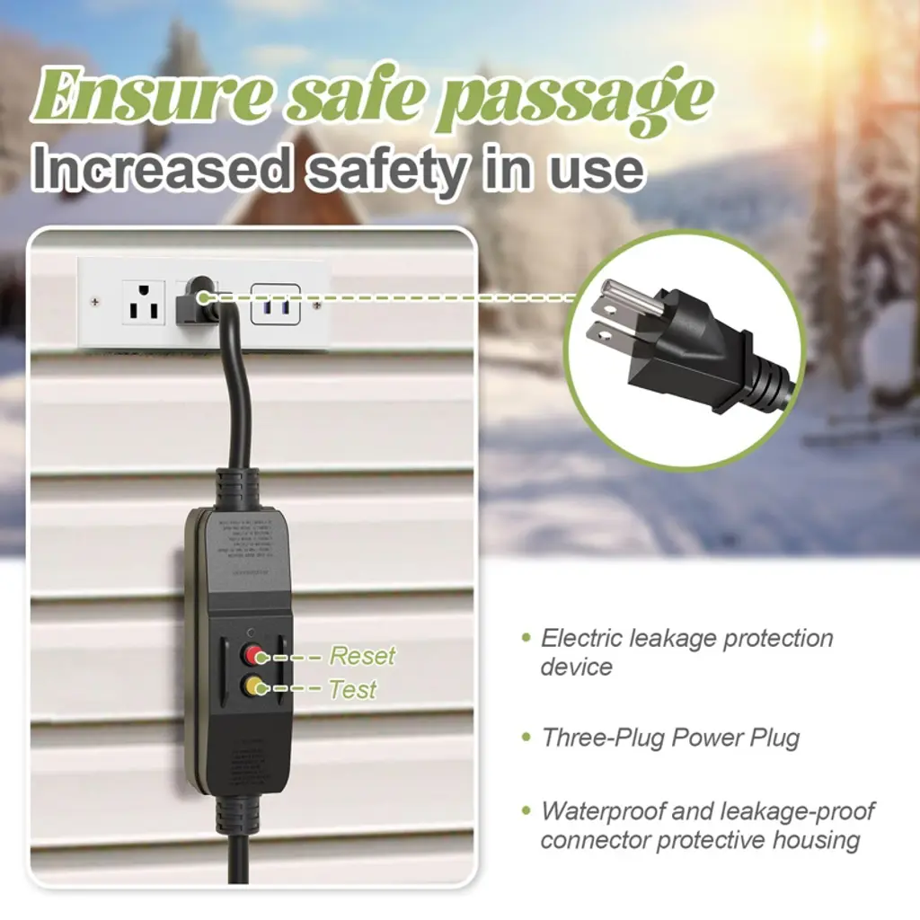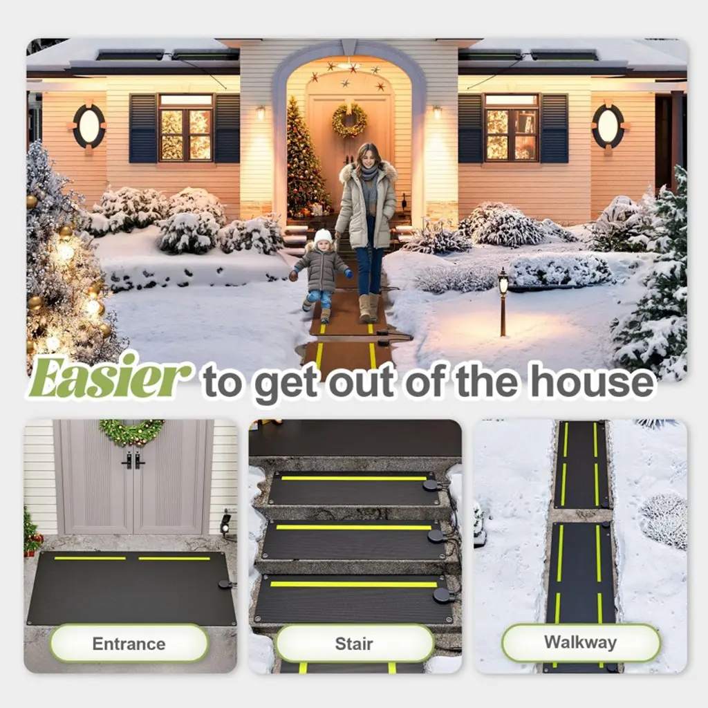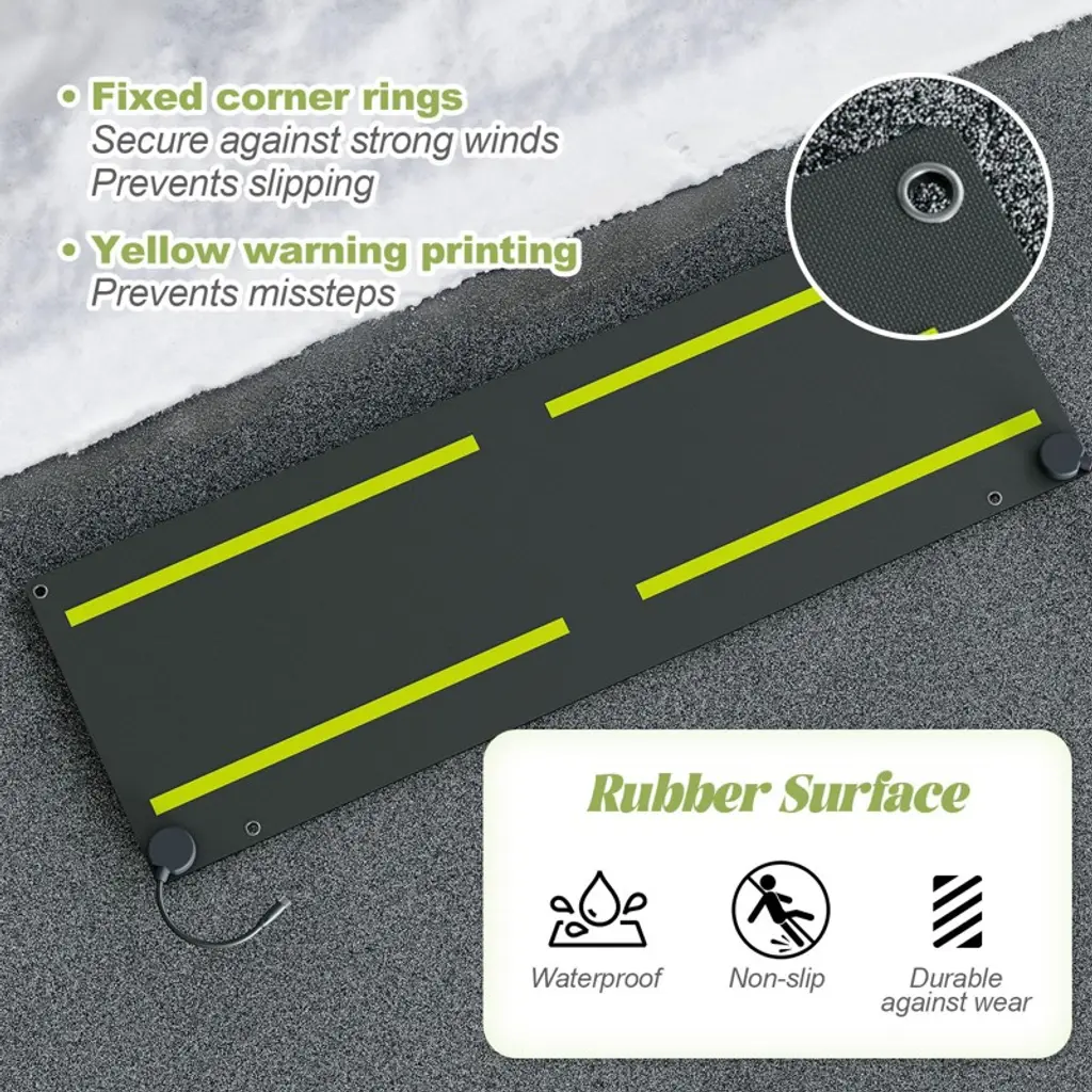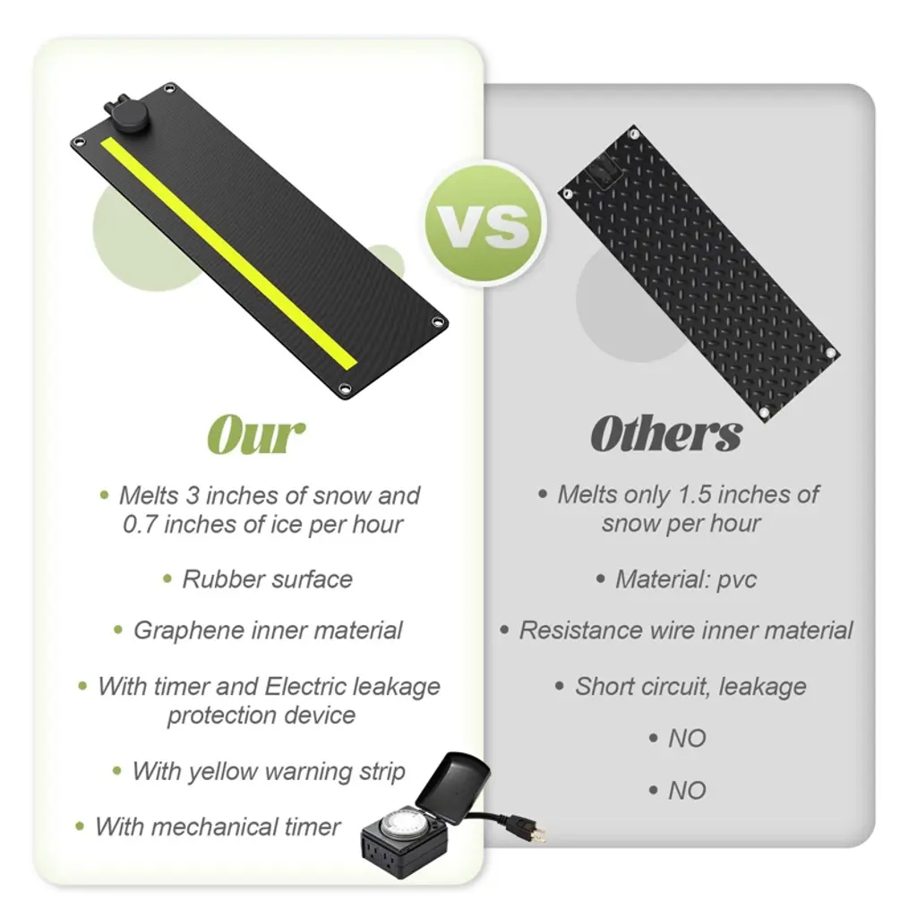 This 10x30 inch graphene heated snow melting mat is designed for outdoor winter use, providing efficient snow and ice removal. Powered by advanced graphene heating technology, it conducts heat more efficiently than traditional wires, quickly melting snow and ice to keep pathways safe. The mat is made of durable rubber with anti-slip, anti-corrosion, and UV-resistant properties for long-lasting performance. It can be used alone or connected with multiple mats to expand coverage, making it perfect for porches, stairs, garages, sidewalks, and more. Equipped with an 11.5 ft power cord, mechanical timer, and GFCI leakage protector, this mat ensures safe operation. Pre-drilled corner holes allow for secure installation, while bright yellow warning stripes enhance visibility at night. Whether for residential or commercial use, it helps reduce the need for shoveling or salting, ensuring safer and more convenient winter travel. ·Size: 10 x 30 in ·Power: 90W ±15% ·Voltage: 120V / 60Hz ·Heating Temperature: up to 104°F ·Snow Melting Rate: 2–3 in/h ·Ice Melt Rate: 0.7 in/h ·Lowest Operating Temperature: -4°F ·Material: Rubber exterior, graphene heating sheet ·Cord Length: 11.5 ft ·Thickness: 0.2 in ·Maximum Mats in Series: 15 (10x30 size) ·Safety Features: GFCI leakage protection, mechanical timer, yellow warning stripe, corner fixing holes