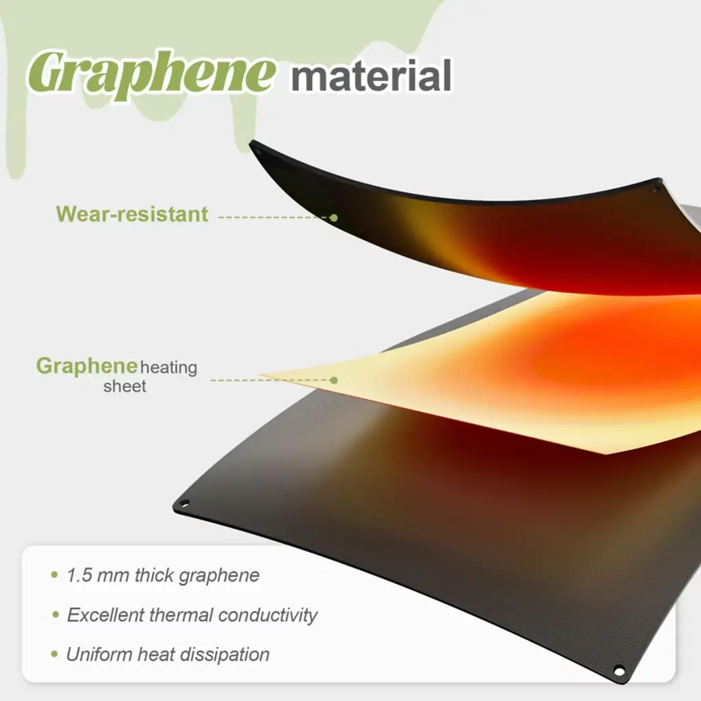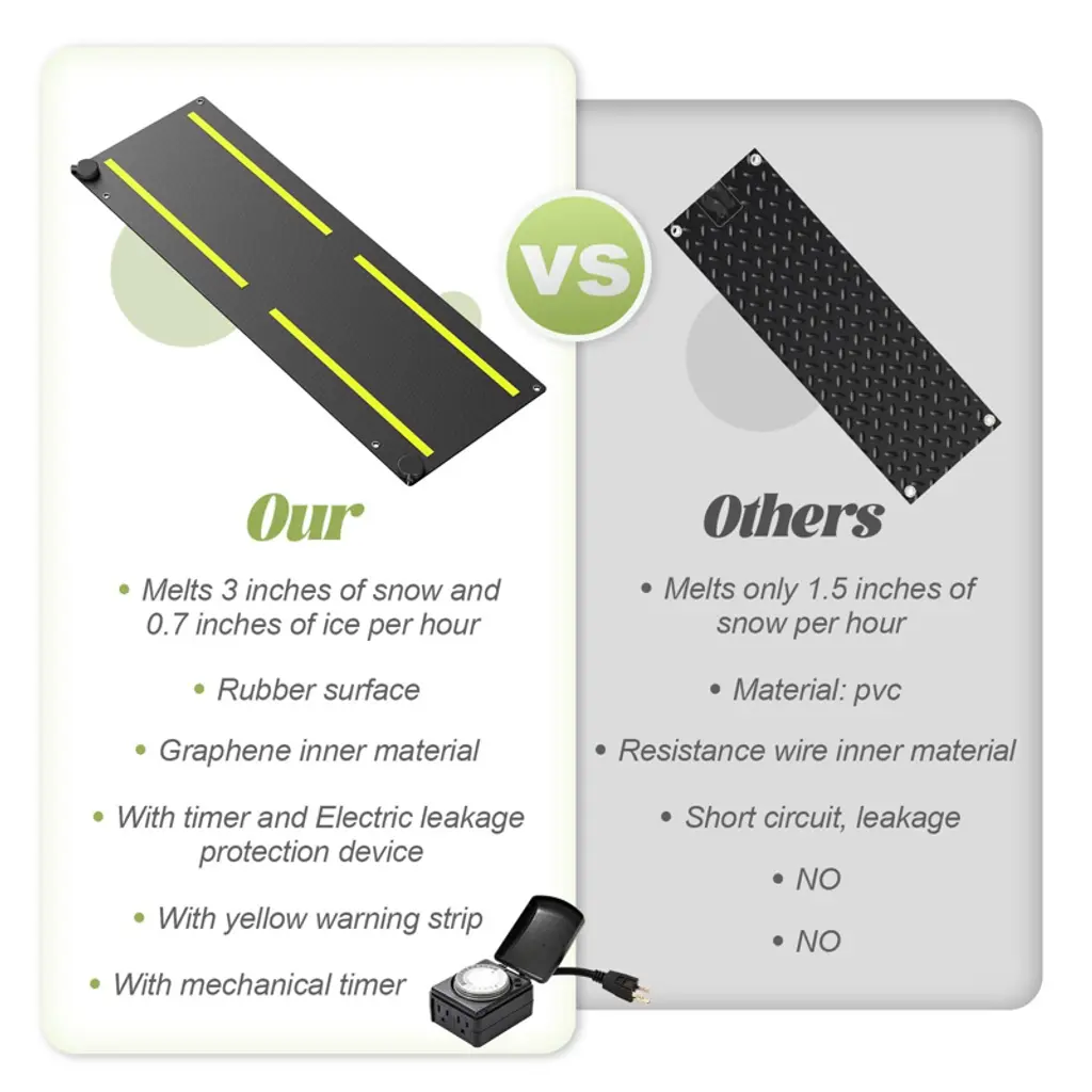 This 20 x 60 inch graphene heated outdoor mat offers a safe and efficient solution for winter snow and ice removal. Designed with advanced graphene heating technology, the mat provides rapid and stable heat, melting 2–3 inches of snow or up to 0.7 inches of ice per hour, and maintaining temperatures up to 104°F in conditions as low as -4°F. Made from durable rubber, it is wear-resistant, waterproof, and highly resistant to corrosion and UV damage, ensuring long-lasting outdoor performance. The non-slip surface and yellow warning stripes enhance walking safety, while the built-in mechanical timer and GFCI leakage protector add reliable energy efficiency and protection. With pre-drilled corner holes for secure placement and an 11.5 ft power cord, this mat can be used alone or connected with other mats for larger coverage. Perfect for walkways, stairs, porches, driveways, and roofs, it provides a practical snow-melting solution for both residential and commercial use. ·Power: 90W ± 15% ·Voltage: 120V / 60Hz ·Heating Area: 20 x 60 in ·Snow Melting Rate: 2–3 in/h ·Ice Melt Rate: 0.7 in/h ·Heating Temperature: up to 104°F ·Lowest Operating Temperature: -4°F ·Heating Sheet: Graphene ·Exterior Material: Rubber ·Thickness: 0.2 in ·Power Cord Length: 11.5 ft ·Leakage Protector: GFCI Protection ·Maximum Number of Mats in Series: 4 pcs