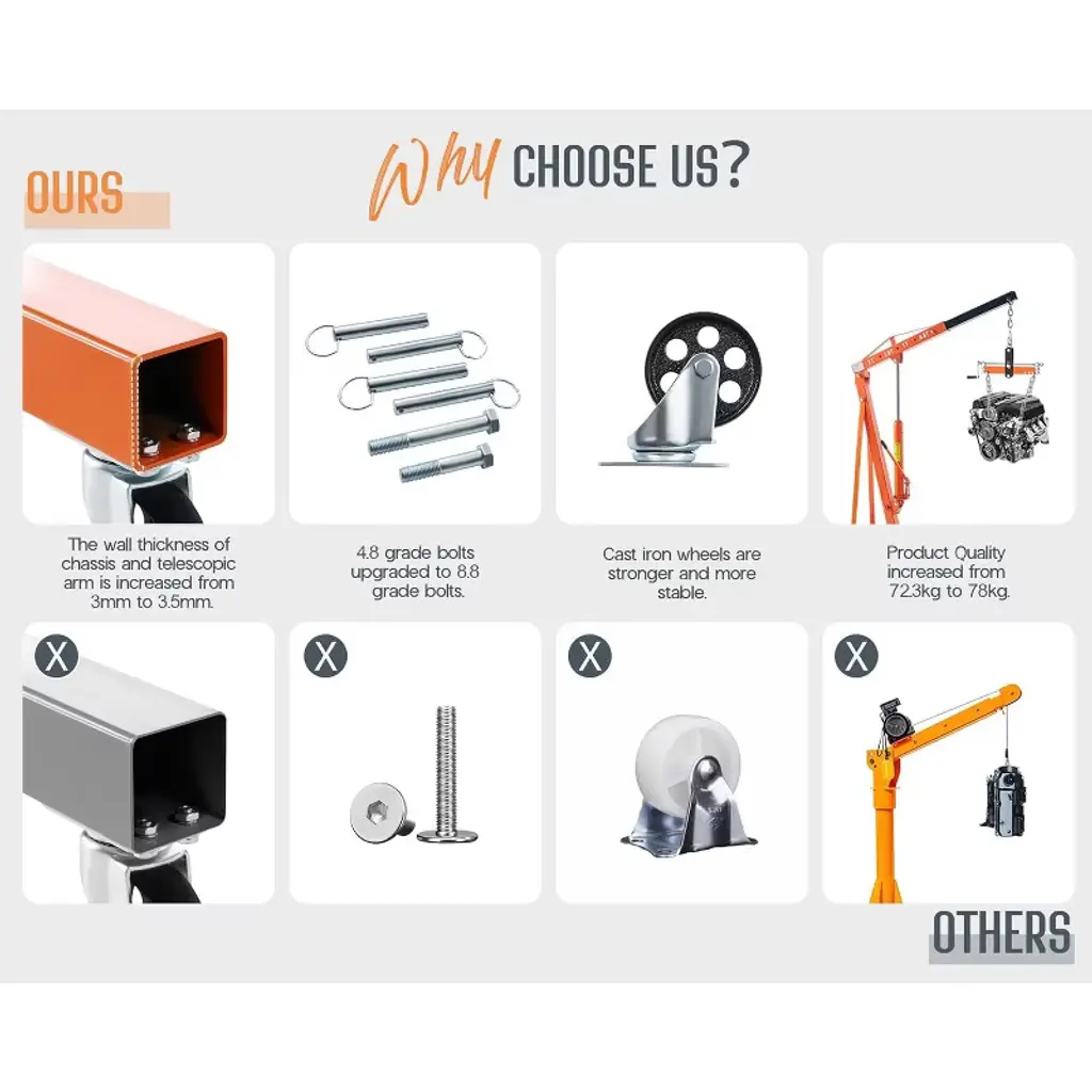 Built for heavy-duty lifting, this engine hoist features four adjustable arms and a powerful 8-ton hydraulic pump for smooth and precise height control. Its robust steel construction, reinforced with a 3.5mm thick base, telescopic arm, and high-grade bolts, ensures strength and reliability under demanding use. With a long-handle leveler and six 360° swivel cast iron wheels, the hoist offers excellent maneuverability and balance even in tight workspaces. The foldable design allows for compact storage when not in use, making it ideal for both professional and home garages. Whether you're working in automotive repair, industrial workshops, or lifting machinery, this crane delivers dependable performance and versatility.