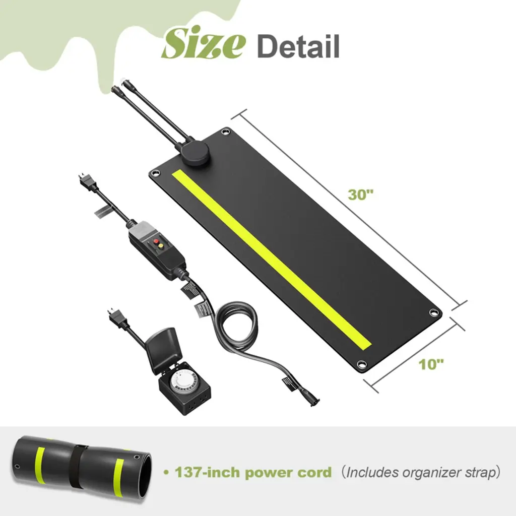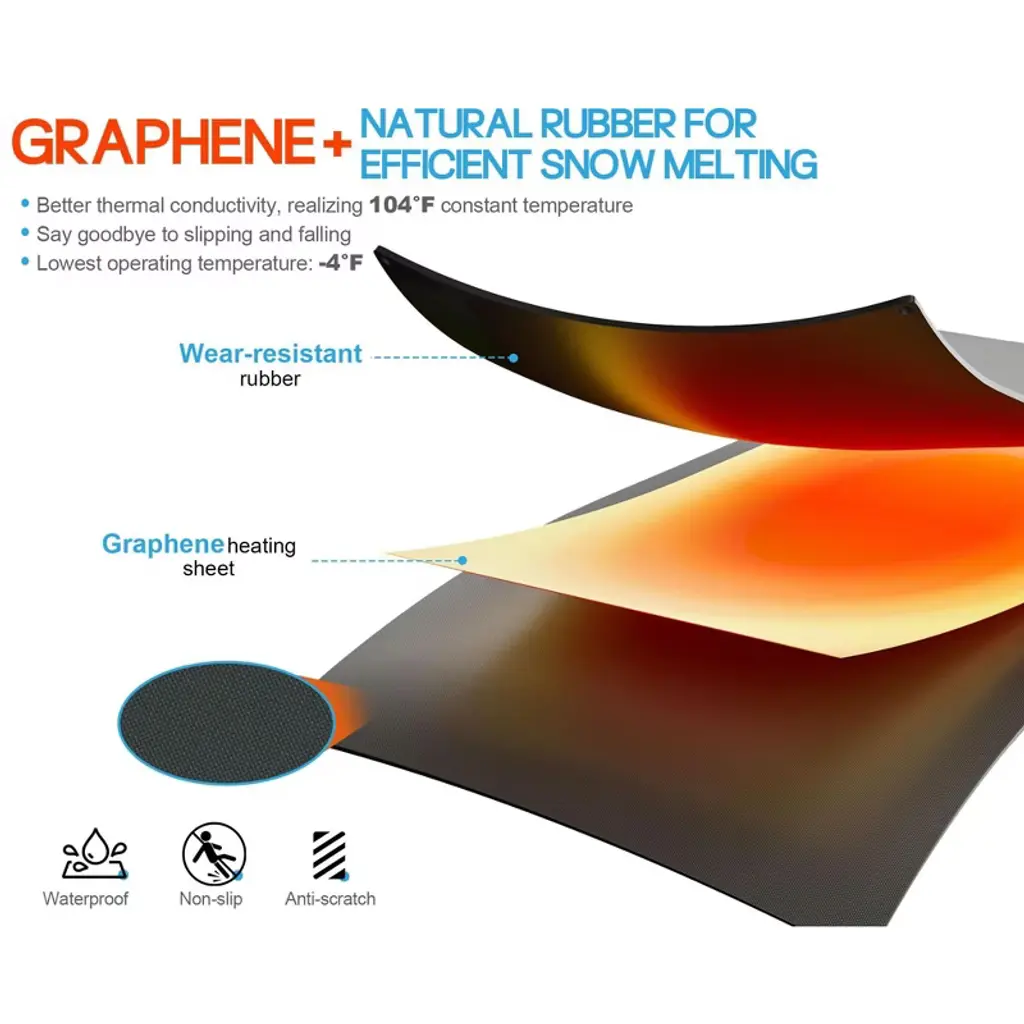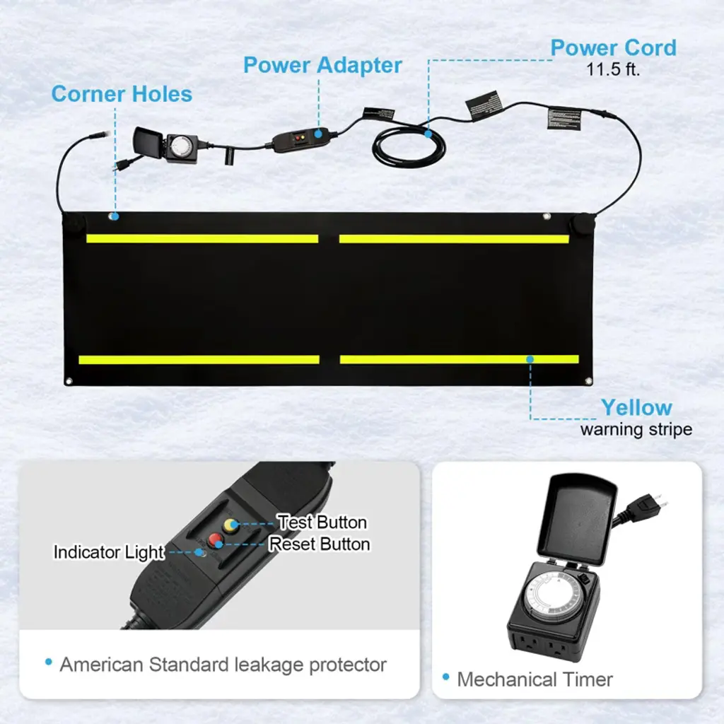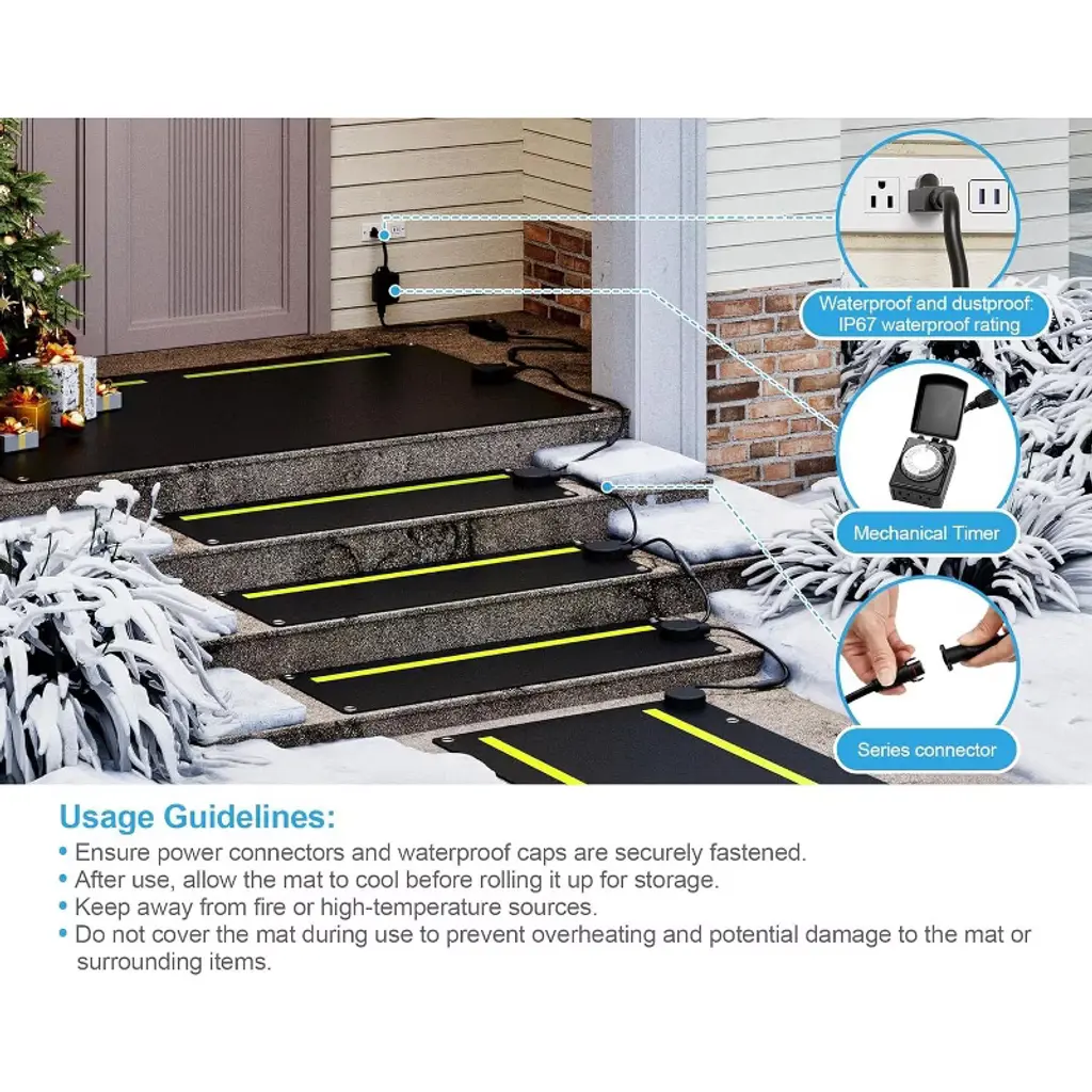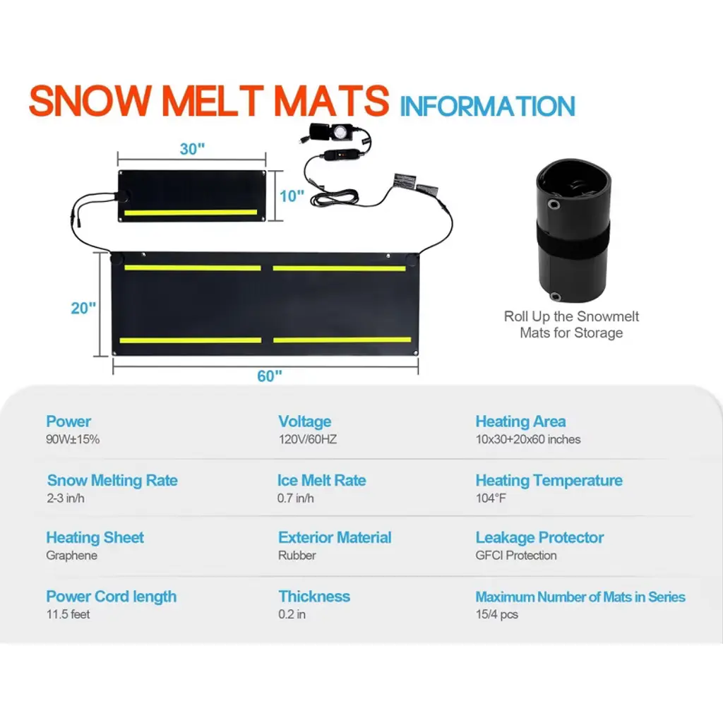This graphene heated snow melting mat set includes 2 pieces of 10x30 inches and 1 piece of 20x60 inches, designed to keep outdoor areas clear of snow and ice in winter. Made with durable rubber and advanced graphene heating sheets, the mats deliver consistent heating up to 104°F, melting 2–3 inches of snow or 0.7 inches of ice per hour, even in temperatures as low as -4°F. Featuring non-slip surfaces with high-visibility yellow warning stripes, the mats ensure safe passage on walkways, stairs, sidewalks, garages, and porches. Easy to connect and install, the mats can be used individually or in combination to expand coverage, supported by GFCI protection for safe operation. With an 11.5 ft power cord and mechanical timer, this energy-efficient system provides a reliable, convenient, and safe winter solution for both residential and commercial settings. ·Heating Area: 2 pcs 10x30 in + 1 pc 20x60 in ·Power: 90W ± 15% ·Voltage: 120V / 60Hz ·Heating Temperature: Up to 104°F (40°C) ·Snow Melting Rate: 2–3 in/h ·Ice Melting Rate: 0.7 in/h ·Heating Material: Graphene heating sheet ·Exterior Material: Rubber ·Cord Length: 11.5 ft (3.5 m) ·Thickness: 0.2 in (5 mm) ·Leakage Protection: GFCI certified ·Maximum Mats in Series: 4 pcs (not to exceed 1800W)
