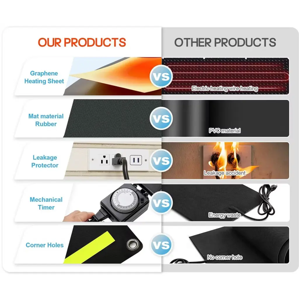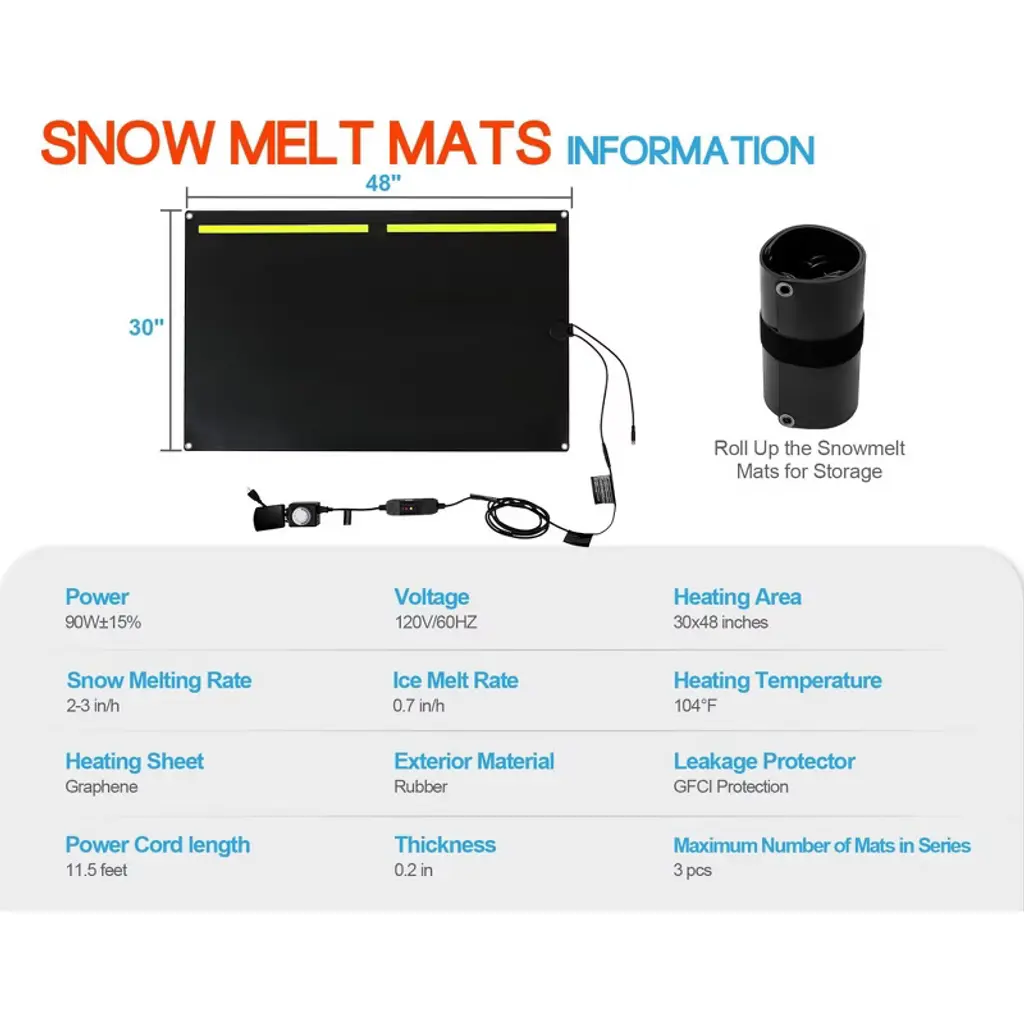 This 30 x 48 inch graphene heated outdoor mat provides a safe, efficient, and durable solution for snow and ice removal during winter. Using advanced graphene heating technology, the mat distributes heat evenly to quickly melt 2–3 inches of snow or 0.7 inches of ice per hour, with a maximum heating temperature of 104°F. The durable rubber exterior ensures slip resistance, waterproof performance, and long-lasting use, while the bright yellow warning stripes enhance visibility for added safety. Equipped with a GFCI leakage protector and an 11.5 ft power cord, this mat is designed for convenience and security. It can be used individually or connected in series with up to 3 mats, making it ideal for walkways, porches, stairs, sidewalks, garages, and even rooftops. Perfect for both residential and commercial use. ·Power: 90W ± 15% ·Voltage: 120V / 60Hz ·Heating Area: 30 x 48 inches (76 x 122 cm) ·Heating Temperature: Up to 104°F (40°C) ·Snow Melting Rate: 2–3 inches per hour ·Ice Melting Rate: 0.7 inches per hour ·Heating Element: Graphene heating sheet ·Exterior Material: Rubber ·Cord Length: 11.5 ft (3.5 m) ·Thickness: 0.2 inch (5 mm) ·Leakage Protection: GFCI Protection ·Maximum Mats in Series: 3 pcs