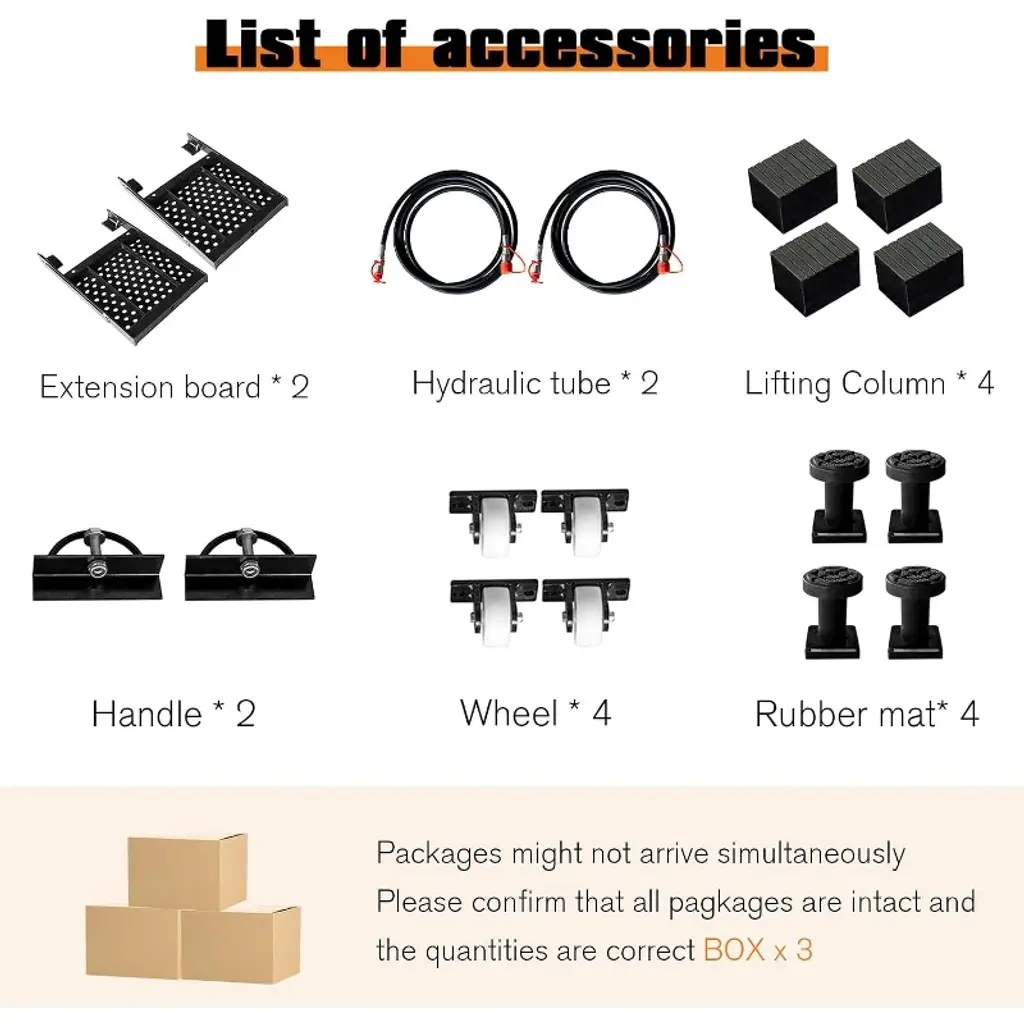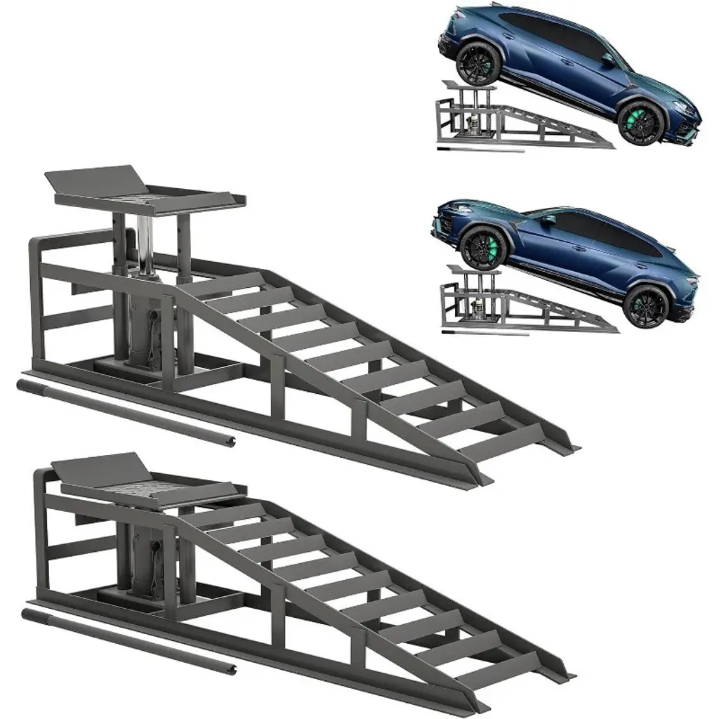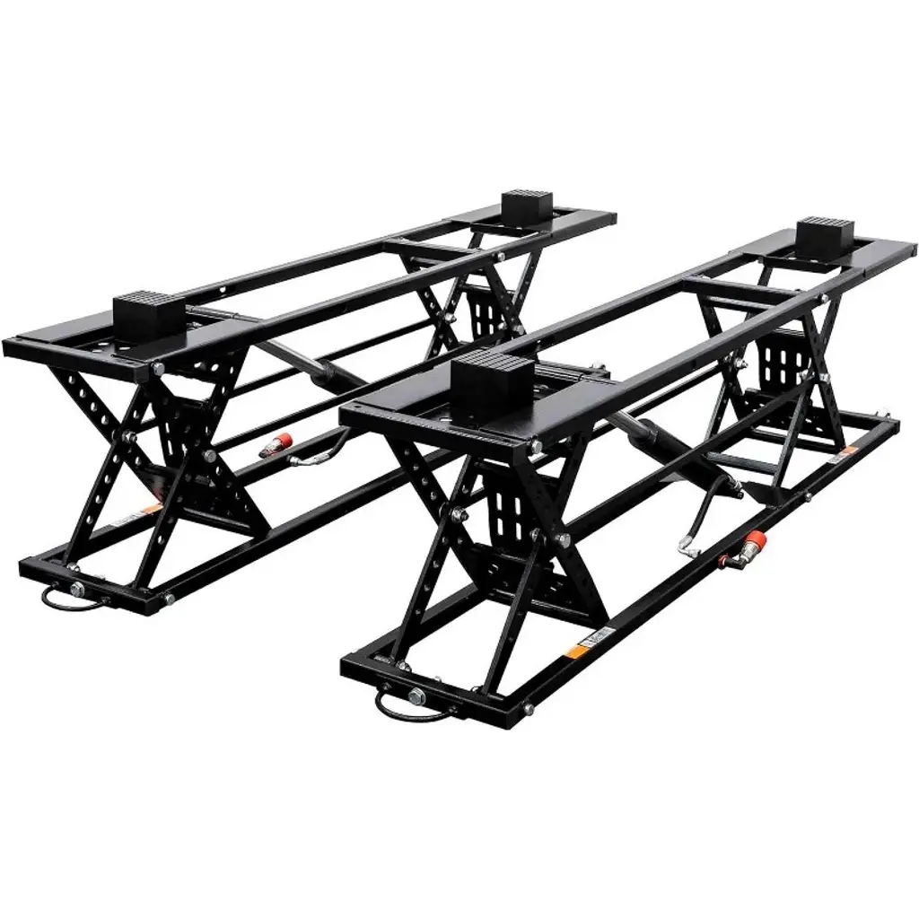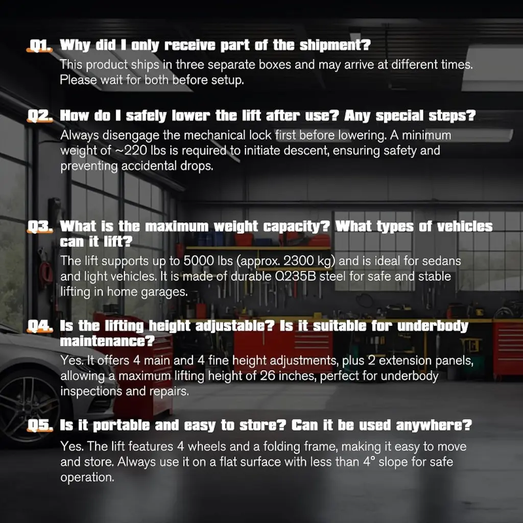 This heavy-duty vehicle lift supports up to 5000 lbs, making it ideal for a wide range of cars and light trucks. Multiple locking positions and an upgraded spring system ensure safe, smooth lifting and faster height recovery. For descending, a minimum load is required to activate the system. With flexible adjustment options and extension panels, it offers ample clearance for easy undercarriage access during repairs and inspections. Built from durable Q235B high-strength steel with anti-corrosion coating, it's designed for long-term reliability in both home garages and professional workshops. The foldable frame and built-in wheels allow easy mobility and compact storage. For safe operation, always use on a level surface and fill with No.46 hydraulic oil. Perfect for DIYers and pros alike.