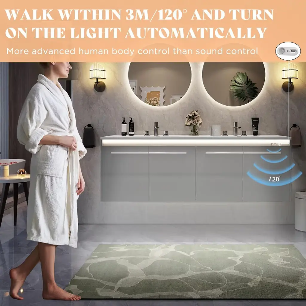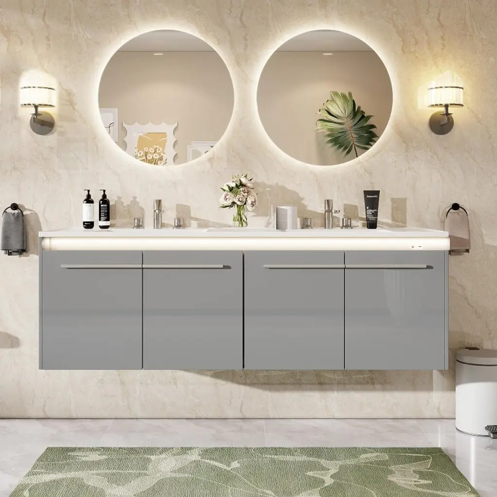Bathroom wall cabinet intelligent module can automatically turn on when you are 10ft/120° away from this bathroom furniture, and turn off after 22s without human activity The double-basin integrated large sink is easy to clean without dead corners, and the overflow port and deep basin prevent water splashing and are highly impact-resistant. Made of high-quality materials with full high-gloss design on the visible surface, minimalist silver metal handles to match any style of bathroom decoration perfectly