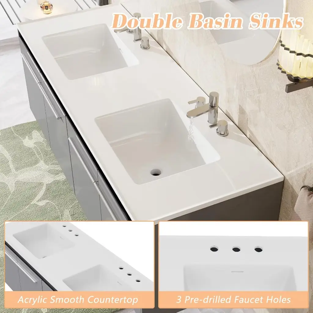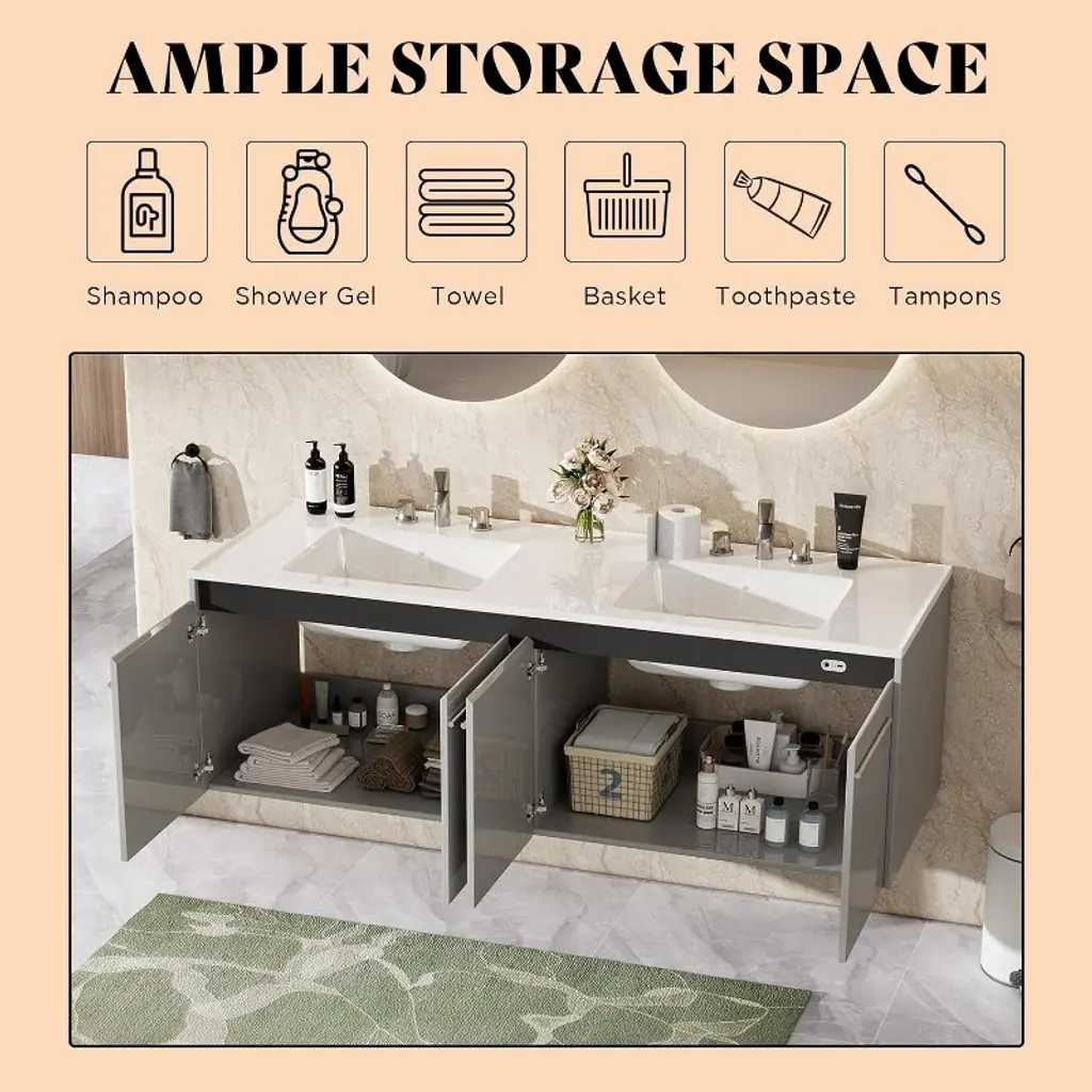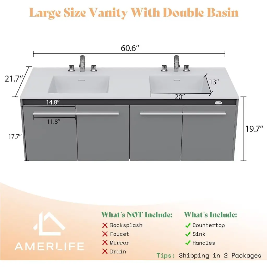 Amerlife 60" Led Floating Bathroom Double Vanity With Sink Combo, High Gloss Wall Mounted Cabinet, Gray