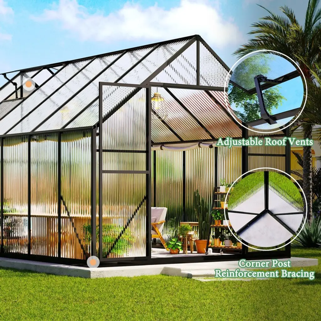 Heavy-Duty Polycarbonate Greenhouse – Perfect for Year-Round Gardening This Heavy-Duty Greenhouse Clearance is designed for outdoor use, featuring swing doors and 2 adjustable roof vents to ensure optimal airflow and temperature regulation. The double-layer polycarbonate panels block 99.9% of UV rays, protecting your plants from overexposure while allowing adequate sunlight. The 4mm polycarbonate panels offer excellent insulation, ensuring plants thrive throughout all seasons. The spacious greenhouse's aluminum frame is robust and long-lasting, while the steel foundation guarantees stability even in windy conditions. With a wind rating of 56 mph and a snow load capacity of 15.4 psf, this greenhouse endures harsh weather conditions. Perfect for gardeners or plant enthusiasts, the greenhouse for winter is designed for outdoor, backyard, and garden use.