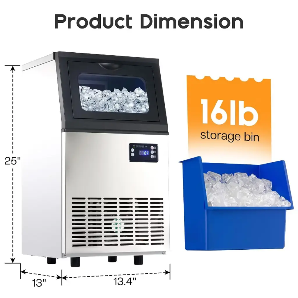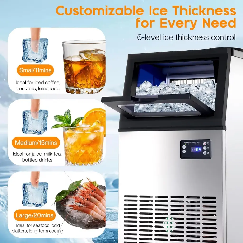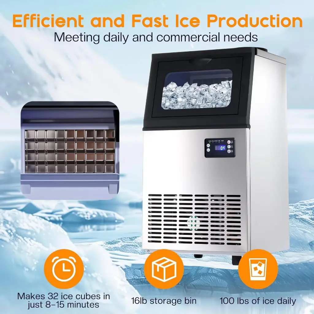 The commercial ice maker produces up to 100lbs of clear ice in 24 hours, featuring a 16lbs storage bin and a 2-way water inlet for flexible use. With fast 8–15 minute cycles and 6-level ice thickness adjustment, it ensures consistent supply for home, bar, or restaurant use. The freestanding design includes a self-cleaning system, durable construction, and an easy-to-use control panel, making it ideal for both daily and commercial applications. ·Ice Production Capacity: 100lbs/24H ·Storage Capacity: 16lbs ·Cycle Time: 8–15 minutes (32 cubes per cycle) ·Water Inlet: 2-Way (tap & bottled water) ·Control Panel: LED with 6-level ice thickness adjustment, timer, self-cleaning ·Material: Stainless steel exterior, PP interior liner ·Noise Level: ≤50dB ·Product Dimensions: 13.4"D × 13"W × 25"H ·Net Weight: 33.5 lbs ·Power: 187W