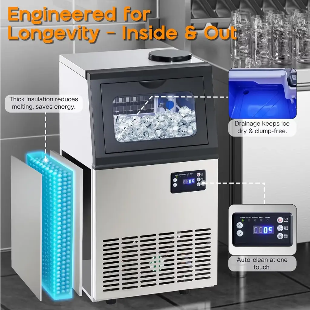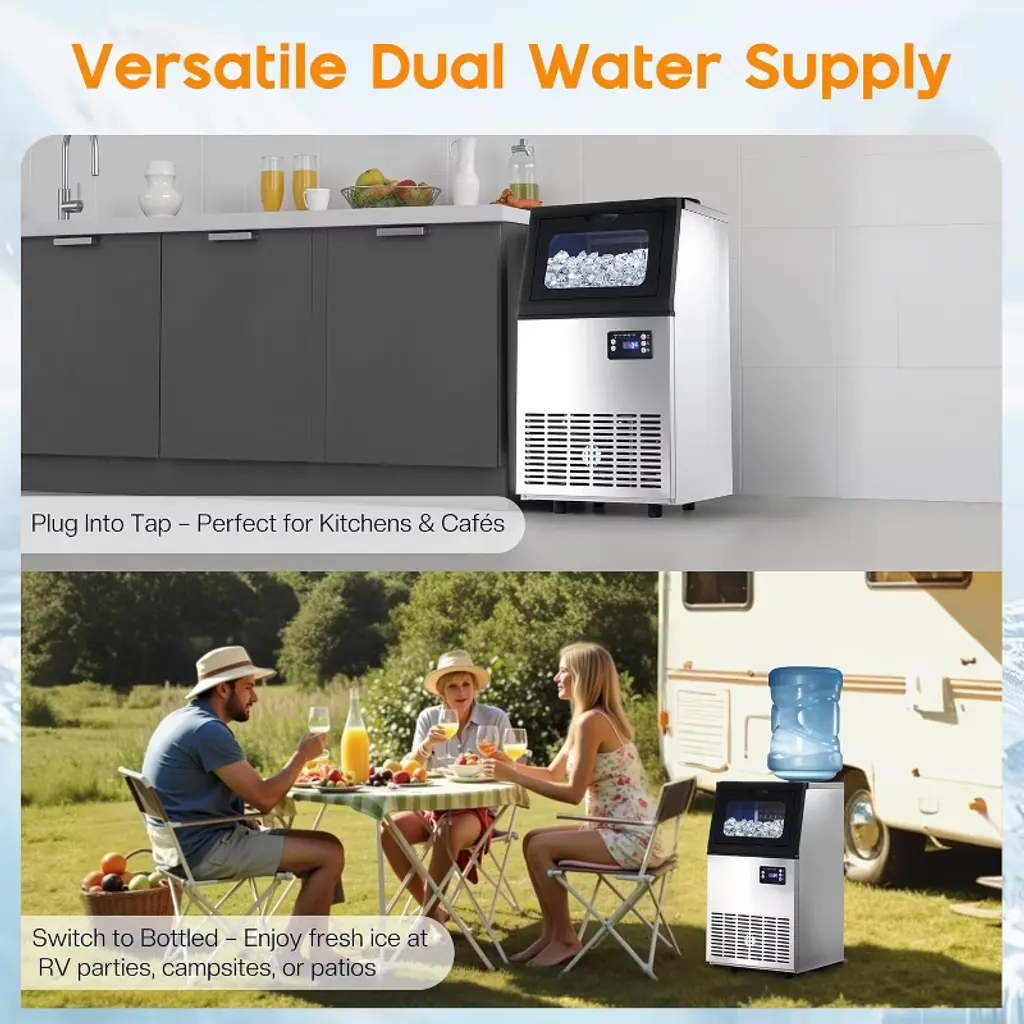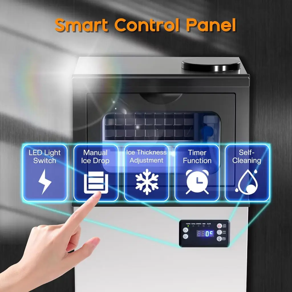 The commercial ice maker produces up to 100lbs of clear ice in 24 hours, featuring a 16lbs storage bin and a 2-way water inlet for flexible use. With fast 8–15 minute cycles and 6-level ice thickness adjustment, it ensures consistent supply for home, bar, or restaurant use. The freestanding design includes a self-cleaning system, durable construction, and an easy-to-use control panel, making it ideal for both daily and commercial applications. ·Ice Production Capacity: 100lbs/24H ·Storage Capacity: 16lbs ·Cycle Time: 8–15 minutes (32 cubes per cycle) ·Water Inlet: 2-Way (tap & bottled water) ·Control Panel: LED with 6-level ice thickness adjustment, timer, self-cleaning ·Material: Stainless steel exterior, PP interior liner ·Noise Level: ≤50dB ·Product Dimensions: 13.4"D × 13"W × 25"H ·Net Weight: 33.5 lbs ·Power: 187W