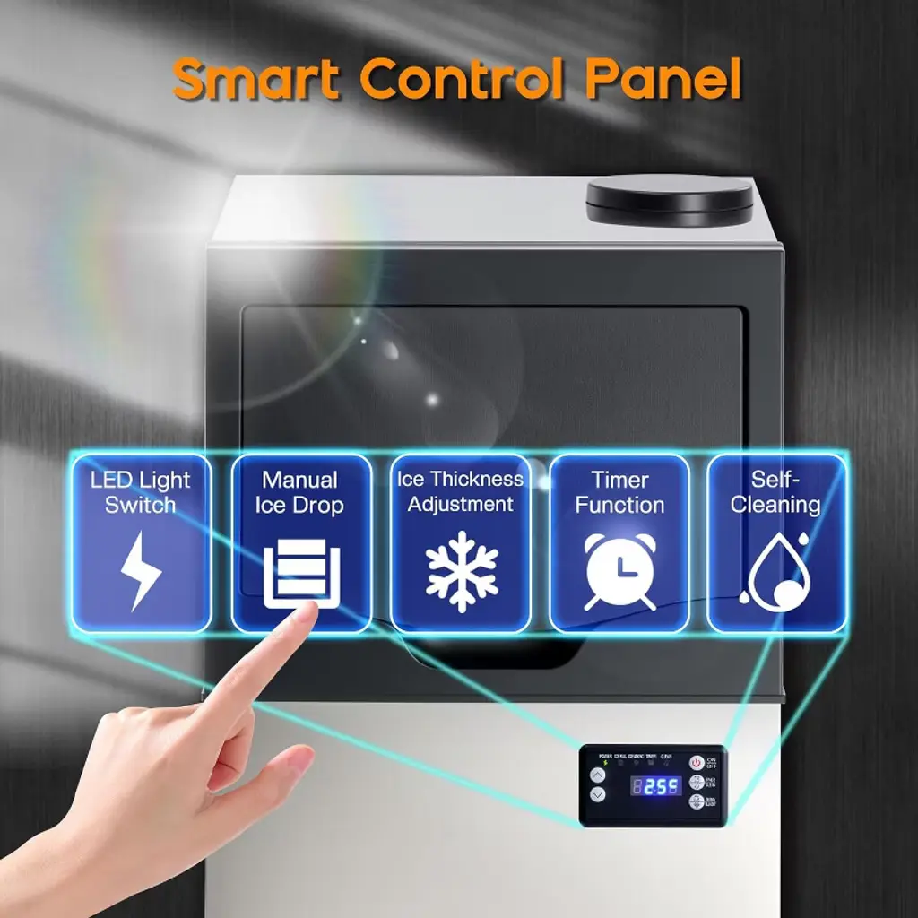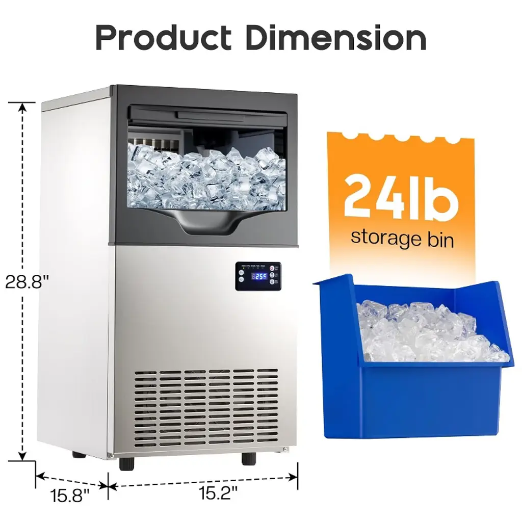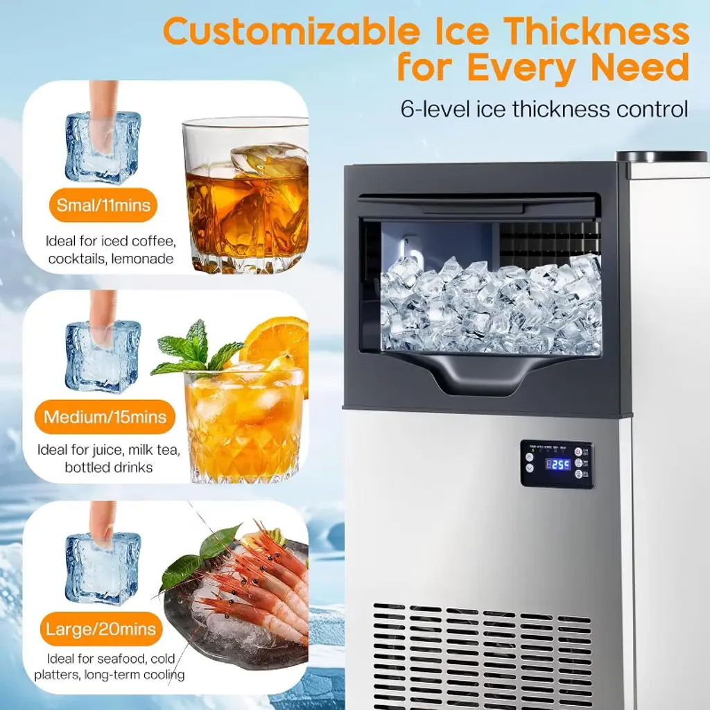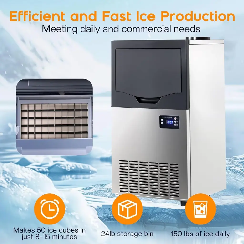 This commercial ice maker is designed for both home and business use, offering reliable ice production with advanced features. With a capacity of up to 150 lbs of ice per day and a 24 lbs storage bin, it provides a steady supply of crystal-clear cubes for restaurants, bars, cafes, and family gatherings. The dual water inlet system supports both tap and bottled water, ensuring flexibility in different environments. Its smart control panel allows real-time monitoring, 6-level ice thickness adjustment, timer settings, and one-touch self-cleaning for effortless operation. The stainless-steel exterior ensures durability, while the food-grade liner keeps ice pure, safe, and odor-free. Compact yet powerful, this freestanding machine is perfect for kitchens, commercial venues, and outdoor events. ·Ice Production Capacity: 150 lbs / 24 hours ·Ice Storage Capacity: 24 lbs ·Cycle Time: 8–15 minutes per 50 cubes ·Water Supply: Tap water or bottled water (dual inlet system) ·Control System: Smart digital panel with ice thickness adjustment & timer ·Self-Cleaning Function: One-touch automatic cleaning ·Exterior Material: Stainless steel ·Interior Material: Food-grade liner (PP) ·Product Dimensions: 15.7"D × 15.2"W × 28.7"H ·Net Weight: 45.9 lbs ·Noise Level: ≤ 50 dB ·Power Consumption: 255 watts